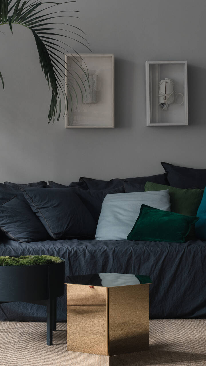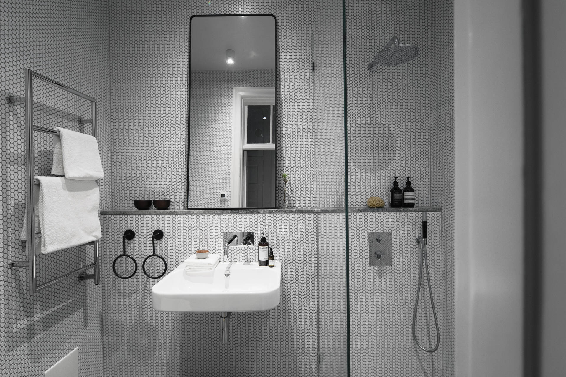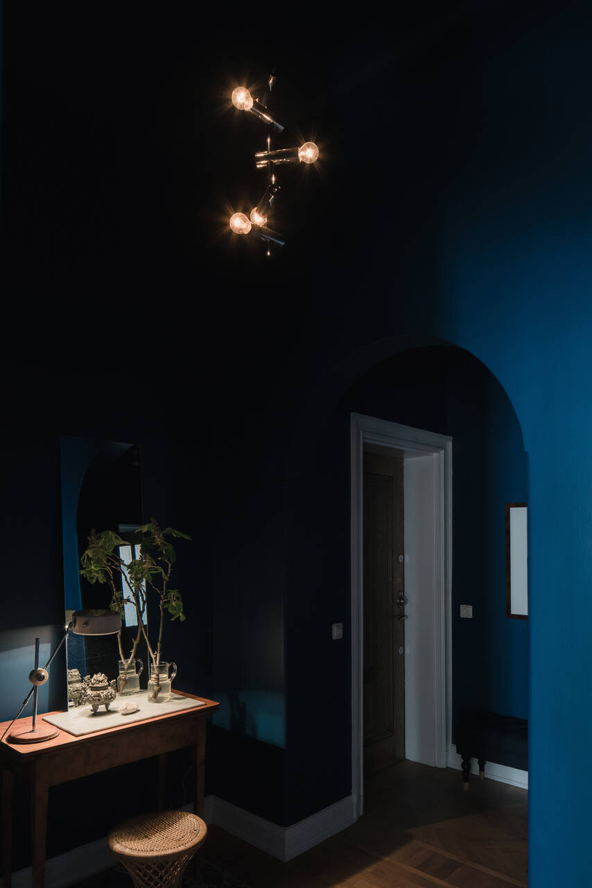 Välkomnande hall i mörkt blå skala välkomnar och erbjuder såväl avhängning som sittplats. I anslutning bjuds wc med inbyggd lösning för tvättpelare och förvaring. Materialvalen består av en härlig mix med golv i kolmårdsmarmor mot grafiskt kaklade väggar och väl valda inredningsdetaljer.