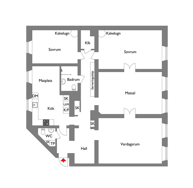 En serveringsgång i våningens mitt knyter samman hemmets funktioner och erbjuder samtidigt förvaring, bl a i form av stor klädkammare. Härifrån nås även badrum med dusch i samma härliga utförande som wc.