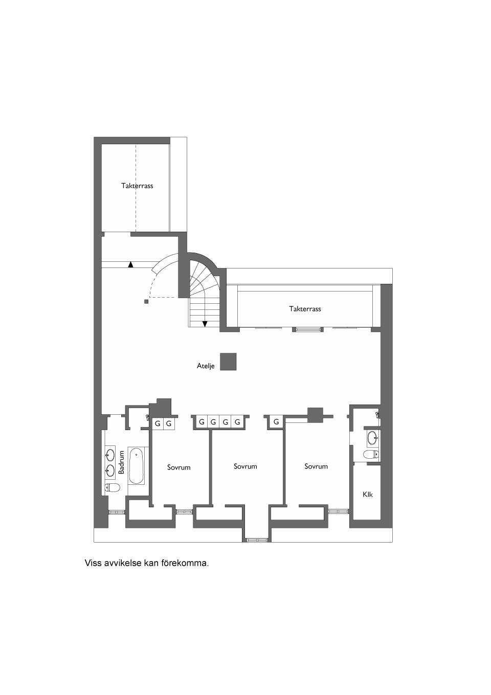 På övervåningen en trappa upp har råvindskänslan medvetet bevarats med grovt golvtegel mot originalträ i taket. Här återfinns en cental atelje med stort bord för mysiga middagar eller arbete hemifrån och inbjudande vinkel med soffgrupp. Mot innergården vetter två stora takterrasser som skänker en härlig öppenhet i våningsplanet där sol bjuds i tre väderstreck. I fil ligger tre fina sovrum med bad- och duschrum på respektive flank. Välkommen till ett fulländat hem av internationell klass i magnifik sekelskiftesfastighet på Wallingatan.