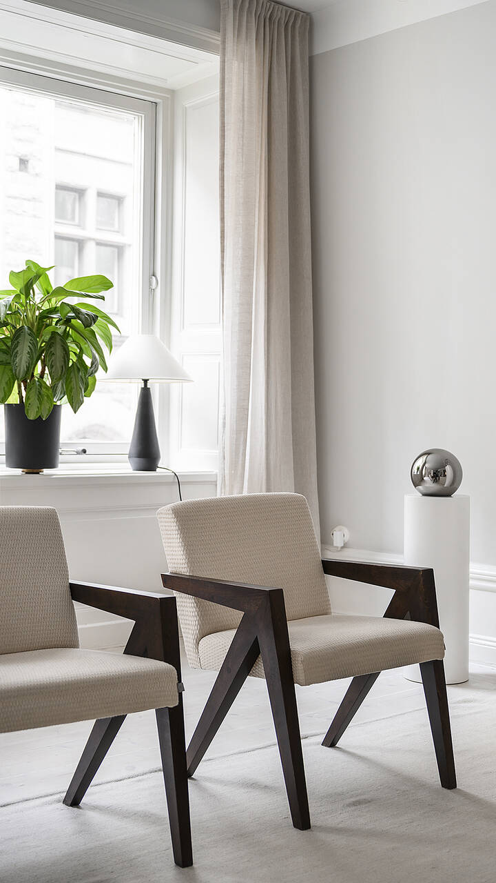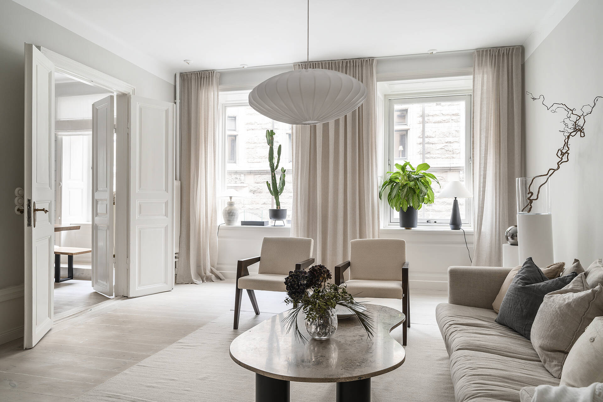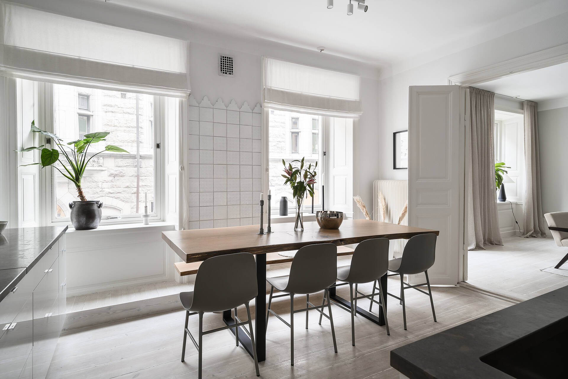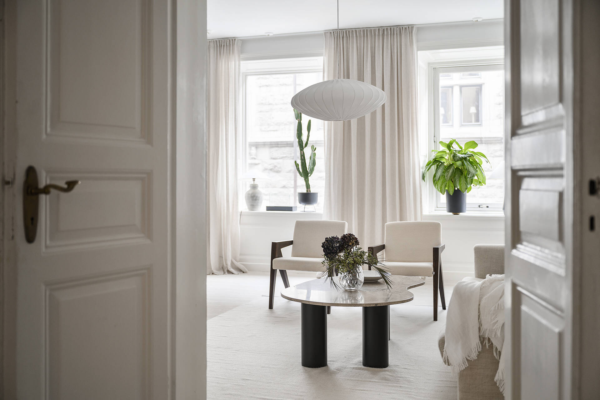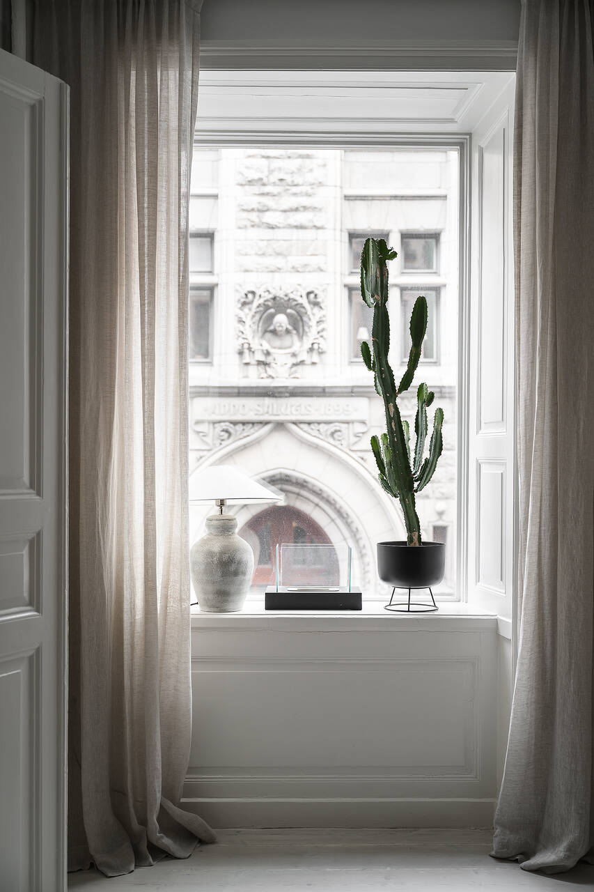 Sällskapsrum med stora fönster som ger härligt ljusinsläpp, vitbetsade furutiljor och högt i tak. Utsikt över gatan och Regeringsgatan 80, ett vackert hus ritat av Isak Gustaf Clason och Bror Almquist uppfört 1899, ursprungligen tänkt som församlingshem.