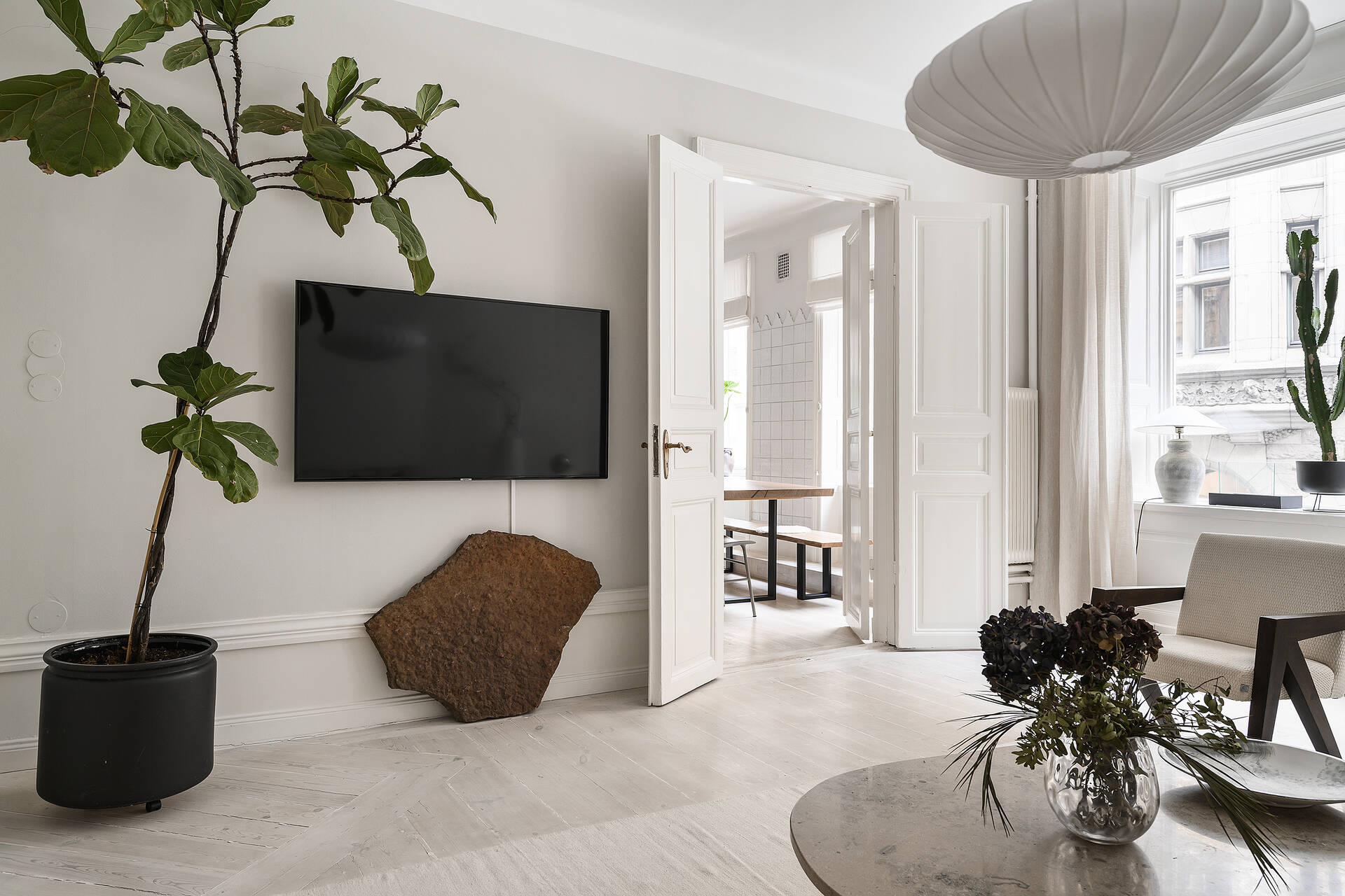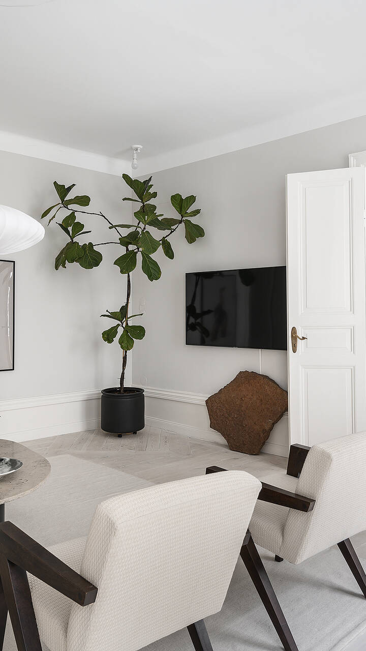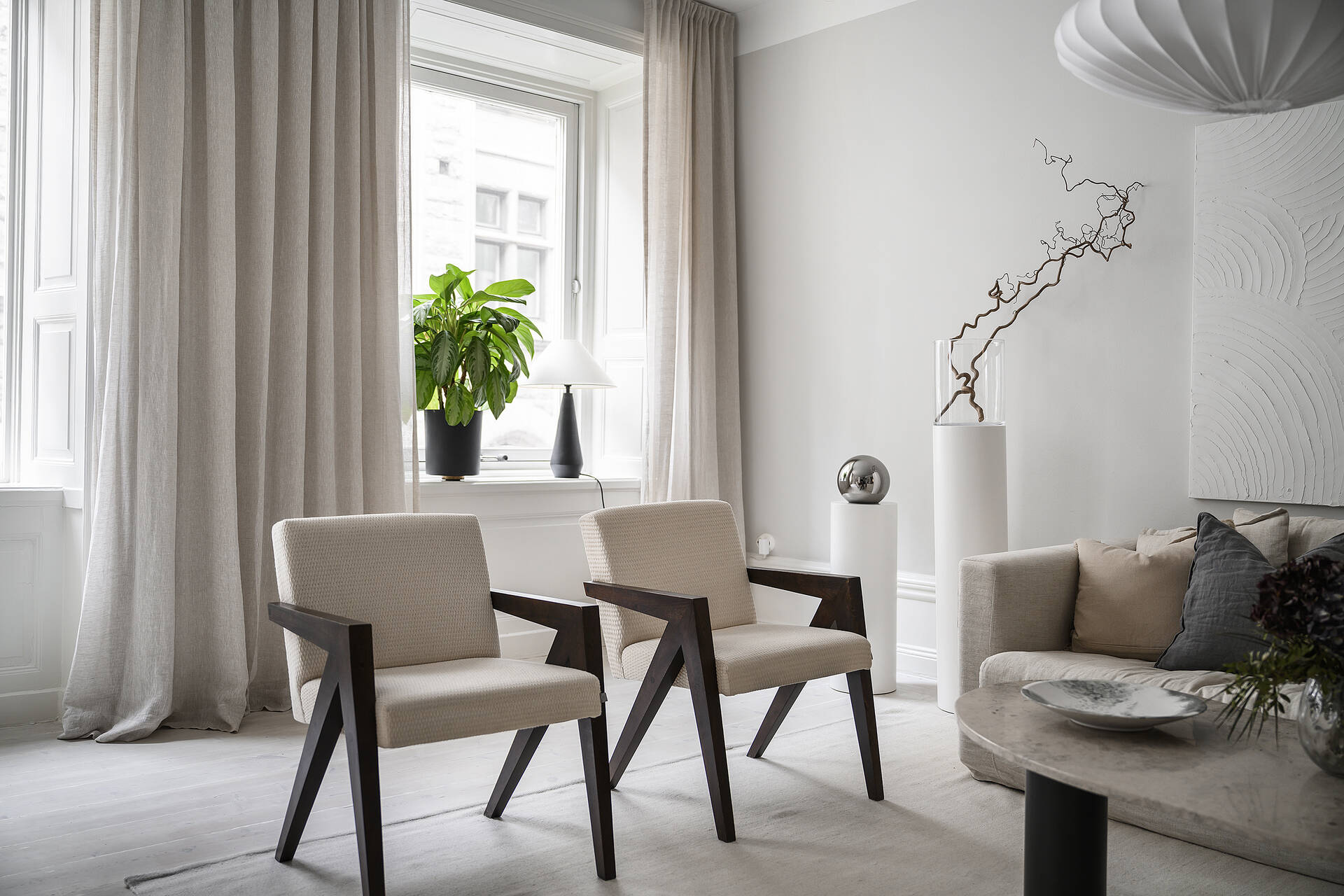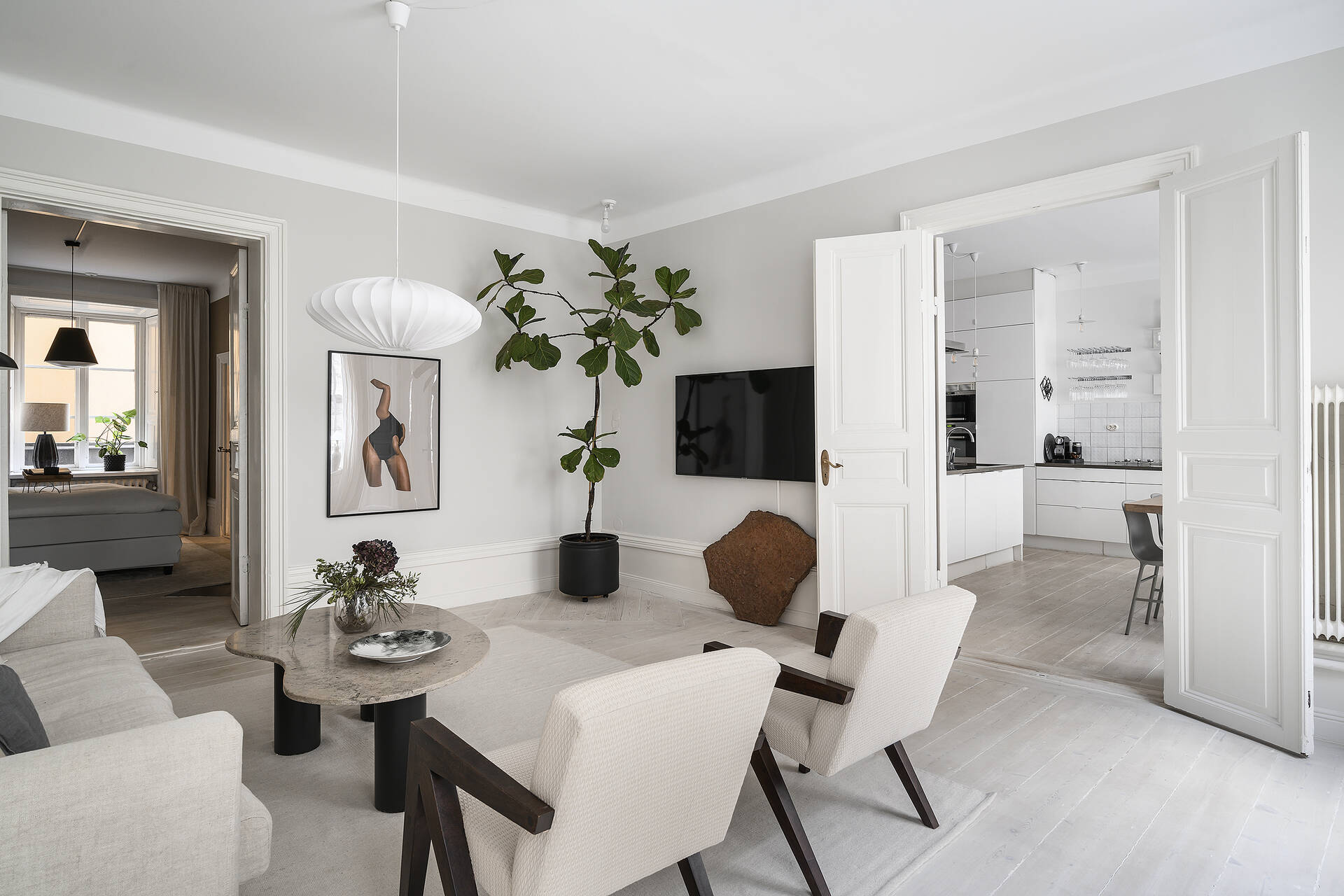 Sällskapsrum med stora fönster som ger härligt ljusinsläpp, vitbetsade furutiljor och högt i tak. Utsikt över gatan och Regeringsgatan 80, ett vackert hus ritat av Isak Gustaf Clason och Bror Almquist uppfört 1899, ursprungligen tänkt som församlingshem.
