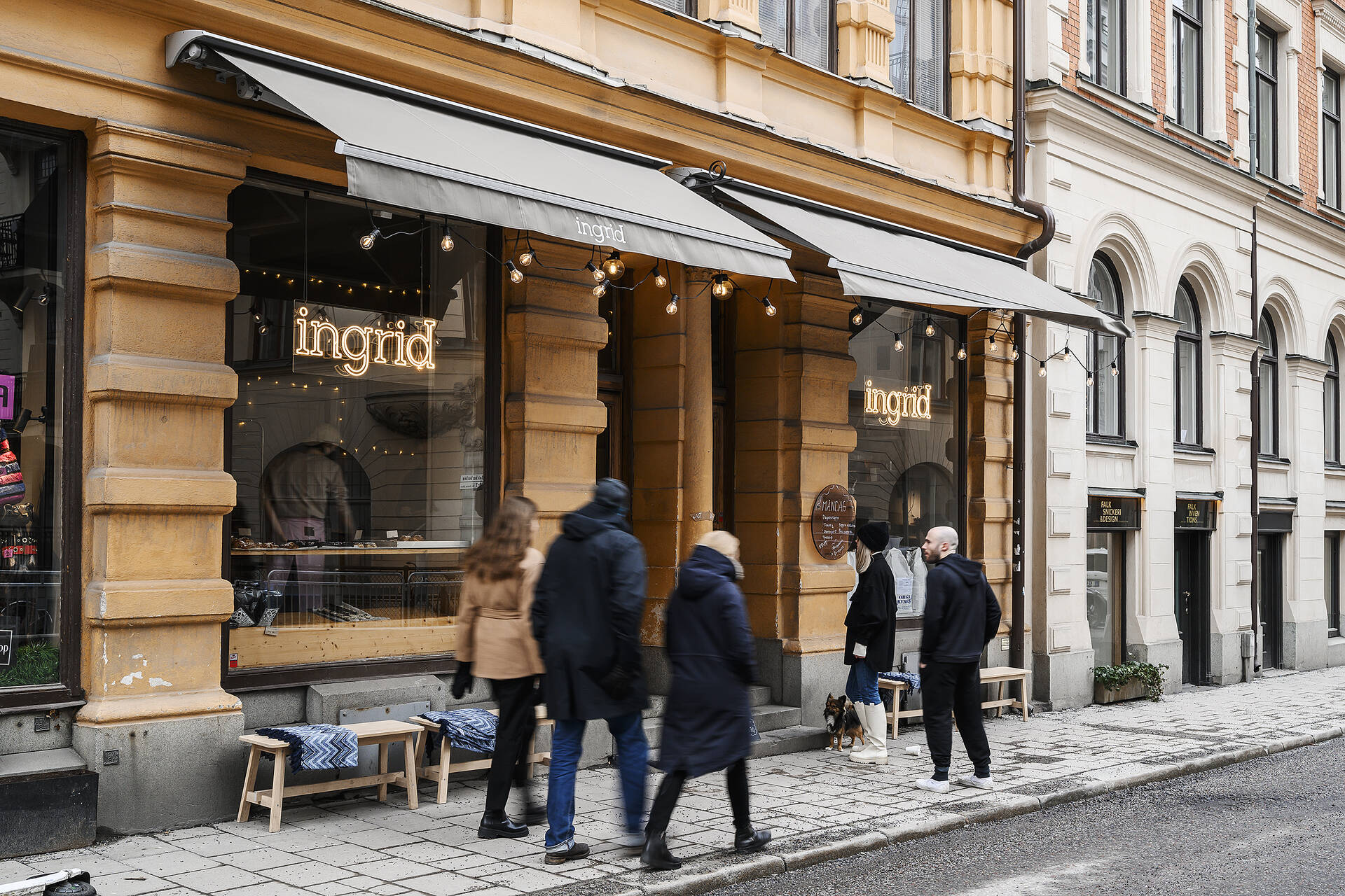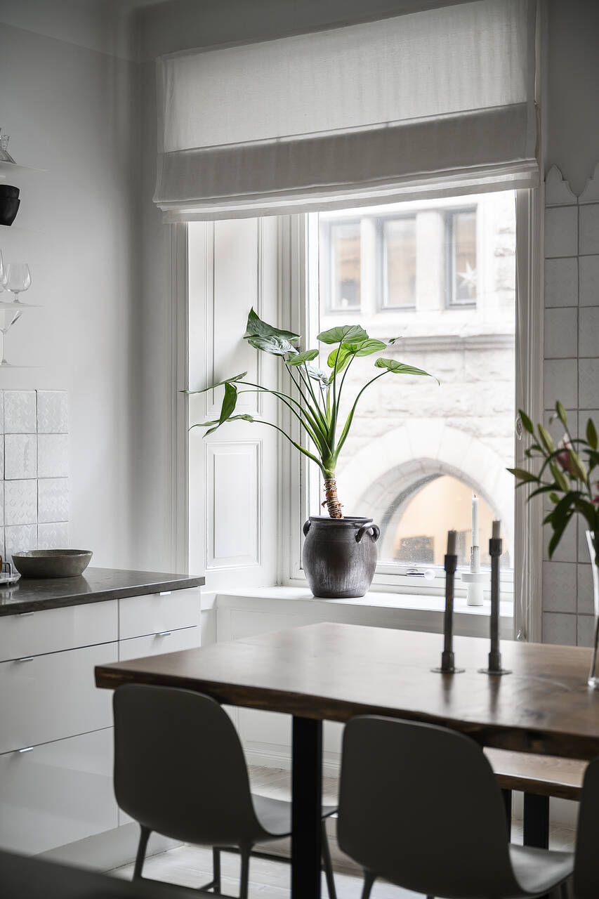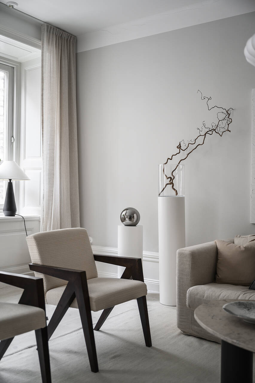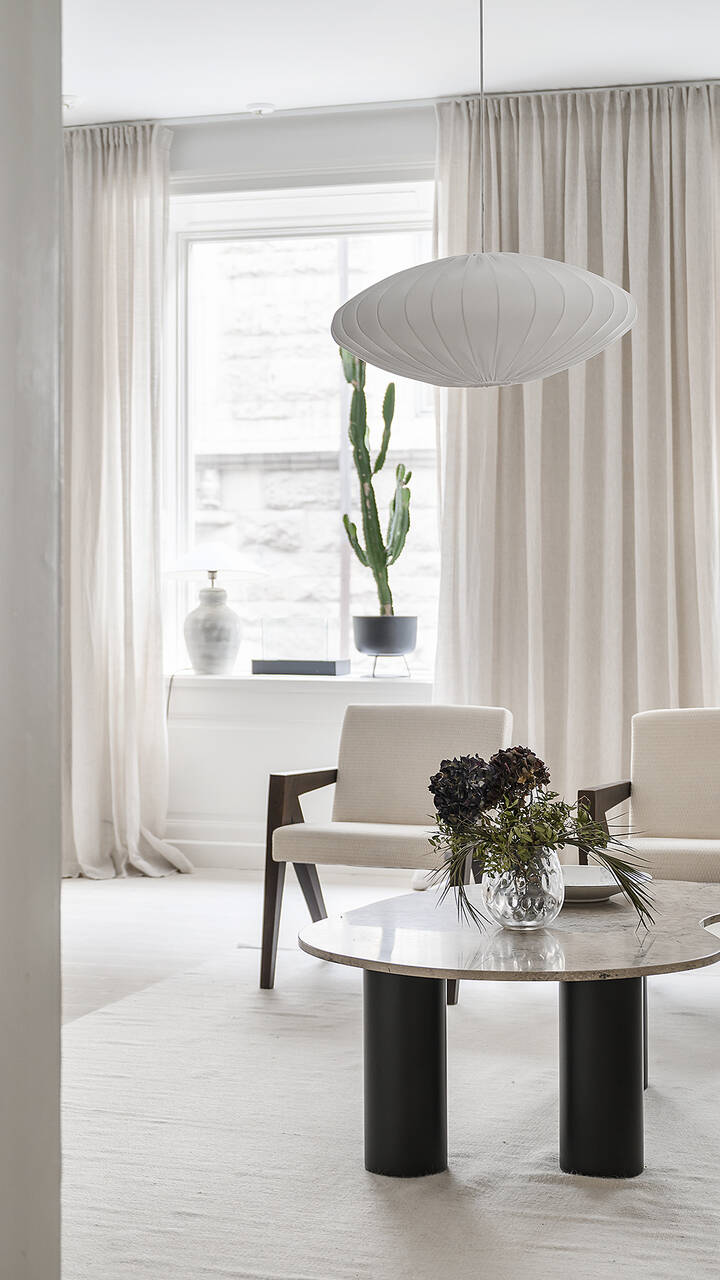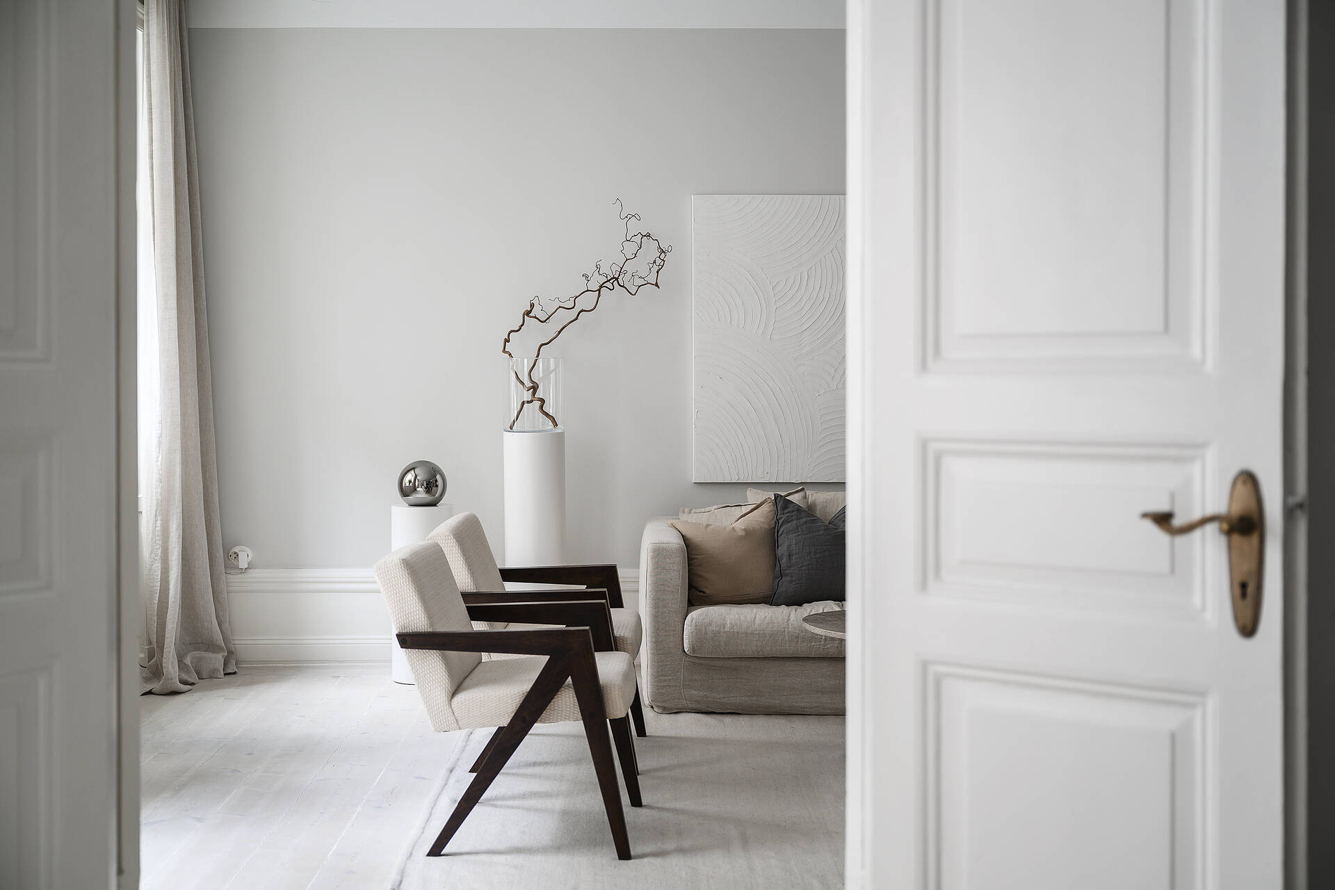 Sällskapsrum med stora fönster som ger härligt ljusinsläpp, vitbetsade furutiljor och högt i tak. Utsikt över gatan och Regeringsgatan 80, ett vackert hus ritat av Isak Gustaf Clason och Bror Almquist uppfört 1899, ursprungligen tänkt som församlingshem.