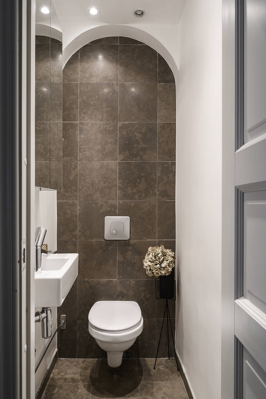 Gästtoalett med handfat och vägghängd wc. Kalksten på vägg och golv.