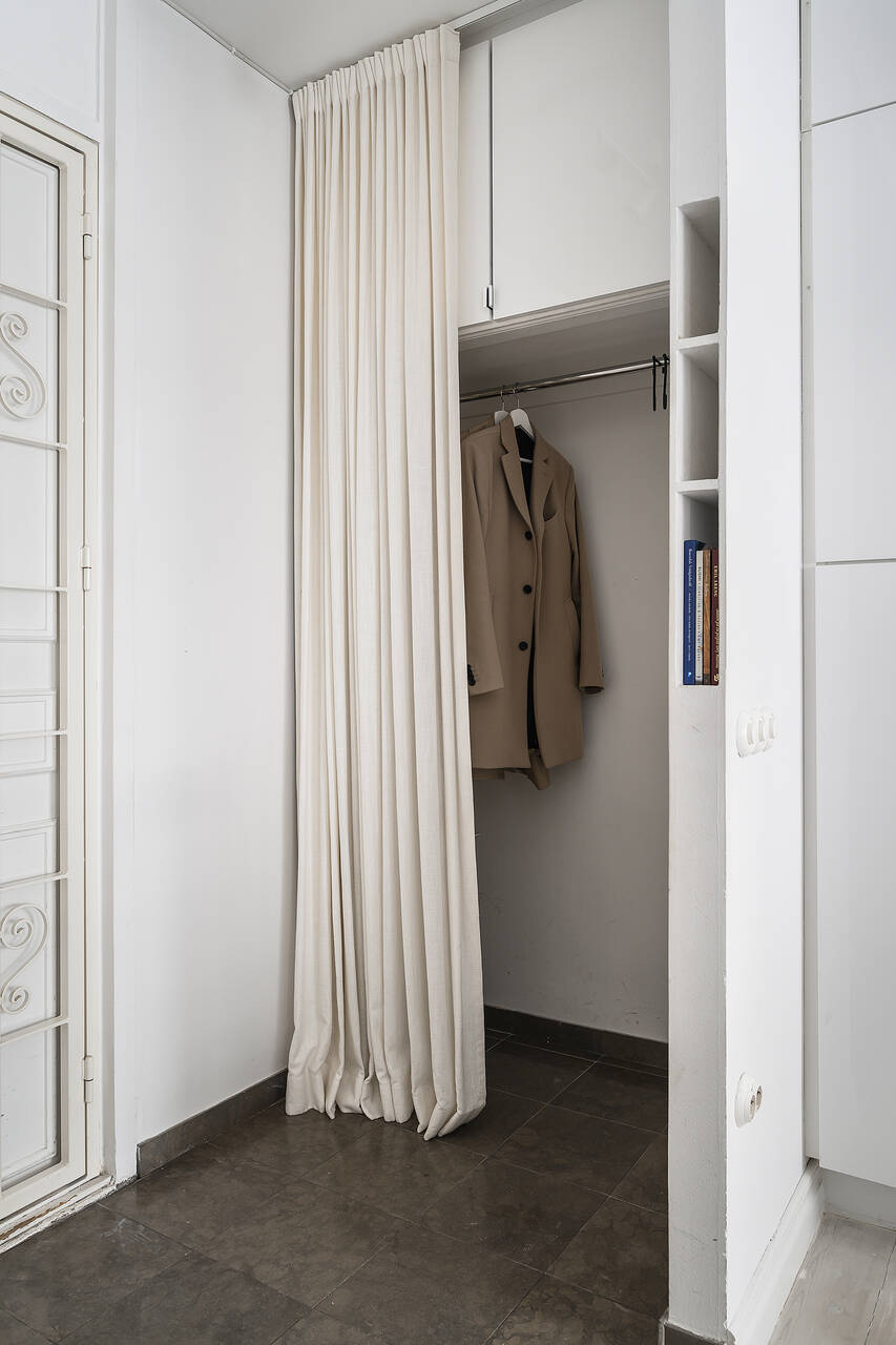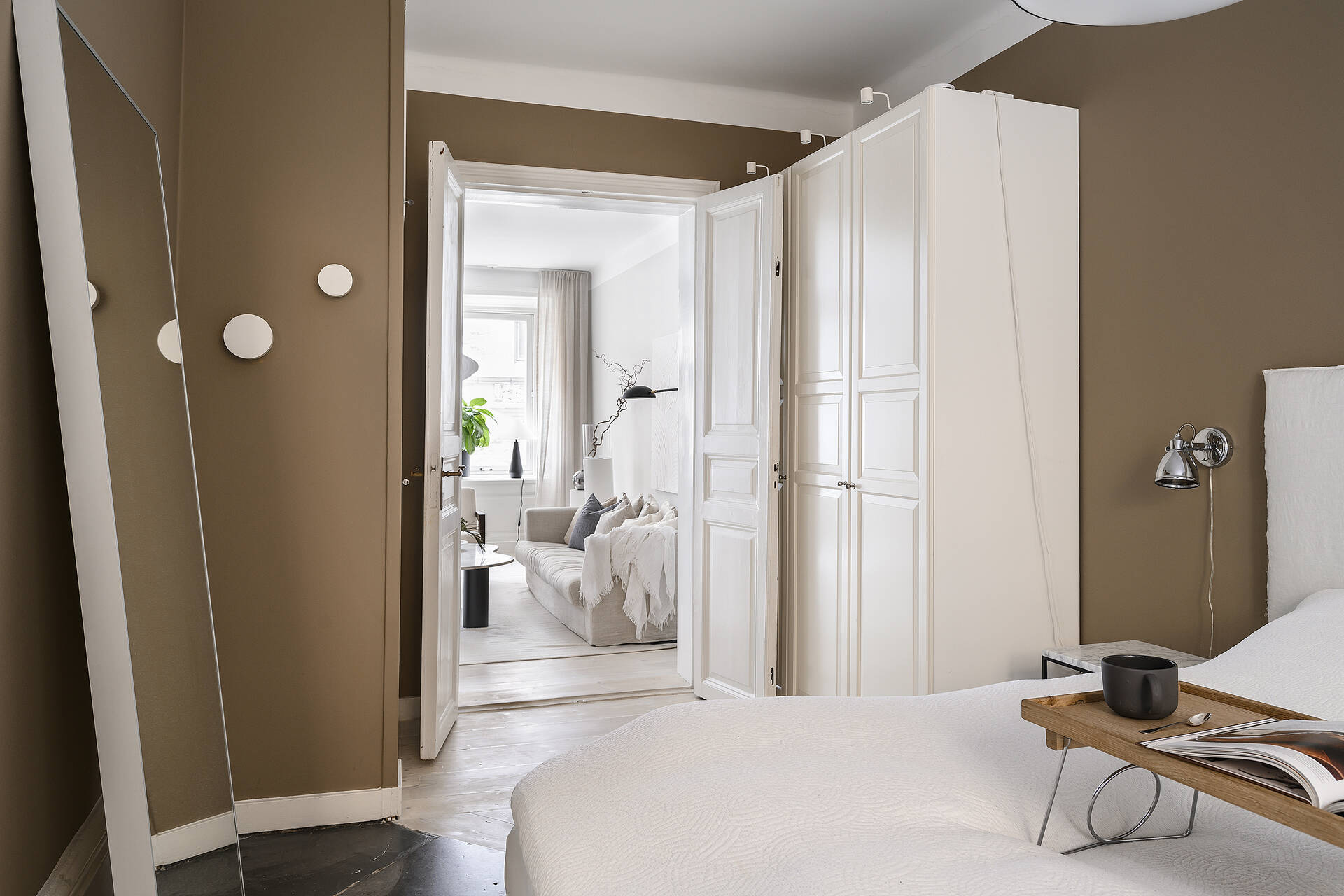 Sovrum mot gården med garderober. Djup fönsternisch med inbyggda fönsterluckor i original.