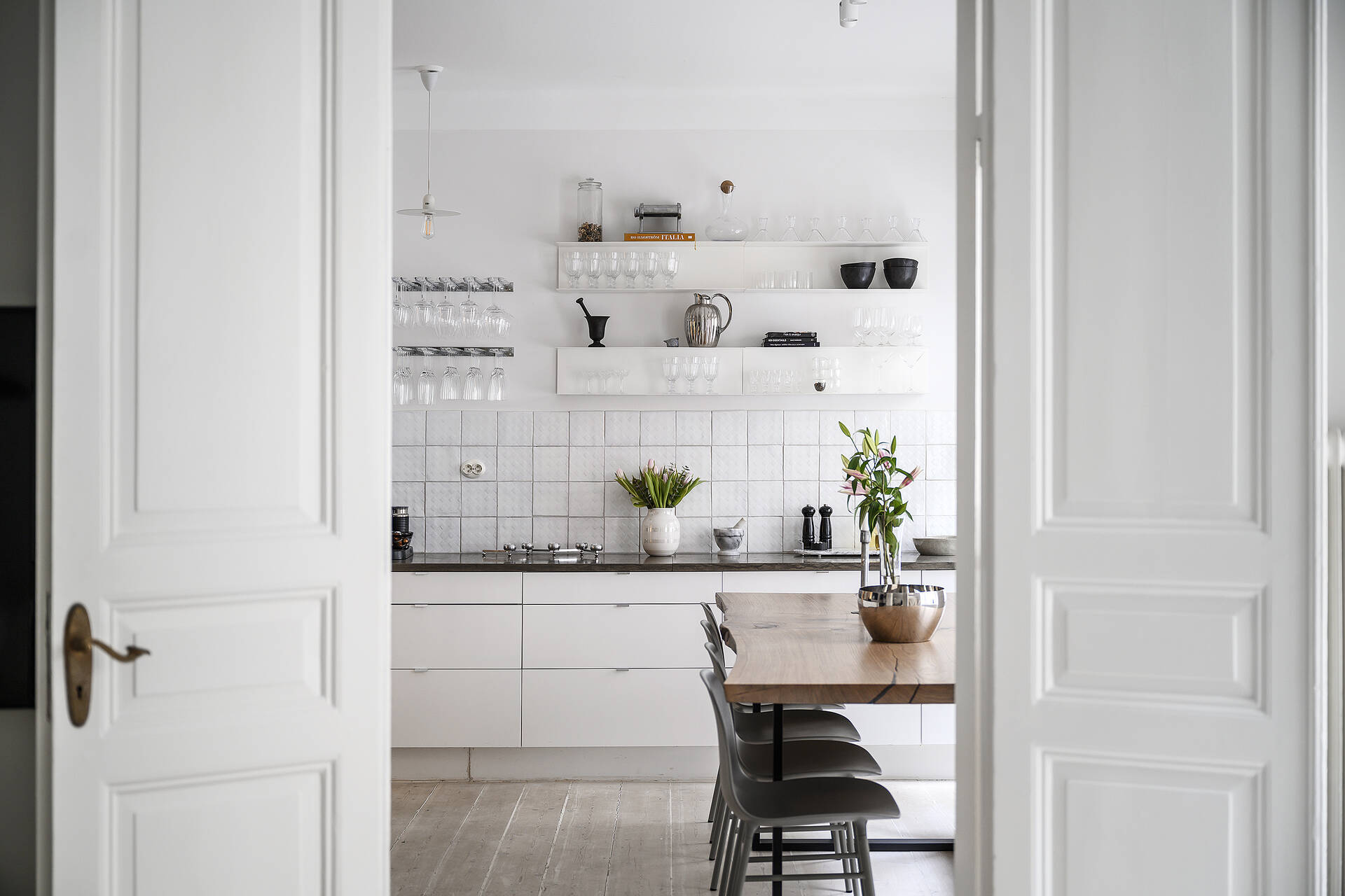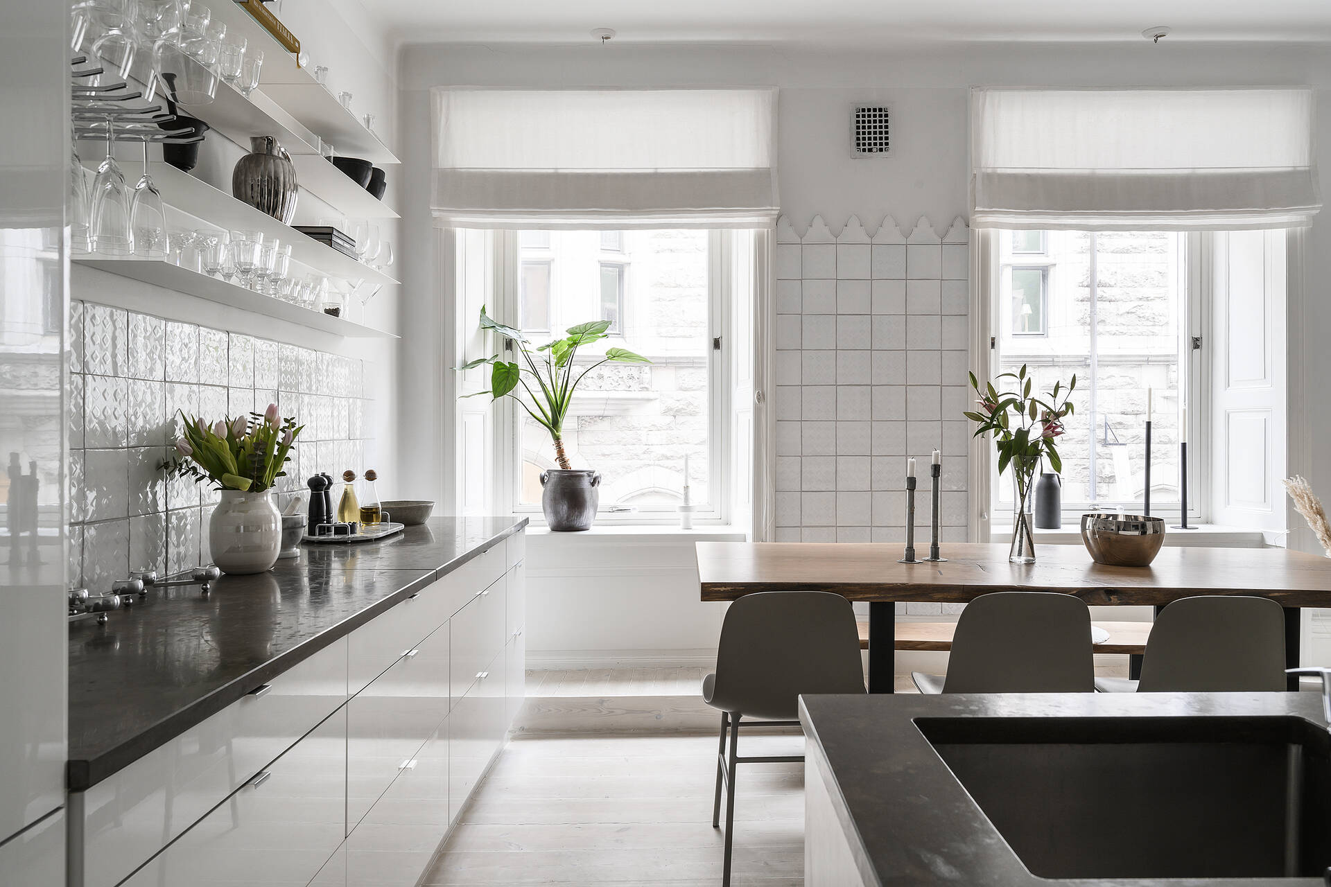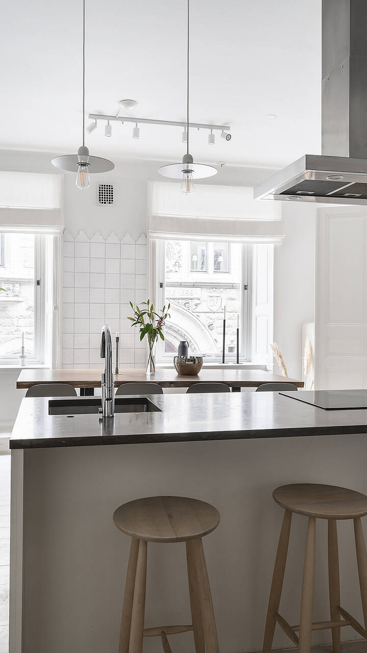 Kök och matplats i öppen planlösning. Släta vita skåp och bänkskivor i Gotländsk kalksten. Diskmaskin, mikro och kyl/frys från Ikea.