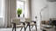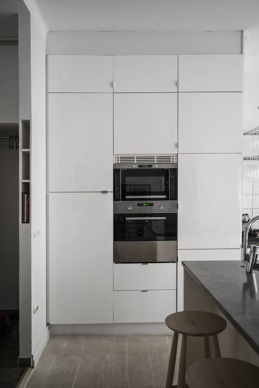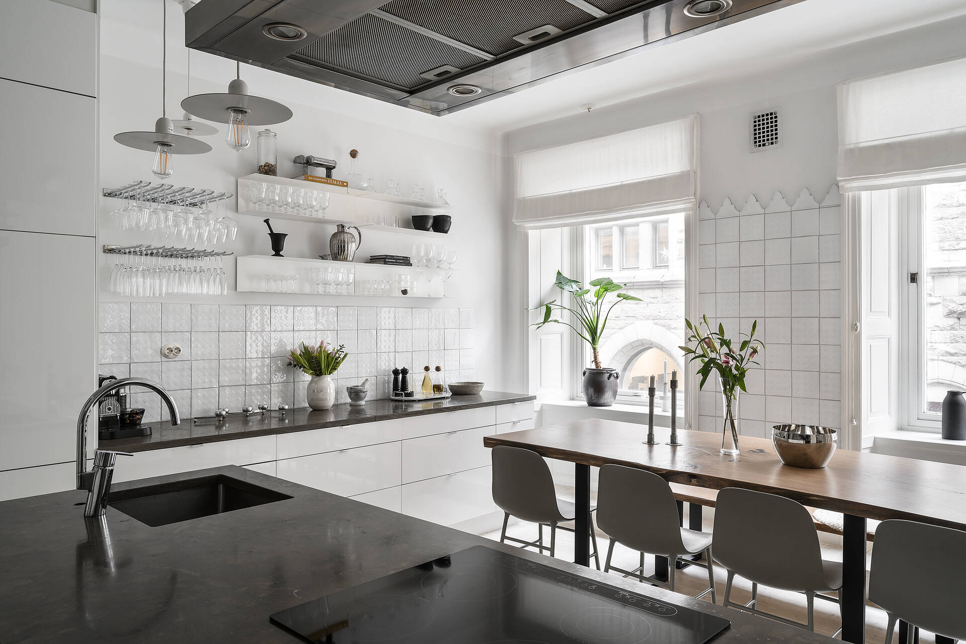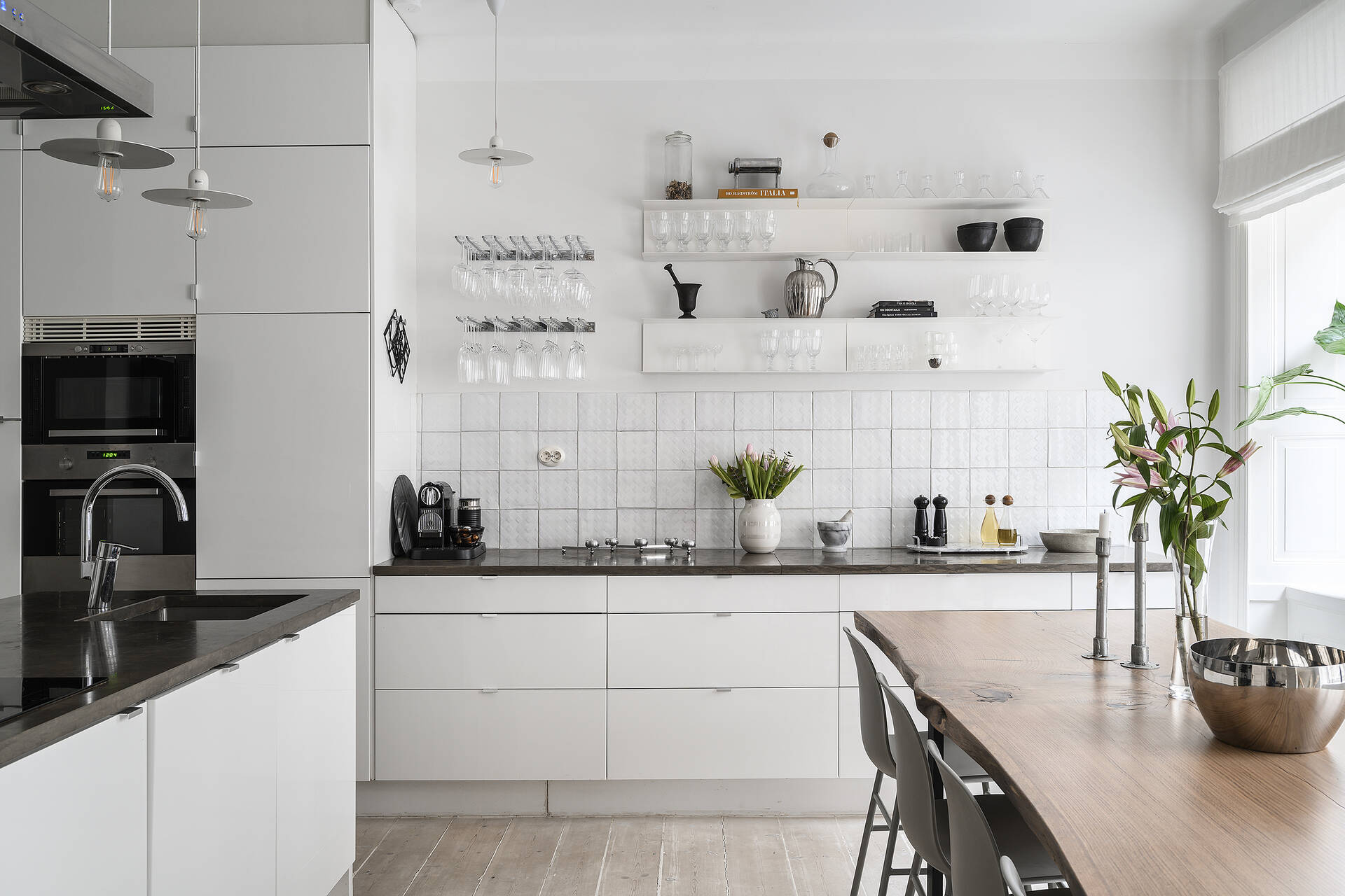 Kök och matplats i öppen planlösning. Släta vita skåp och bänkskivor i Gotländsk kalksten. Diskmaskin, mikro och kyl/frys från Ikea.