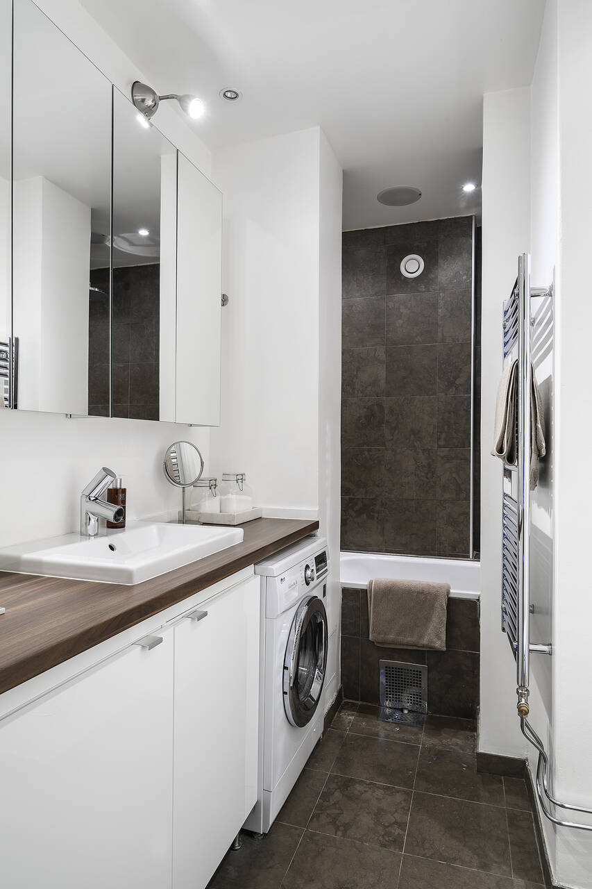 Badrum med badkar. Väggar och golv i kalksten, bänk i laminat med integrerat handfat, förvaringsskåp och tvättmaskin från LG undertill. Vägghängd wc, handdukstork (varmvatten). Badkar i nisch med väggar klädda i kalksten, takdusch med blandare från Oras.