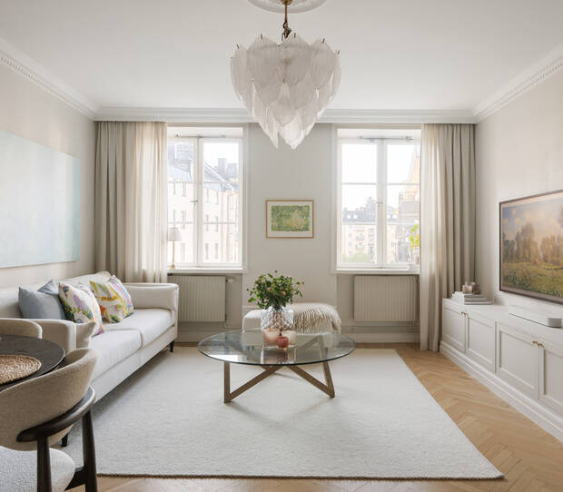 Inbjudande, välplanerad och smakfullt inredd våning i hjärtat av Stockholm med stort kök och matsal med plats för många i öppen planlösning, rymligt och ljust sällskapsrum, sovrum mot gården med god förvaring, mindre barnsovrum/arbetsrum med utsikt över gården, badrum med badkar i alkov. Gäst wc i hallen. Genomgående vackra furutiljor samt djupa fönsternischer med fönsterluckor i original och stora fönster med härligt ljusinsläpp från Regeringsgatan.