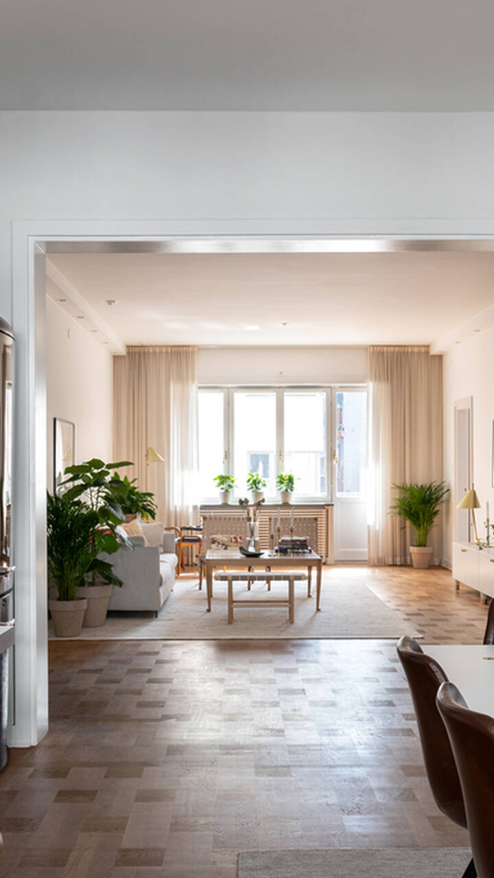 Med ett attraktivt läge mellan Humlegården och Östermalmstorg ligger denna ljusa våning med stora sociala ytor, nära 3 meter i takhöjd och två generösa balkonger, varav den ena i soligt sydvästläge och den andra mot föreningens lummiga innergård. Denna optimalt planerade våning ligger en trappa upp i välskött funkisfastighet från 1937. Tre bra sovrum, av vilka två har access till eget badrum. Därtill finns en gästtoalett som också har dusch. Det stilrena köket kan möbleras med matbord för större sällskap; i anslutning ligger vardagsrummet med fungerande öppen spis. Det finns generösa förvaringsmöjligheter i lägenheten; bostaden disponerar även ett källarförråd om ca 5 kvm. Hissen nås från entrén utan några trappsteg och går även ner till föreningens tvättstuga, källarförvaring samt barnvagns-/cykelrum. Föreningen har goda hyresintäkter och är mycket välskött. Välkommen!
