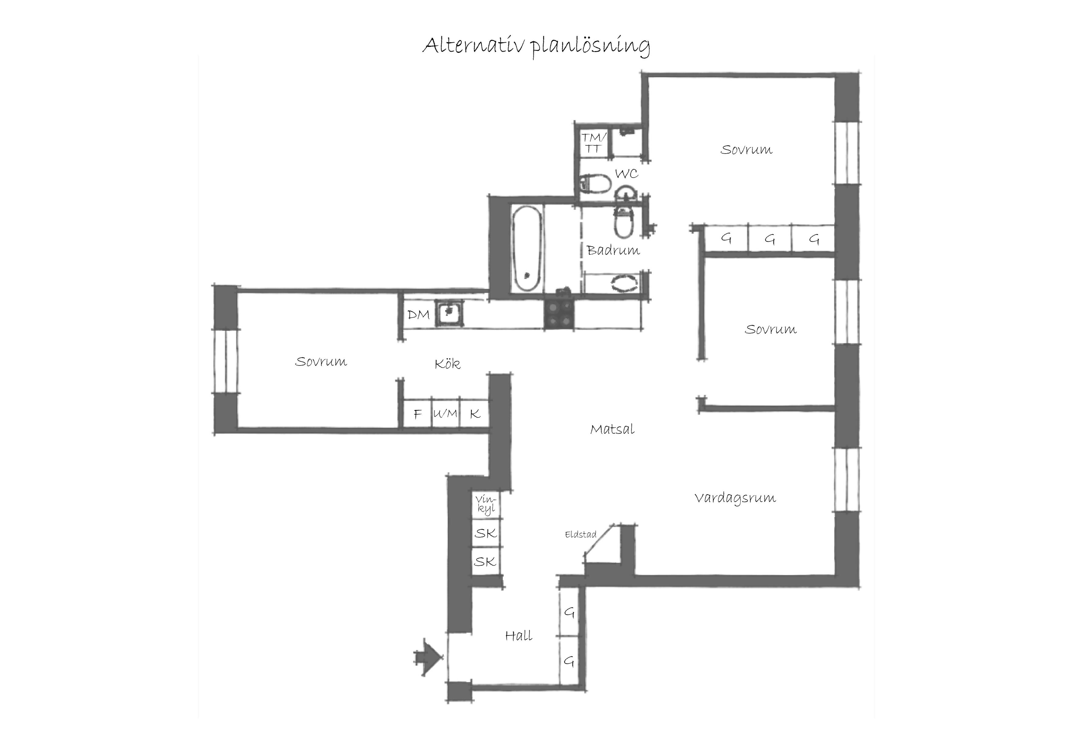 Topprenoverat badrum med stort badkar och duschrum, handfat, toalett med tvättmaskin och torktumlare. Väggarna och golv pryds med vit/grå granitkeramik (marmorimitation). Se "alternativ planlösing" för idé om två toaletter.