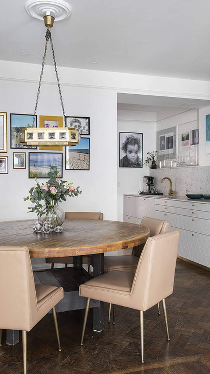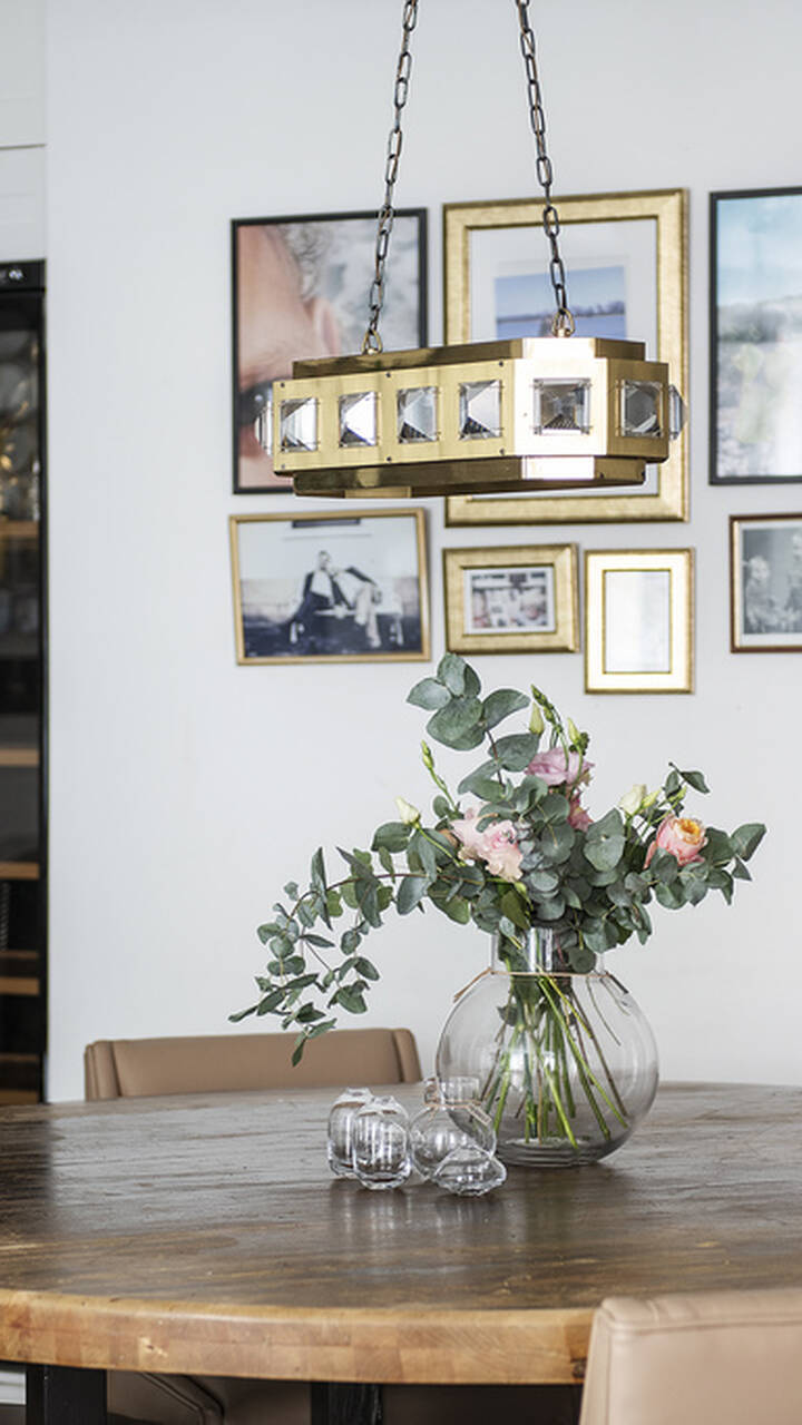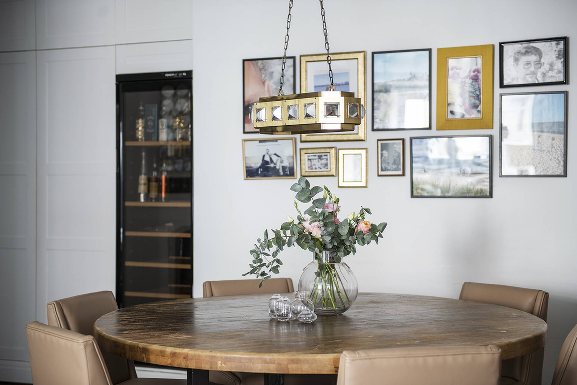 Den inre hallen är bostadens hjärta där den fungerande öppna spisen är placerad. Idag används detta rum som matplats/matsal och angränsar till det prydliga köket med luckor från Superfront, vitvaror från Whirlpool och diskret fläkt från Fjäråskupan.