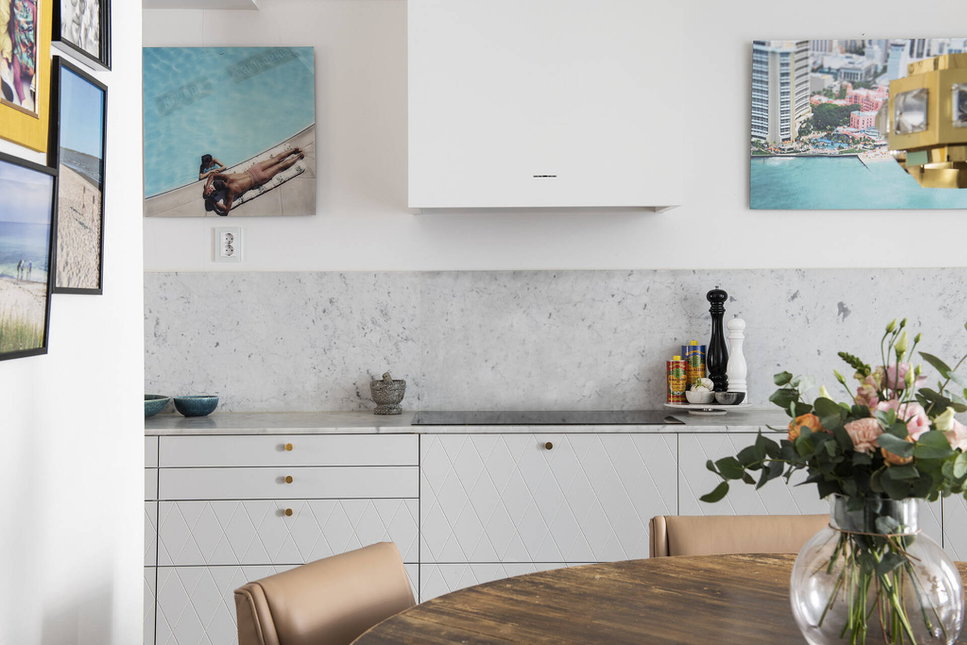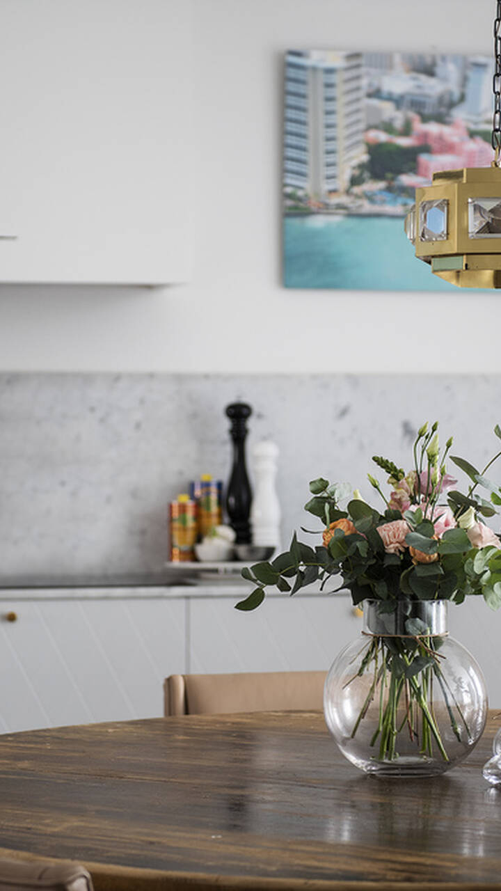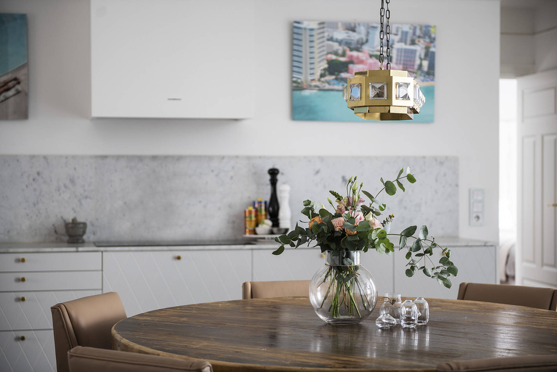 Den inre hallen är bostadens hjärta där den fungerande öppna spisen är placerad. Idag används detta rum som matplats/matsal och angränsar till det prydliga köket med luckor från Superfront, vitvaror från Whirlpool och diskret fläkt från Fjäråskupan.