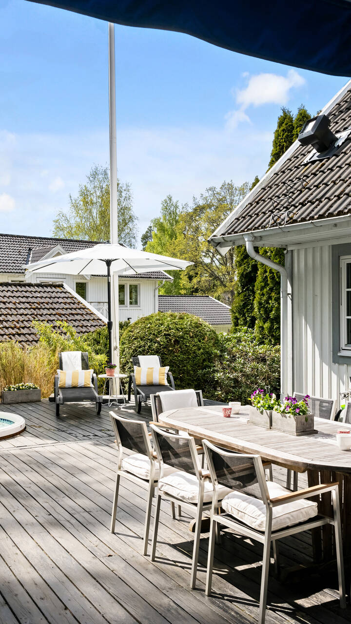 Husets stora altan på baksidan är helt skyddad tack vare husets vinkelform och här finns ett mysigt spa- bad, utedusch samt gott om plats för matbord och lounge möbler. Trädgarden som är lättskött, inramas av frikostig grönska med plana gräsytor och äppelträd. Tomten ligger på en insynsfri skafttomt vilket gör trädgården helt fri från insyn. På tomten finns ett garage med förråd samt carport.