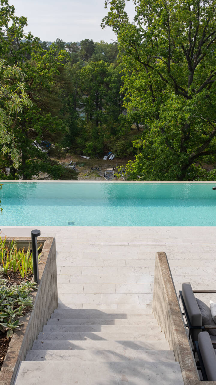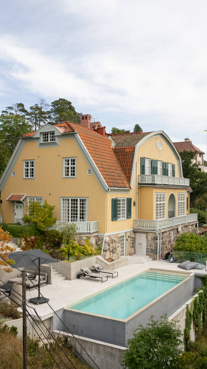 I det idylliska Saltsjöbaden finns denna magnifika villa med gårdskänsla ritad av Ragnar Östberg 1908. Här finns imponerande 14 rum, varav 7-8 kan nyttjas som sovrum, och utomhus lockar en stor insynsskyddad tomt om 3 675 kvm med välkomnande grusplan, stenlagda uteplatser och infinity-pool. Från dessa oaser intar man det fantastiska höga läget med utsikt över Pålnäsviken och sol under hela dagen. Renovering har skett löpande under åren med omsorg för att bevara den ursprungliga sekelskiftescharmen samtidigt som moderna faciliteter och teknik har integrerats. Villan omfattar hela 838 kvm fördelade över 3,5 plan, inkluderande källare i souterräng och en inredd vind. På entréplan möts man av ett storslaget sällskapsrum, perfekt för sociala sammanhang med uppemot 4 meter i takhöjd och imponerande fönsterpartier samt öppen spis. Utgång till en alkov under tak och en stor längsgående balkong. Elegant bibliotek med väggpaneler i original och utgång till en rundad balkong. Stilrent kök från Bulthaup med släta luckor och integrerade vitvaror från Gaggenau. Modernt och rymligt med plats för stora sällskap vid matplatsen där en öppen spis sprider värme i hörnet och utgång till en terrass som sträcker sig utmed hela fasaden. Mestadels fiskbensparkett utigenom hela villan, förutom matsal som har enstavig ljus parkett, kök med klinkergolv och sovrummen på övre plan som har ljusa plankgolv. Villan rymmer hela sju sovrum på de två översta våningsplanen, inklusive ett master bedroom med kakelugn, dressing room och ett stort badrum en-suite. Tre av sovrummen har utgång till en gemensam balkong och den övre hallen med imponerande valv och pelare går att möblera efter behov och har utgång till en mindre balkong. Vindsplanet har två sovrum och i mitten ett tv-rum samt badrum med dusch. Längst ner i souterrängplanet finns bekvämligheter såsom en lounge med pentry och etanolspis för mysiga stunder och direkt utgång till pool-området med olika sittplatser och grönskande utsikt. Här finns även gym och bastu, två WC och många olika förvaringsutrymmen. Varje våningsplan har sällskapsrum i varierande storlek och passar en stor familj med mycket umgänge. Välkommen till ett fantastiskt boende med generösa ytor och mycket charm.
