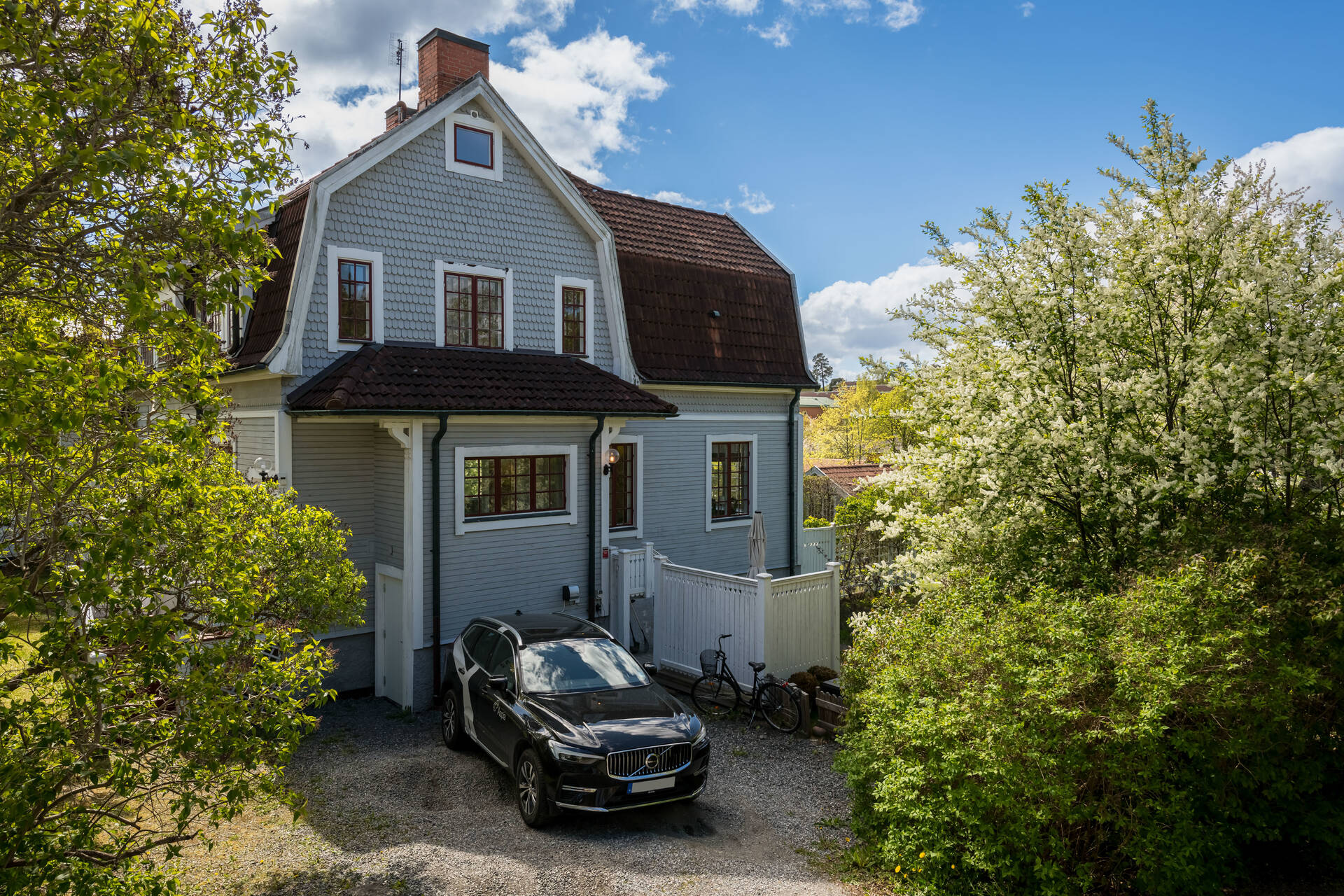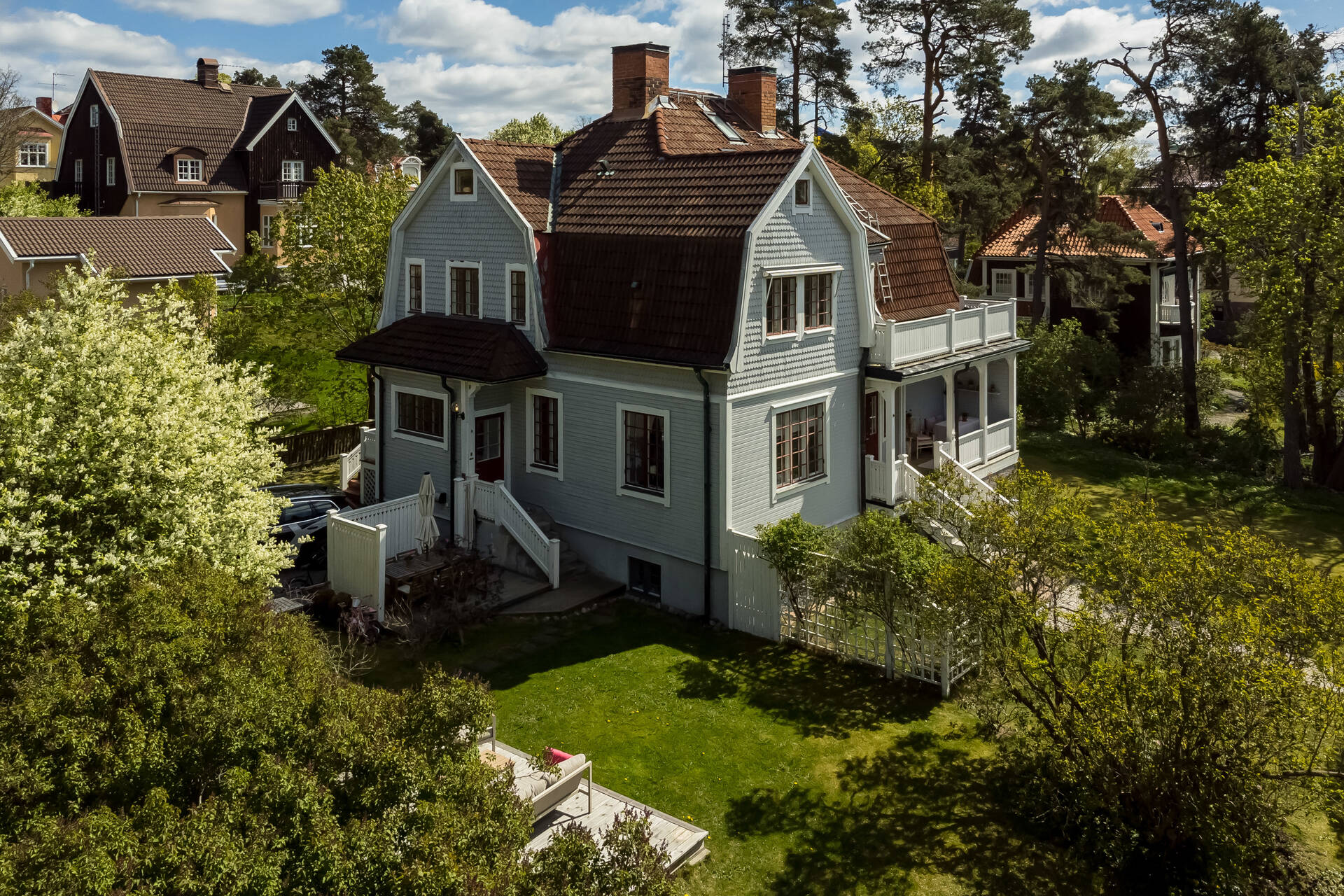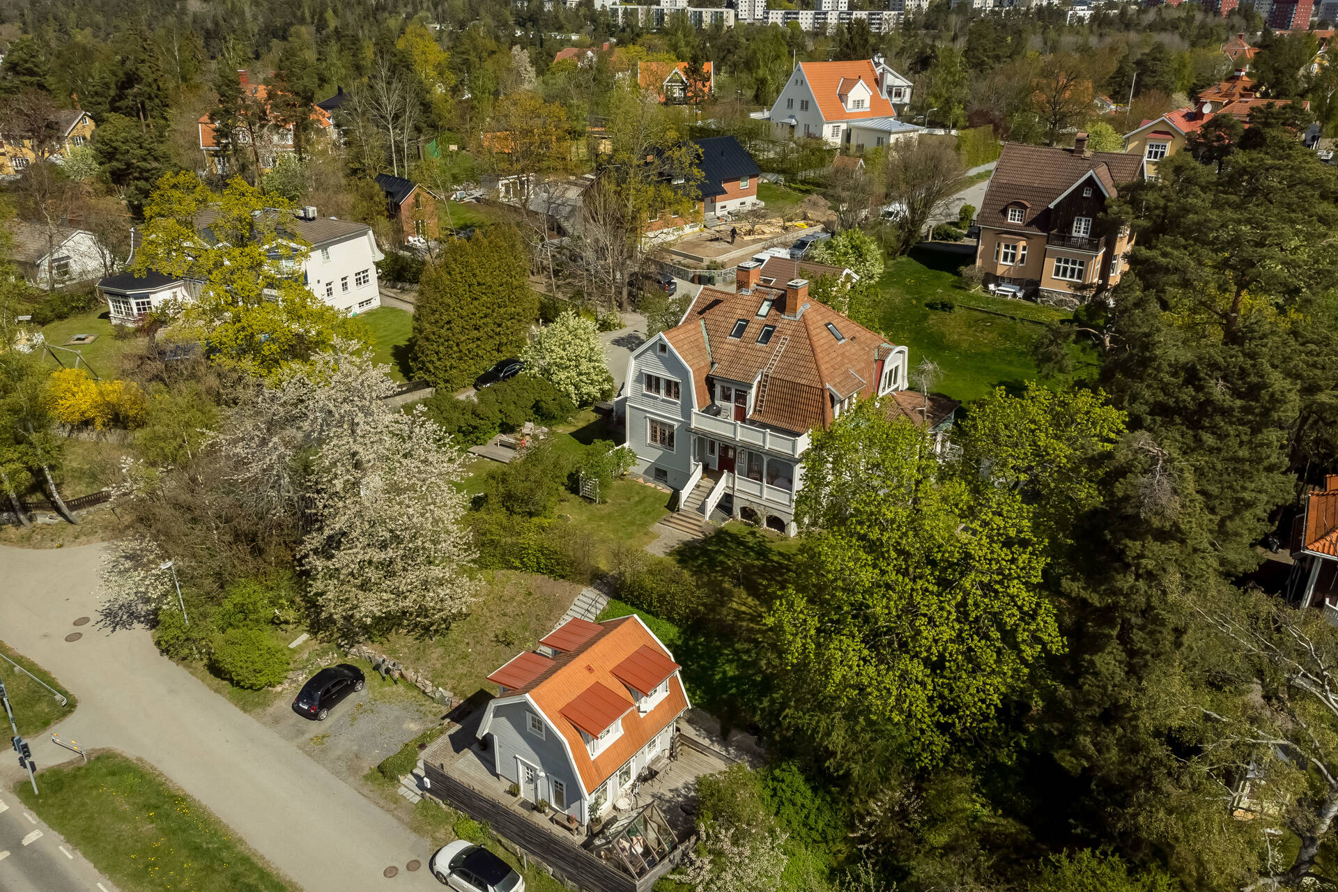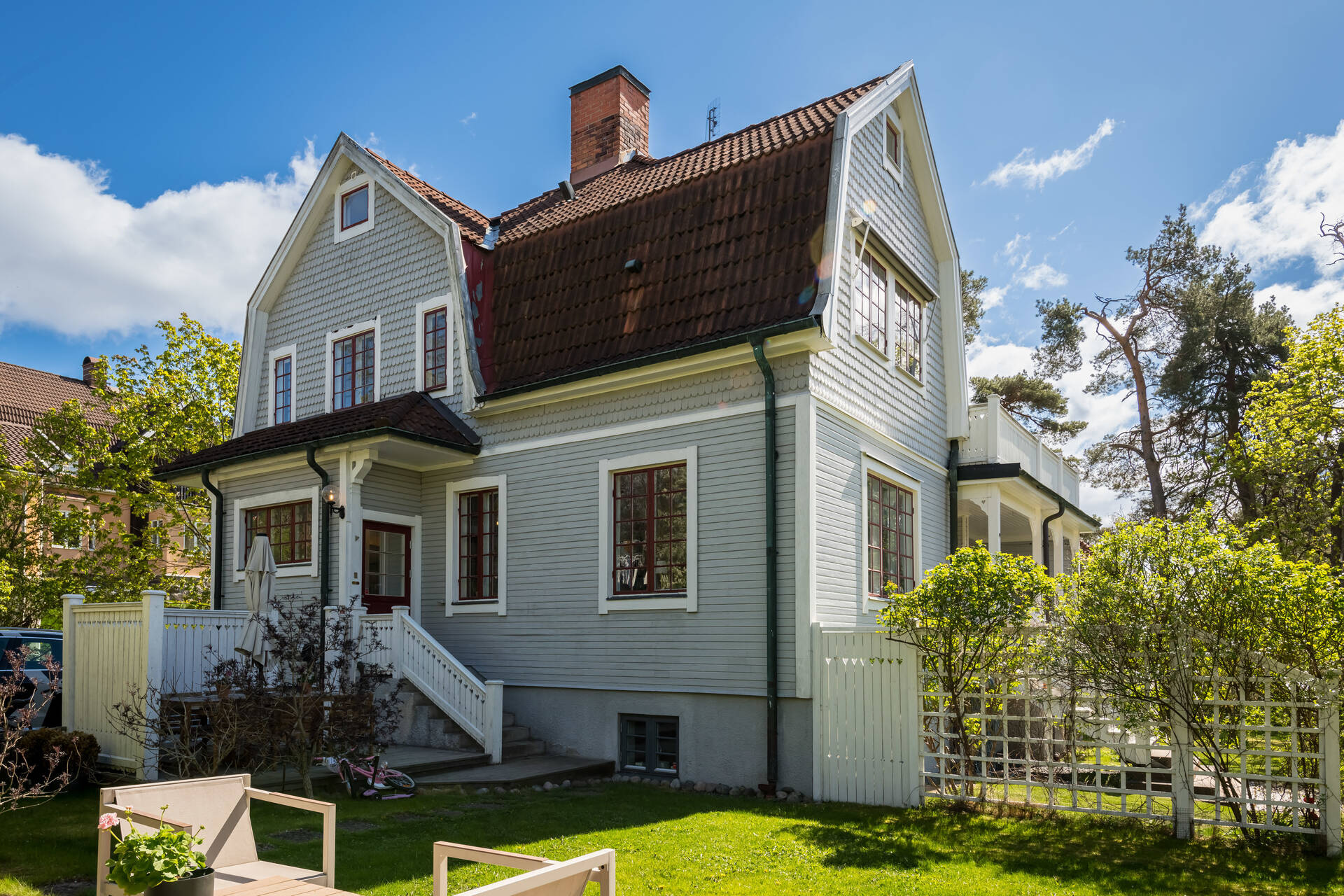 Belägen högt uppe på höjden stoltserar denna stilfulla villa signerad Nils Persson (1906) samt tillbyggd av välkända Jacob J:son Gate (1914). Finstämd nationalromantisk arkitektur i Lidingös klassiska villakvarter. Här möts man av kontrasterande liggande och stående träpanel, utmejslade burspråk, spröjsade fönster och mansardtak. Interiört luftiga stora sällskapsrum med vältilltagen takhöjd. Flertalet tidstypiska attribut såsom flertalet öppna spisar, stuckaturer och pardörrar. Möjlighet att skapa ett hem perfekt för den stora familjen med stora sällskapsytor i anslutning till trädgården och privat ombonad sovrumsdel en trappa upp. Milsvid utsikt över det bildsköna villaområdet från det övre planet. Påkostad grindstuga, perfekt för uthyrning, au-pair eller långväga gäster. Idag disponeras huvudbyggnaden som två separata hem och grindstugan som ett tredje. Läget i Hersby kan inte bli bättre med omedelbar närhet till natur, utmärkta kommunikationer och välrenommerade förskolor och skolor på gångavstånd. Varmt välkommen på bokad visning.