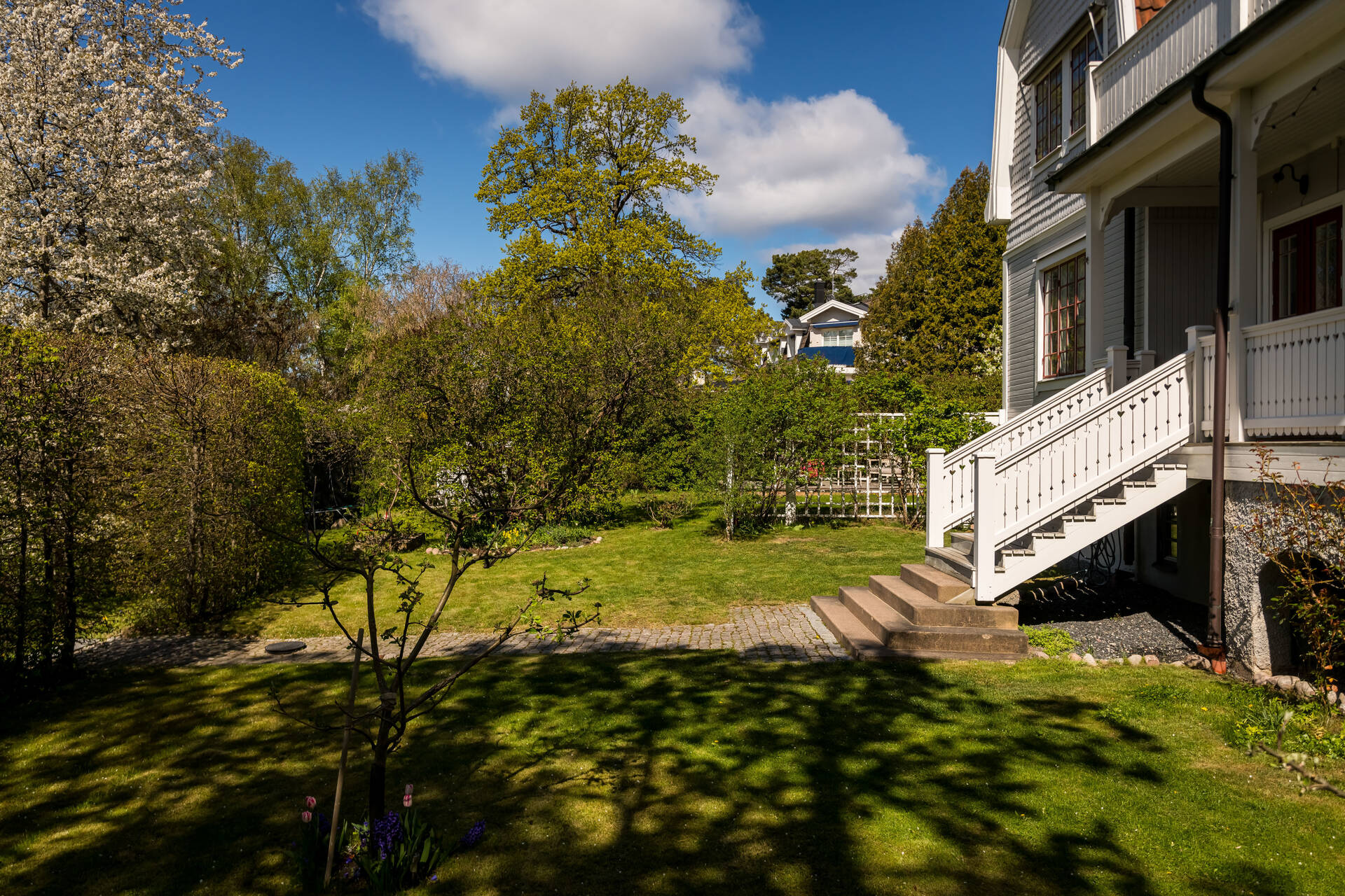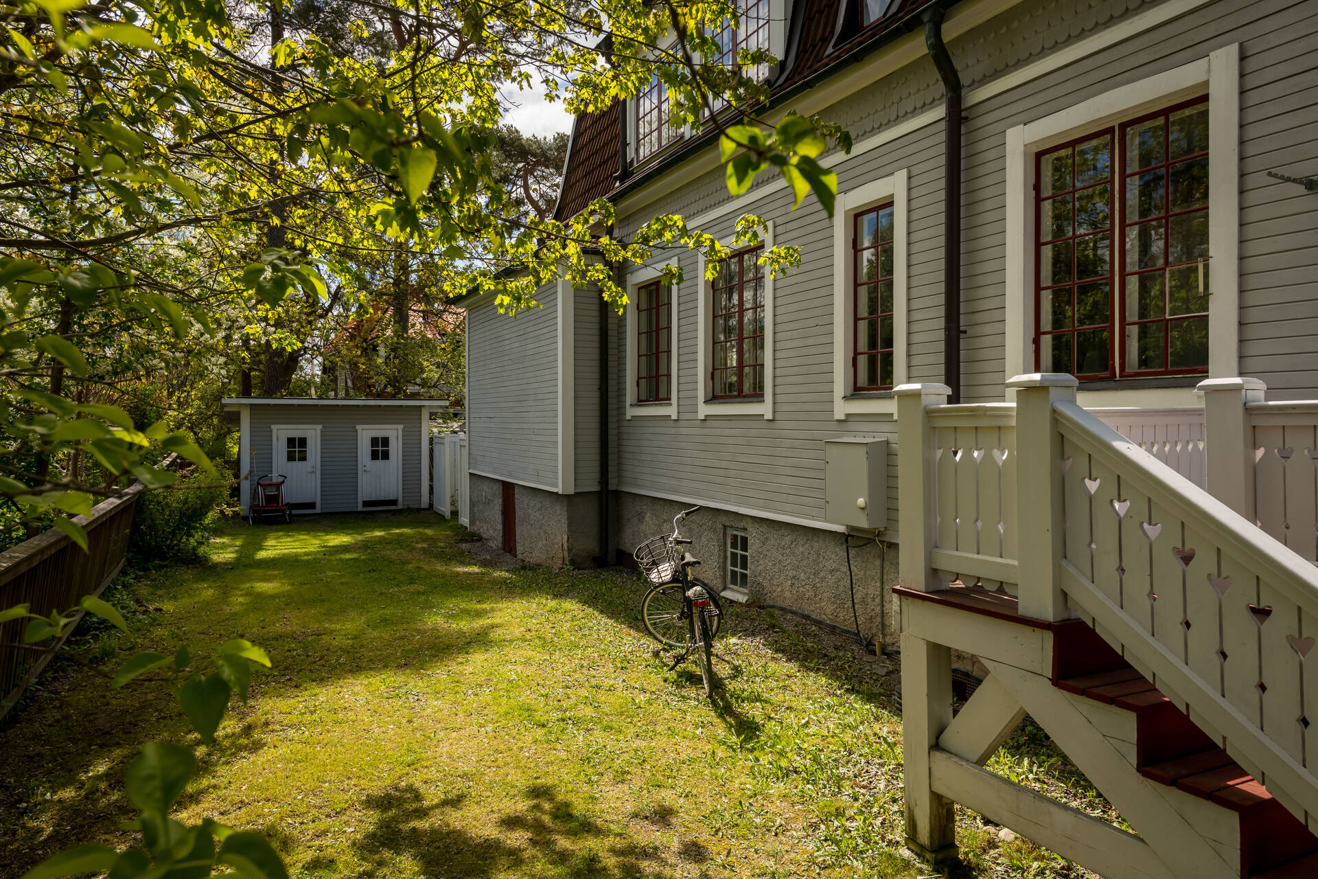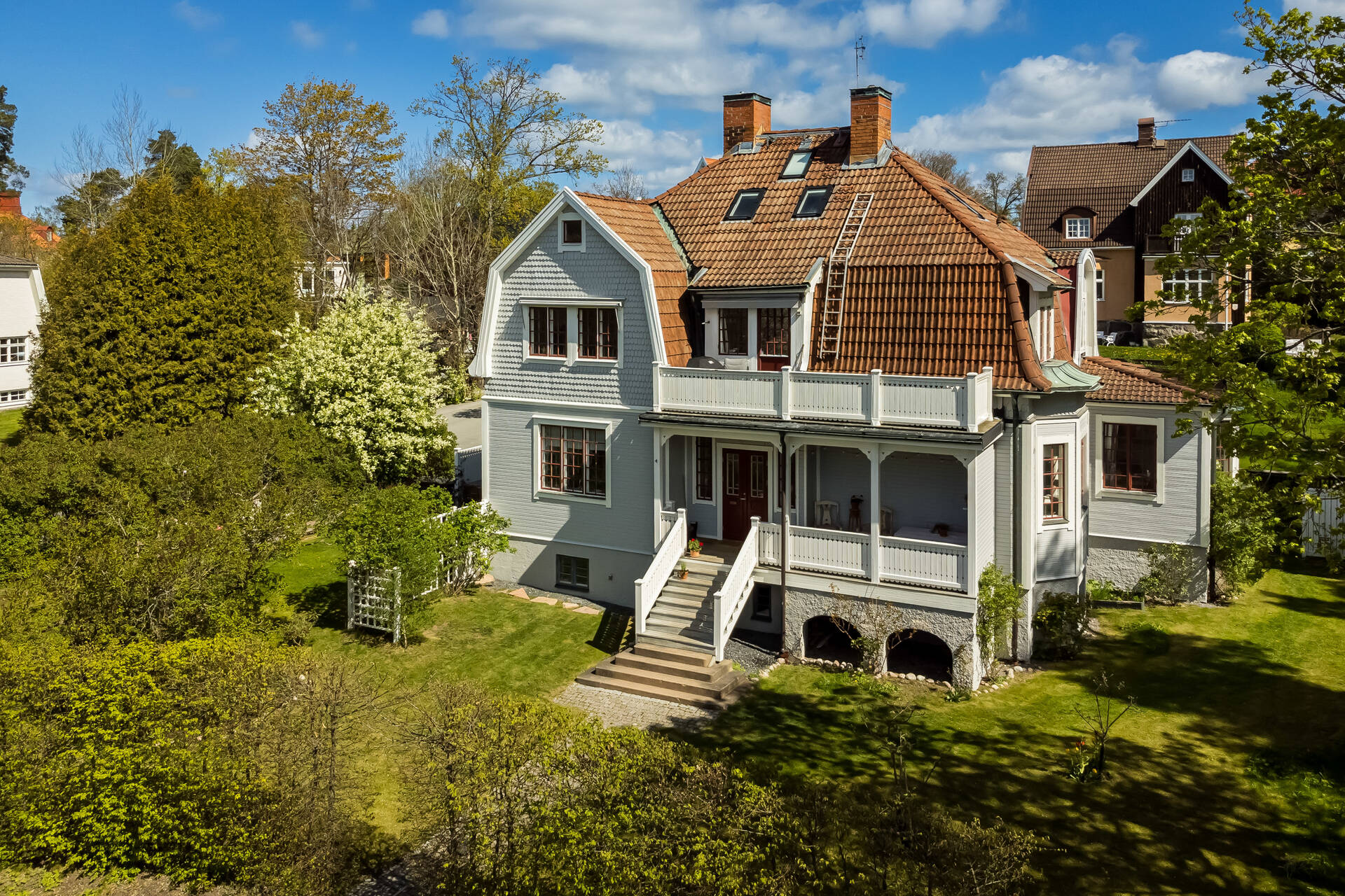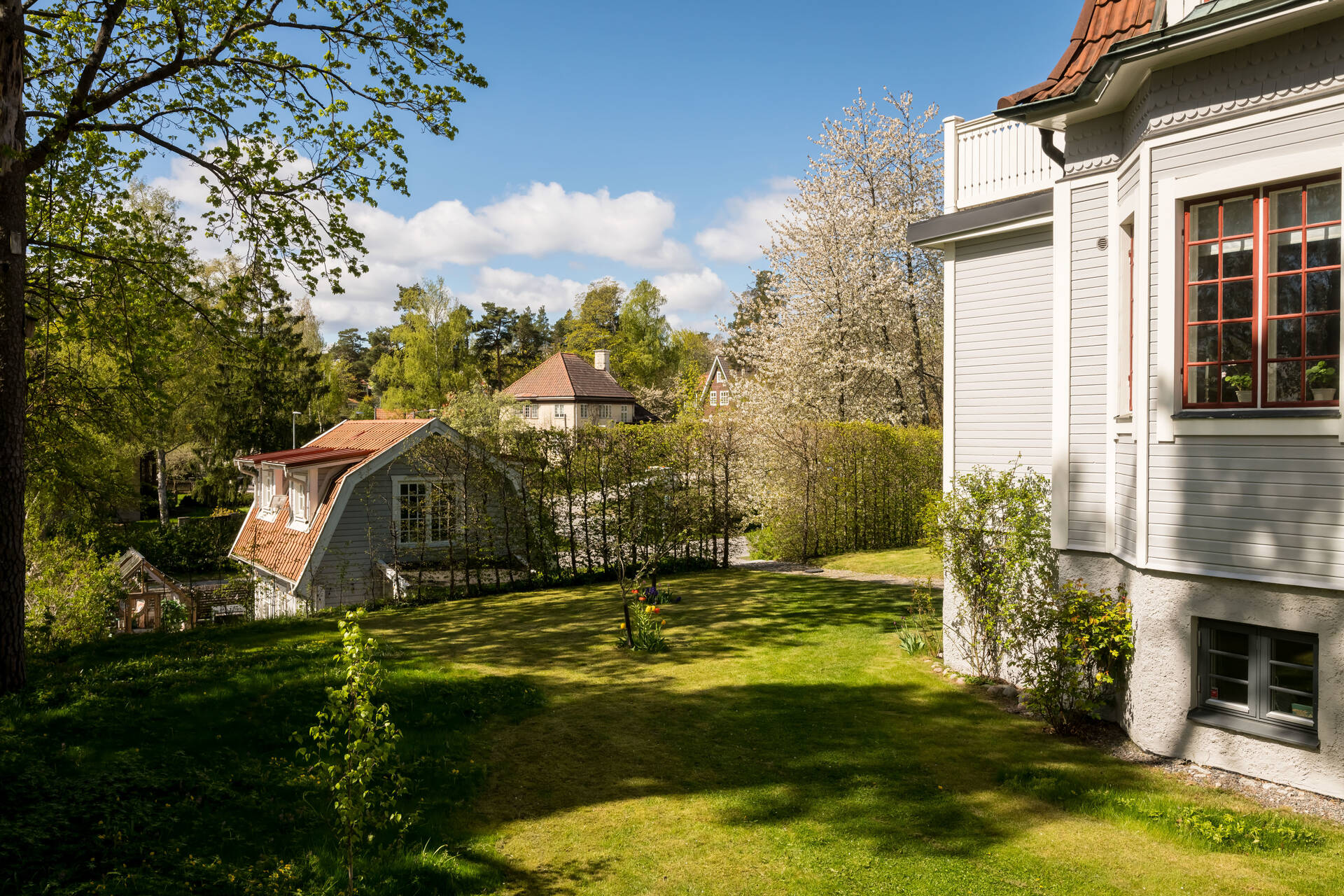 Belägen högt uppe på höjden stoltserar denna stilfulla villa signerad Nils Persson (1906) samt tillbyggd av välkända Jacob J:son Gate (1914). Finstämd nationalromantisk arkitektur i Lidingös klassiska villakvarter. Här möts man av kontrasterande liggande och stående träpanel, utmejslade burspråk, spröjsade fönster och mansardtak. Interiört luftiga stora sällskapsrum med vältilltagen takhöjd. Flertalet tidstypiska attribut såsom flertalet öppna spisar, stuckaturer och pardörrar. Möjlighet att skapa ett hem perfekt för den stora familjen med stora sällskapsytor i anslutning till trädgården och privat ombonad sovrumsdel en trappa upp. Milsvid utsikt över det bildsköna villaområdet från det övre planet. Påkostad grindstuga, perfekt för uthyrning, au-pair eller långväga gäster. Idag disponeras huvudbyggnaden som två separata hem och grindstugan som ett tredje. Läget i Hersby kan inte bli bättre med omedelbar närhet till natur, utmärkta kommunikationer och välrenommerade förskolor och skolor på gångavstånd. Varmt välkommen på bokad visning.