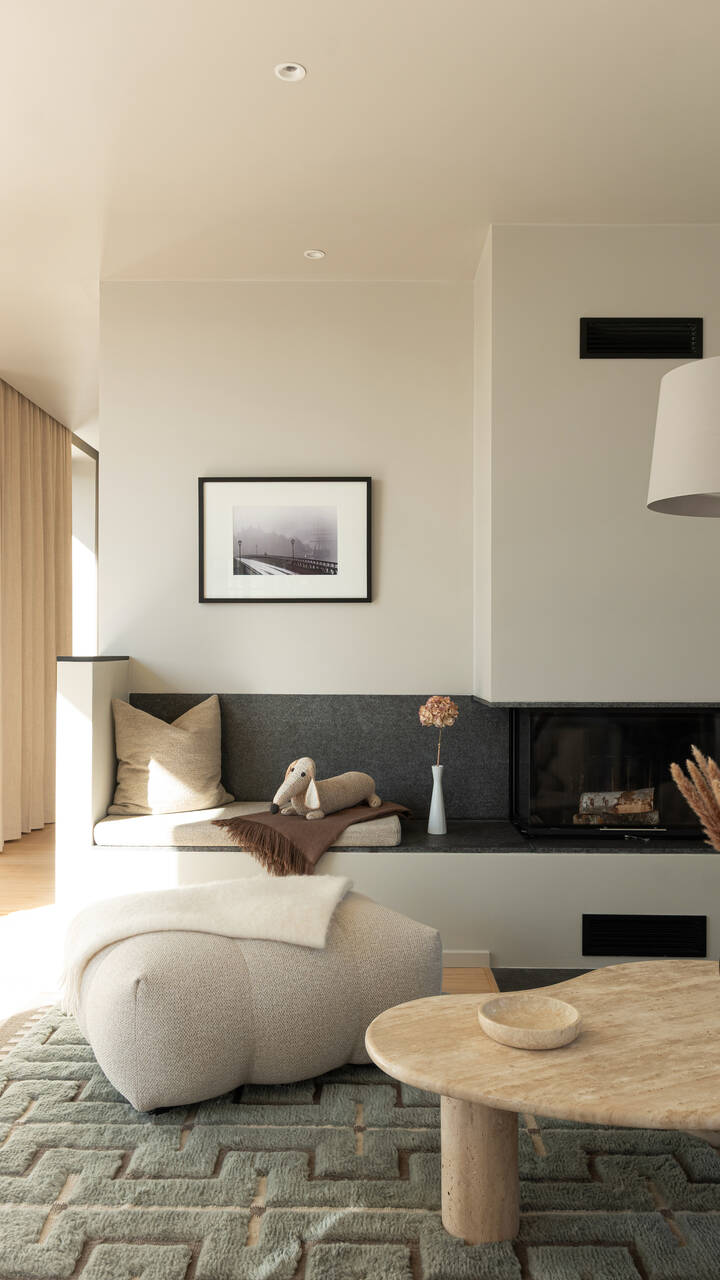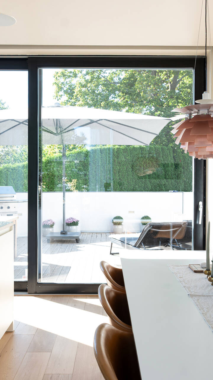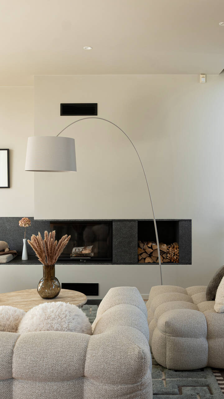 På entréplanet är det ljusa och luftiga vardagsrummet med den centralt placerade braskaminen hjärtat i hemmet. Det smälter fint ihop med köket och skapar en naturlig och inbjudande samlingsplats. De generösa panoramafönstren med skjutdörrar ramar in den natursköna utsikten och låter ljuset flöda in. Här skapas en mjuk övergång mellan det stilfulla inomhuslivet och den stora terrassen med anslutande trädgård. Det finns gott om plats för en soffgrupp och ett stort matbord – perfekt för att bjuda in familj och vänner till härliga middagar och sociala stunder. I både vardagsrum, master bedroom och master badrum finns inbyggda högtalare från Bowers & Wilkins som höjer vardagen ytterligare.