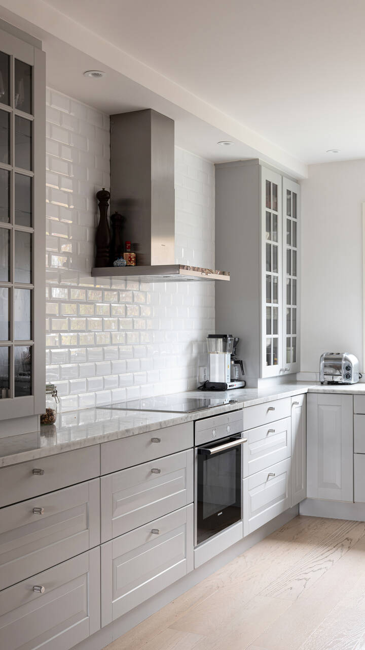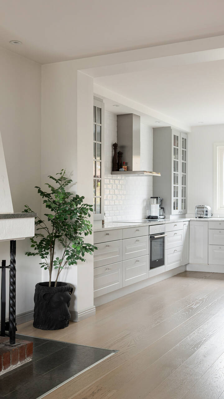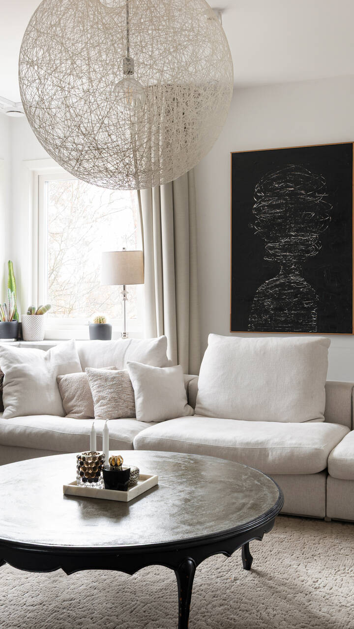 Invändigt är bostaden i mycket fint skick med genomgående ljusa material och stilren design. De sociala ytorna binds samman av ett öppet vardagsrum med välfungerande eldstad och matplats i anslutning till köket. Marbodalköket är smakfullt utformat med ljusgrå spegelluckor, bänkskiva i marmor och integrerade vitvaror. Fyra till fem sovrum, varav tre på det privata ombonade övre planet. Totalt tre badrum med kvalitativa ytskikt, alla med dusch, och ett med vackert badkar med lejontassar. Ljusa sobra färger och på entréplan enstavig ekparkett.
