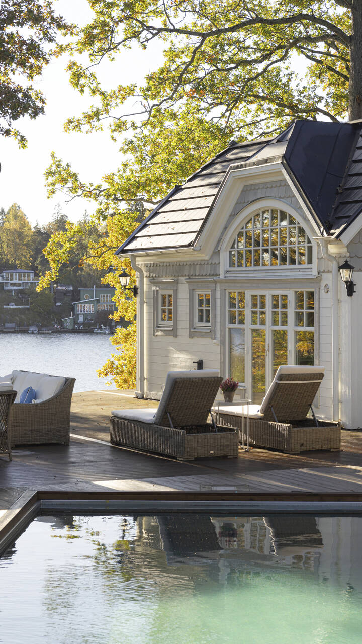 Stor terrass och poolområde med vackert poolhus, bastu för socialt umgänge både inne och ute med fantastisk sjöutsikt. Villan omges av en härlig parkliknande tomt som sträcker sig ner mot vattnet.