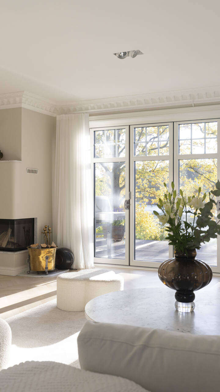 Den pietetsfulla byggnaden genomsyras av en sofistikerad atmosfär, sjöutsikt och genomgående vackra detaljer. Magnifik entré som öppnar upp till den stora sällskapsdelen i öppen planlösning med matsal och kök. De generösa sällskapsytorna har en eldstad och exklusivt platsbyggt kök i klassiskt stil från Tibrokök samt utgång till terrassen med pool. Stora glaspartier släpper in fint ljus från alla håll så hela villan flödar av ljus.