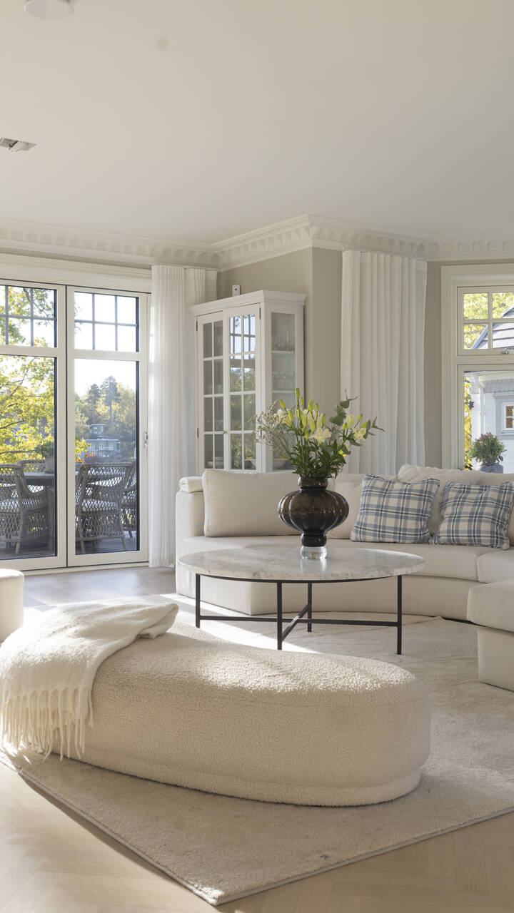 Genomgående smakfulla och högkvalitativa materialval med handgjorda gipsstuckaturer, dörrtrycken och lister från Sekelskifte samt ljus stavparkett.