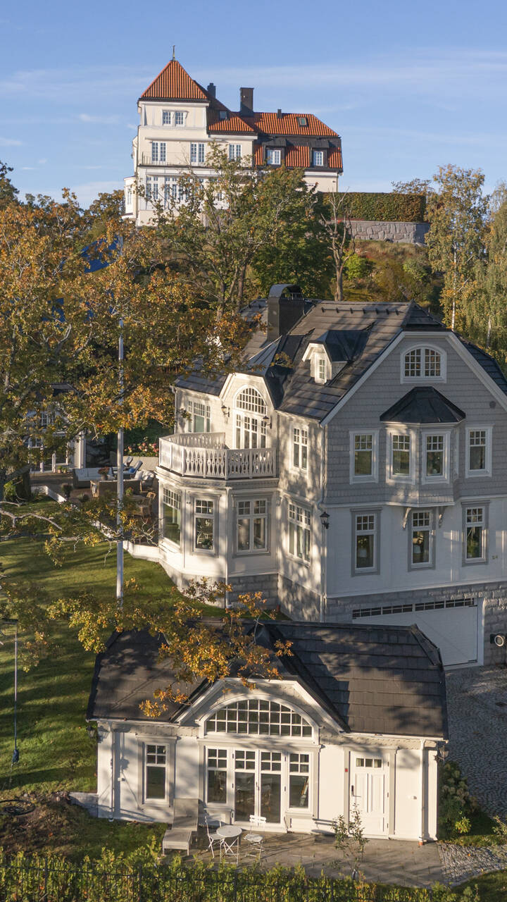 En helt enastående och unik nybyggd villa om totalt 487 kvm i New England-stil, vackert beläget vid vattnet med sjöutsikt och i mycket hög internationell exklusiv klass ritad av arkitekt Heidi Mikalsen.