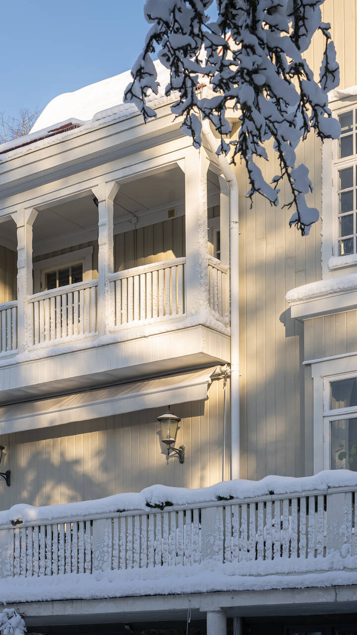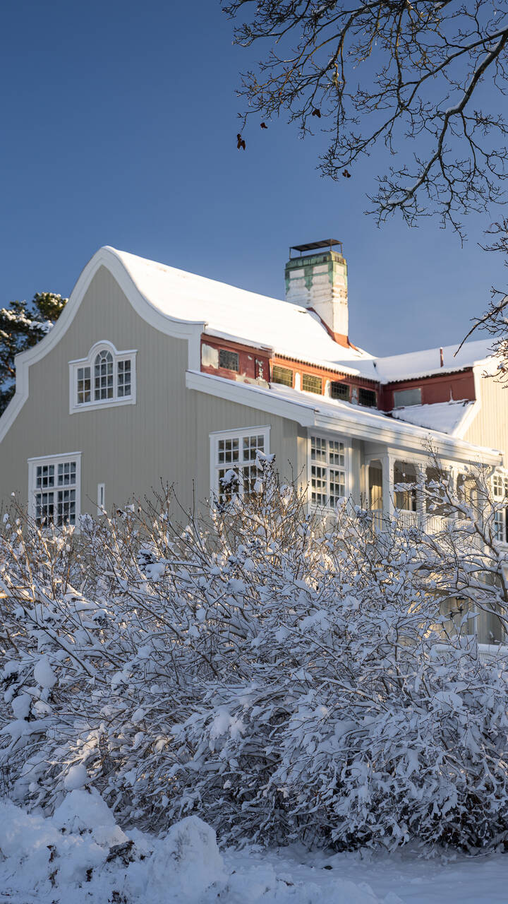 De kraftfulla burspråken, de spröjsade fönstren och de branta takfallen vittnar om en epok då hantverket stod i centrum. Interiört möts man av luftiga sällskapsrum med flertalet öppna spisar och pardörrar. Matsal i fil med salong och kök samt ett ljusfyllt orangeri. Biblioteket med platsbyggda hyllor skänker karaktär och intimitet.