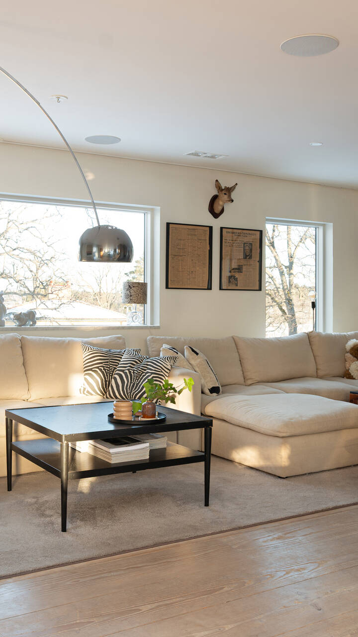 Villan är disponerad över tre plan, där mellanplanet utgör bostadens sociala kärna. Här samsas ett platsbyggt, socialt kök med ett generöst vardagsrum med murad öppen spis samt en rymlig matplats anpassad för större sällskap. Skjutdörrar leder vidare ut till terrassen och den lummiga trädgården med pergola, eldstad och omsorgsfulla planteringar, med utsikt mot både Vårgärdssjön och Erstaviken.