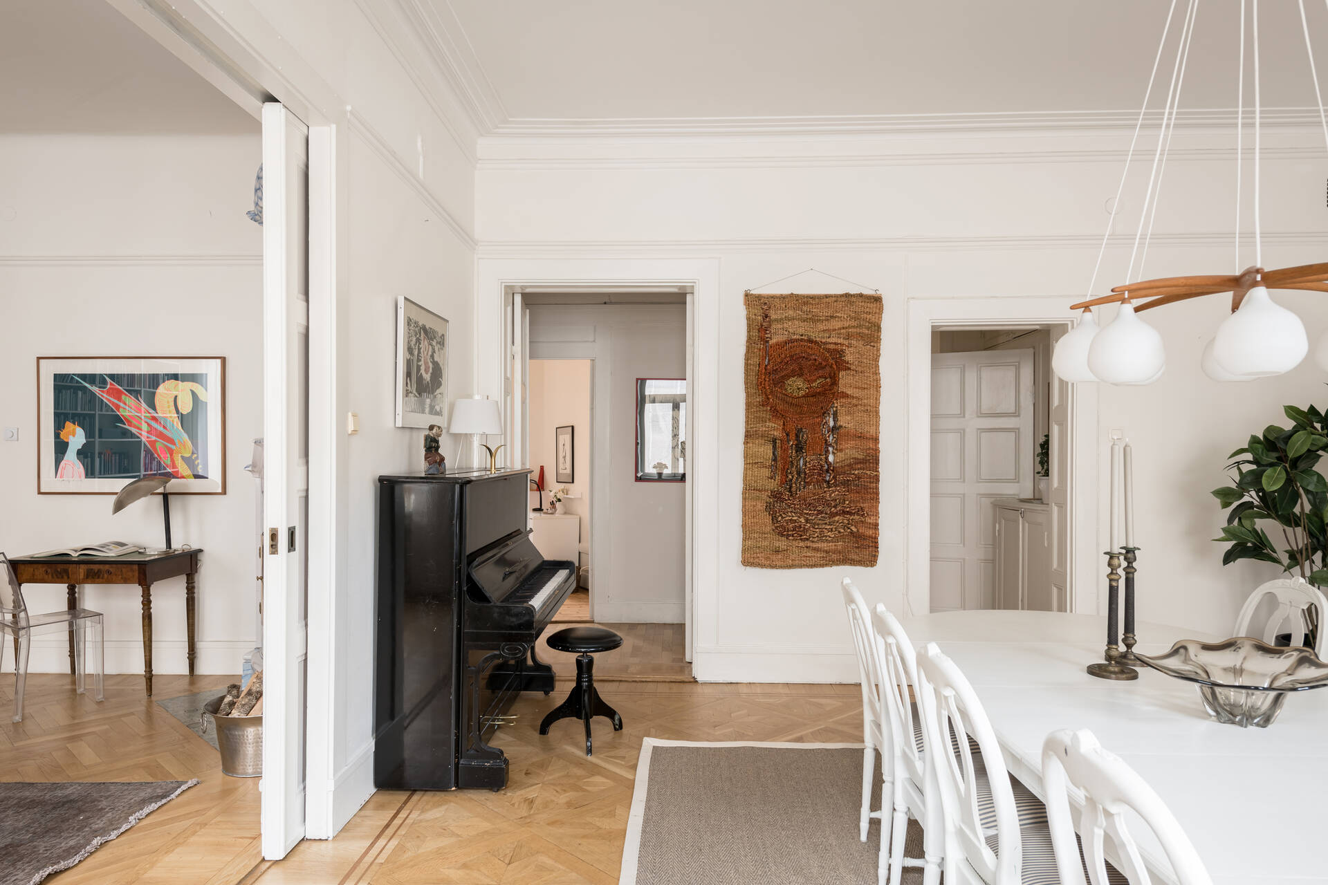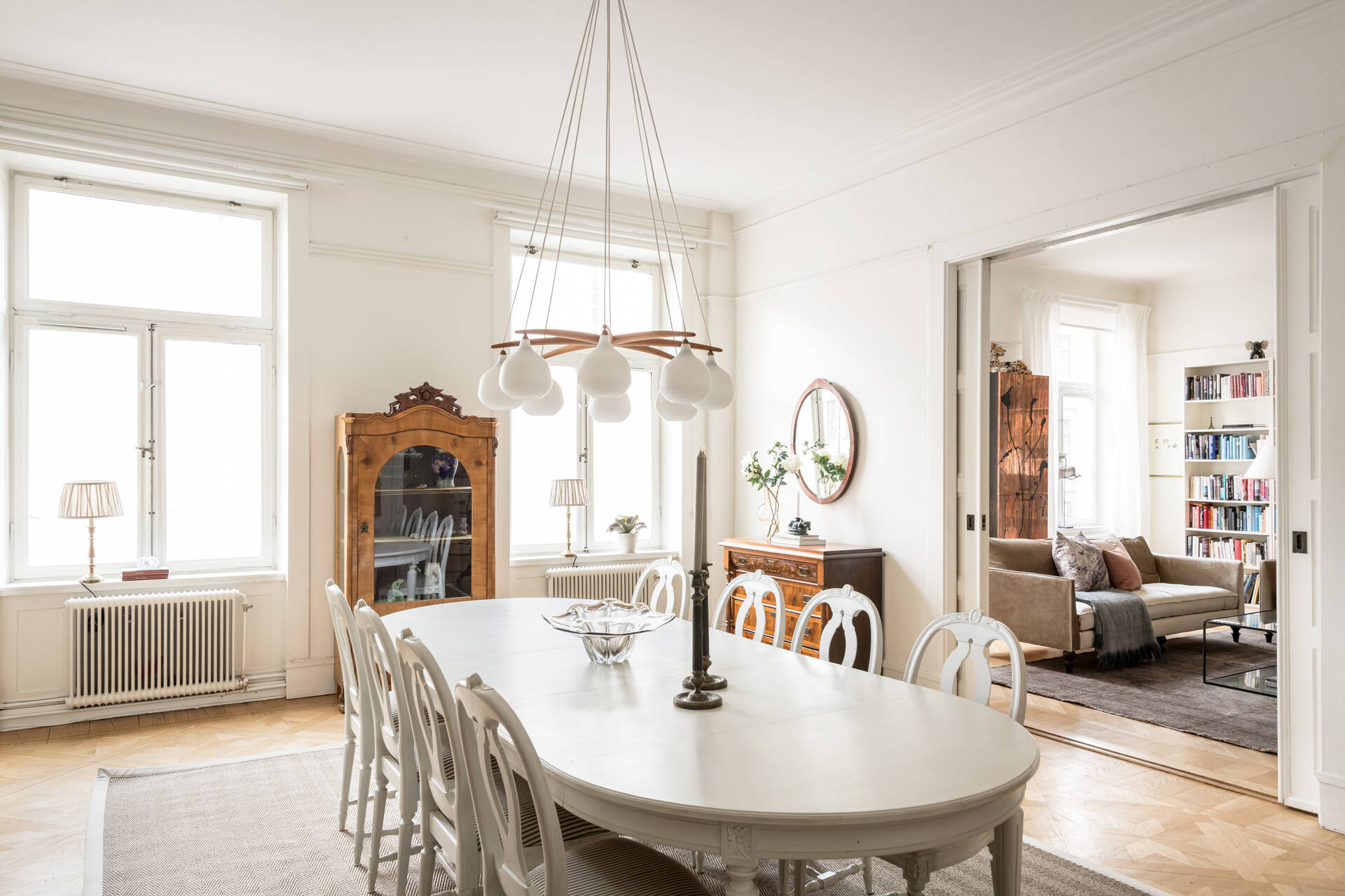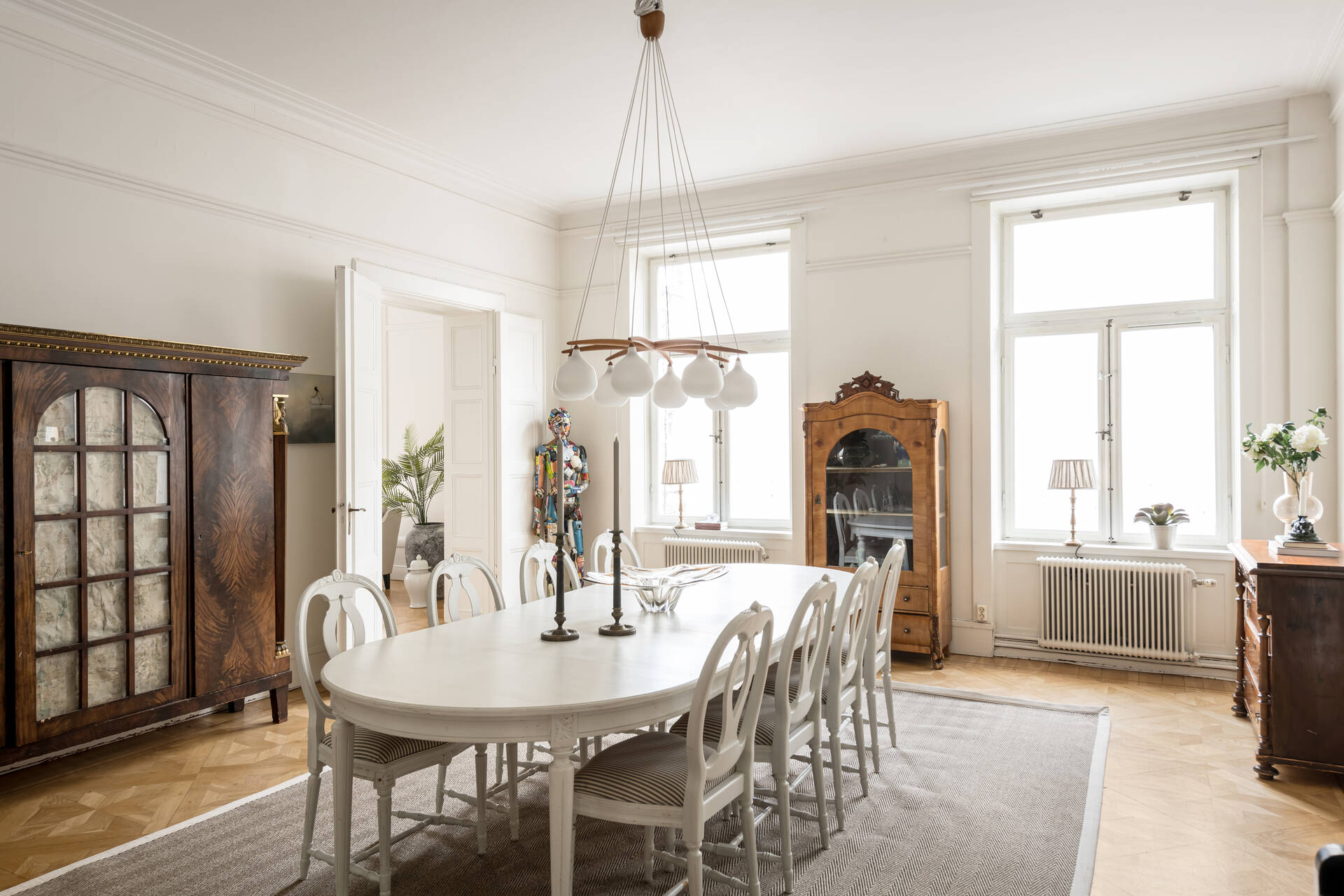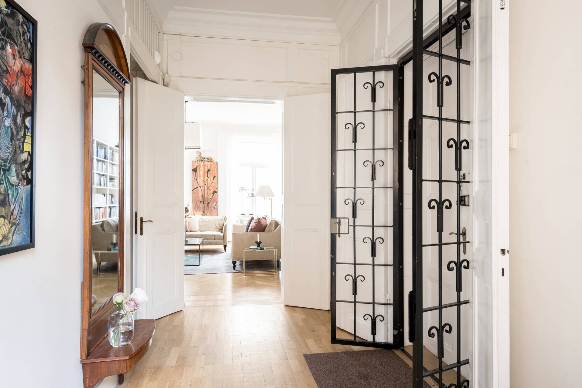 Denna klassiska Östermalmsvåning erbjuder en öppen och luftig atmosfär som genomsyras av tidlös elegans och välbevarade originaldetaljer såsom fiskbensparkett, stuckatur, kakelugnar, stora fönsterpartier, spegeldörrar samt vägg- och taklister. Här bjuds generösa sällskapsytor med tre stora sällskapsrum i fil med utsikt över gatan och Östermalm. Det finns tre bevarade kakelugnar. Tre till fyra stora sovrum. Balkongen mot innergården erbjuder en fridfull reträtt. Fullt utrustat kök som förlängs genom en klassisk serveringsgång med generösa arbetsytor och gott om förvaring. Till lägenheten hör en uthyrningsdel om ett rum med egen ingång. Denna går även att bygga in i huvudvåningen för extra sovrum eller kök. Hela våningen klassas som en lägenhet med tre olika ingångar. Här bor du i en välskött förening med låg belåning på bästa adress i representativ hus anno 1903. Varmt välkommen på visning!