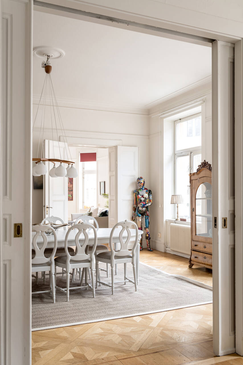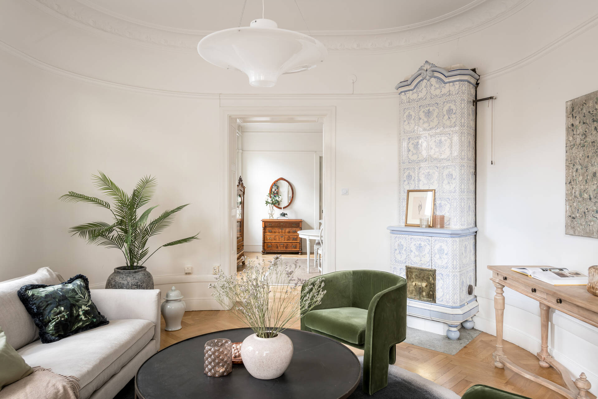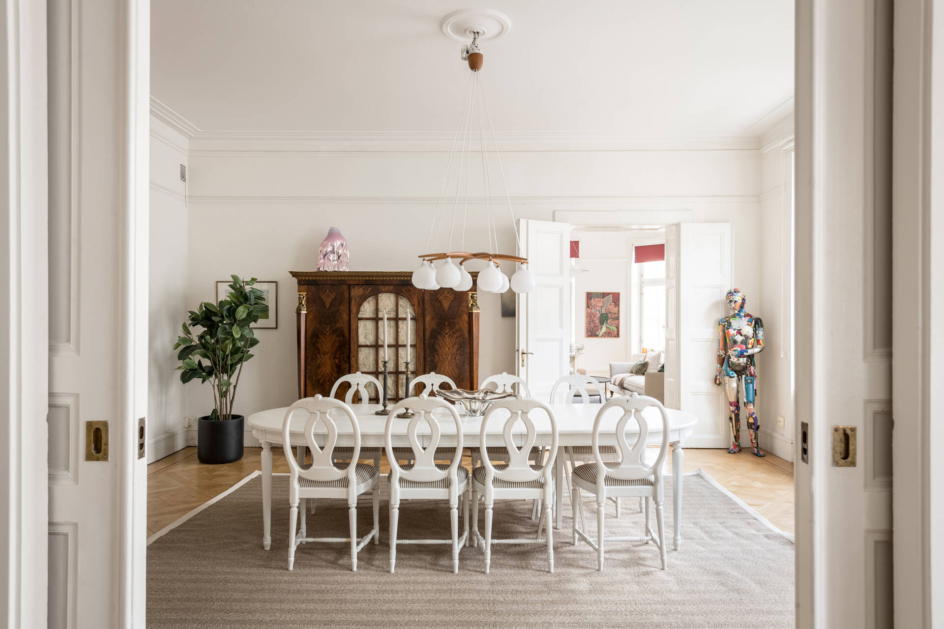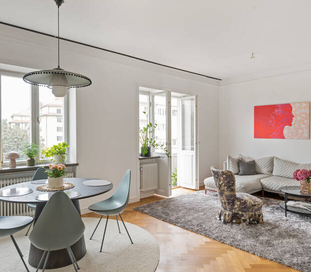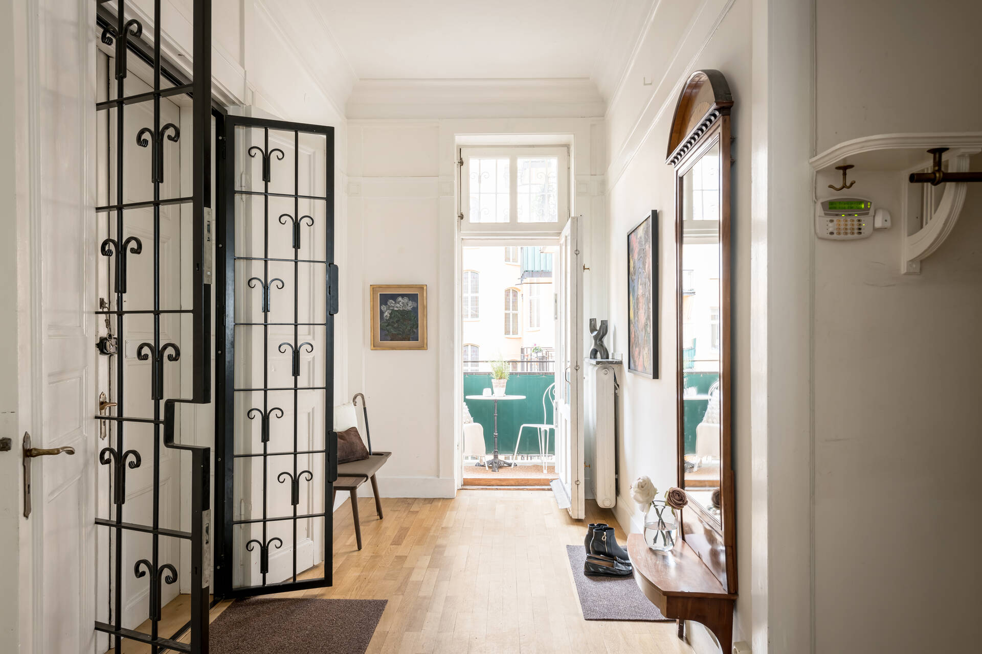 Denna klassiska Östermalmsvåning erbjuder en öppen och luftig atmosfär som genomsyras av tidlös elegans och välbevarade originaldetaljer såsom fiskbensparkett, stuckatur, kakelugnar, stora fönsterpartier, spegeldörrar samt vägg- och taklister. Här bjuds generösa sällskapsytor med tre stora sällskapsrum i fil med utsikt över gatan och Östermalm. Det finns tre bevarade kakelugnar. Tre till fyra stora sovrum. Balkongen mot innergården erbjuder en fridfull reträtt. Fullt utrustat kök som förlängs genom en klassisk serveringsgång med generösa arbetsytor och gott om förvaring. Till lägenheten hör en uthyrningsdel om ett rum med egen ingång. Denna går även att bygga in i huvudvåningen för extra sovrum eller kök. Hela våningen klassas som en lägenhet med tre olika ingångar. Här bor du i en välskött förening med låg belåning på bästa adress i representativ hus anno 1903. Varmt välkommen på visning!