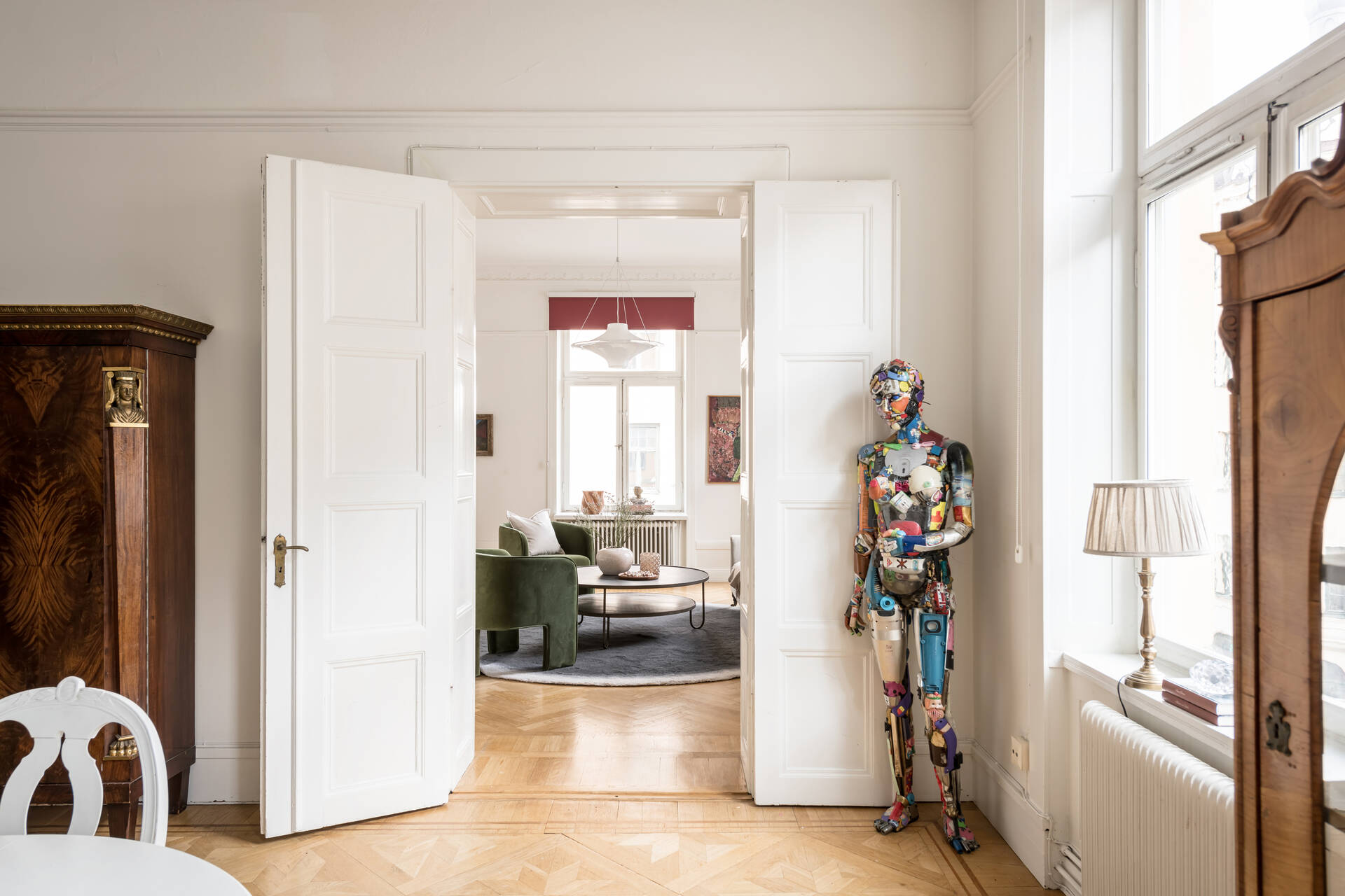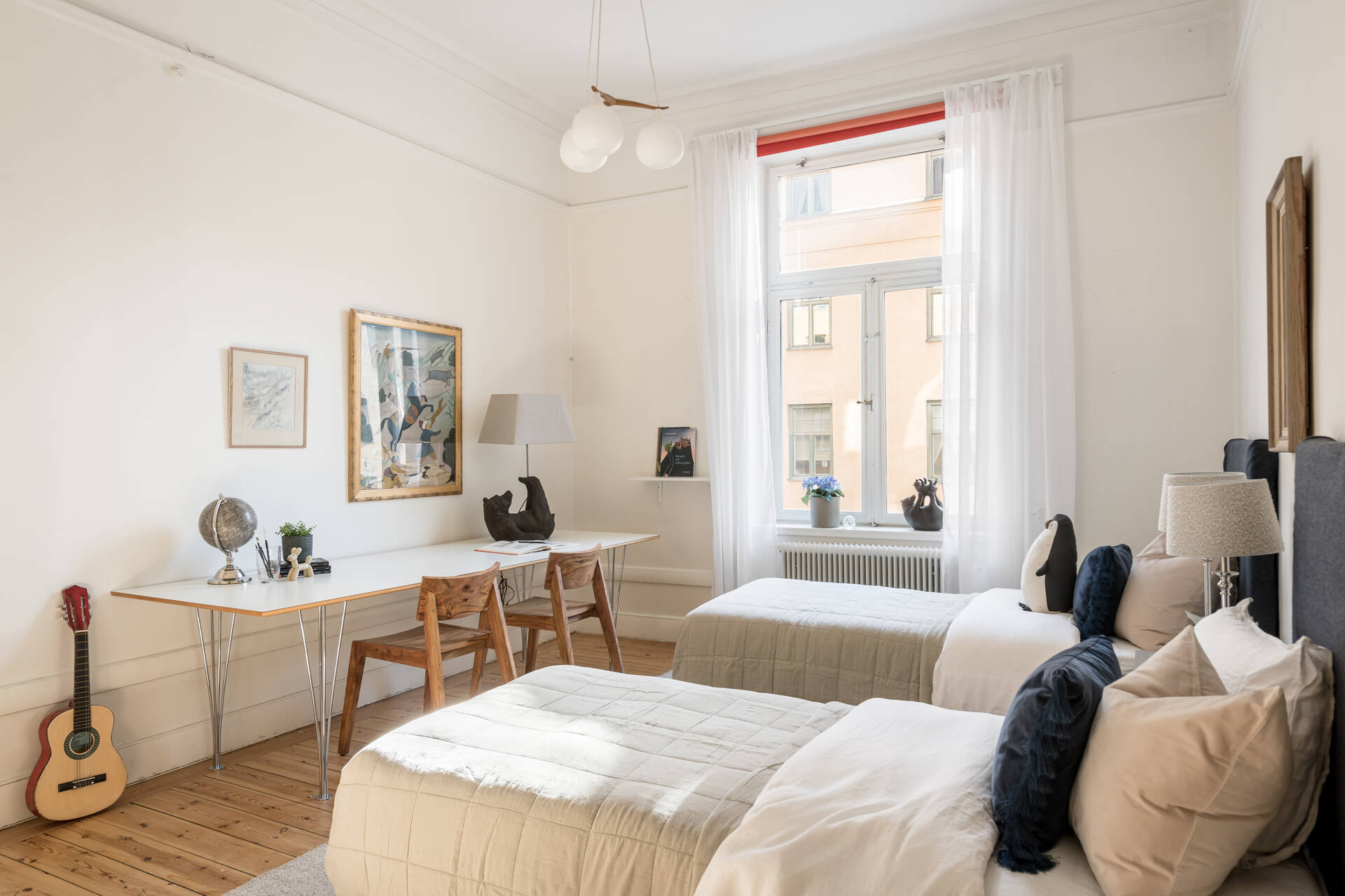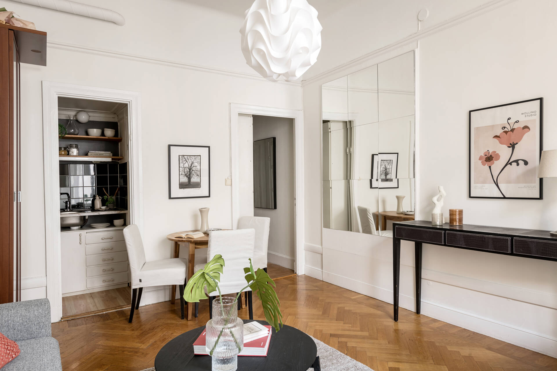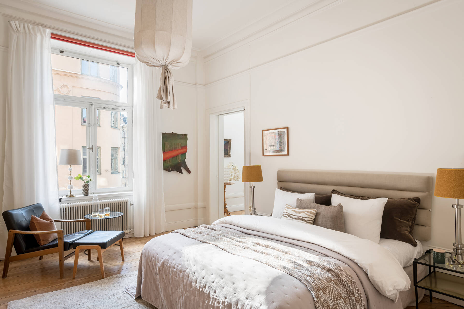 Denna klassiska Östermalmsvåning erbjuder en öppen och luftig atmosfär som genomsyras av tidlös elegans och välbevarade originaldetaljer såsom fiskbensparkett, stuckatur, kakelugnar, stora fönsterpartier, spegeldörrar samt vägg- och taklister. Här bjuds generösa sällskapsytor med tre stora sällskapsrum i fil med utsikt över gatan och Östermalm. Det finns tre bevarade kakelugnar. Tre till fyra stora sovrum. Balkongen mot innergården erbjuder en fridfull reträtt. Fullt utrustat kök som förlängs genom en klassisk serveringsgång med generösa arbetsytor och gott om förvaring. Till lägenheten hör en uthyrningsdel om ett rum med egen ingång. Denna går även att bygga in i huvudvåningen för extra sovrum eller kök. Hela våningen klassas som en lägenhet med tre olika ingångar. Här bor du i en välskött förening med låg belåning på bästa adress i representativ hus anno 1903. Varmt välkommen på visning!