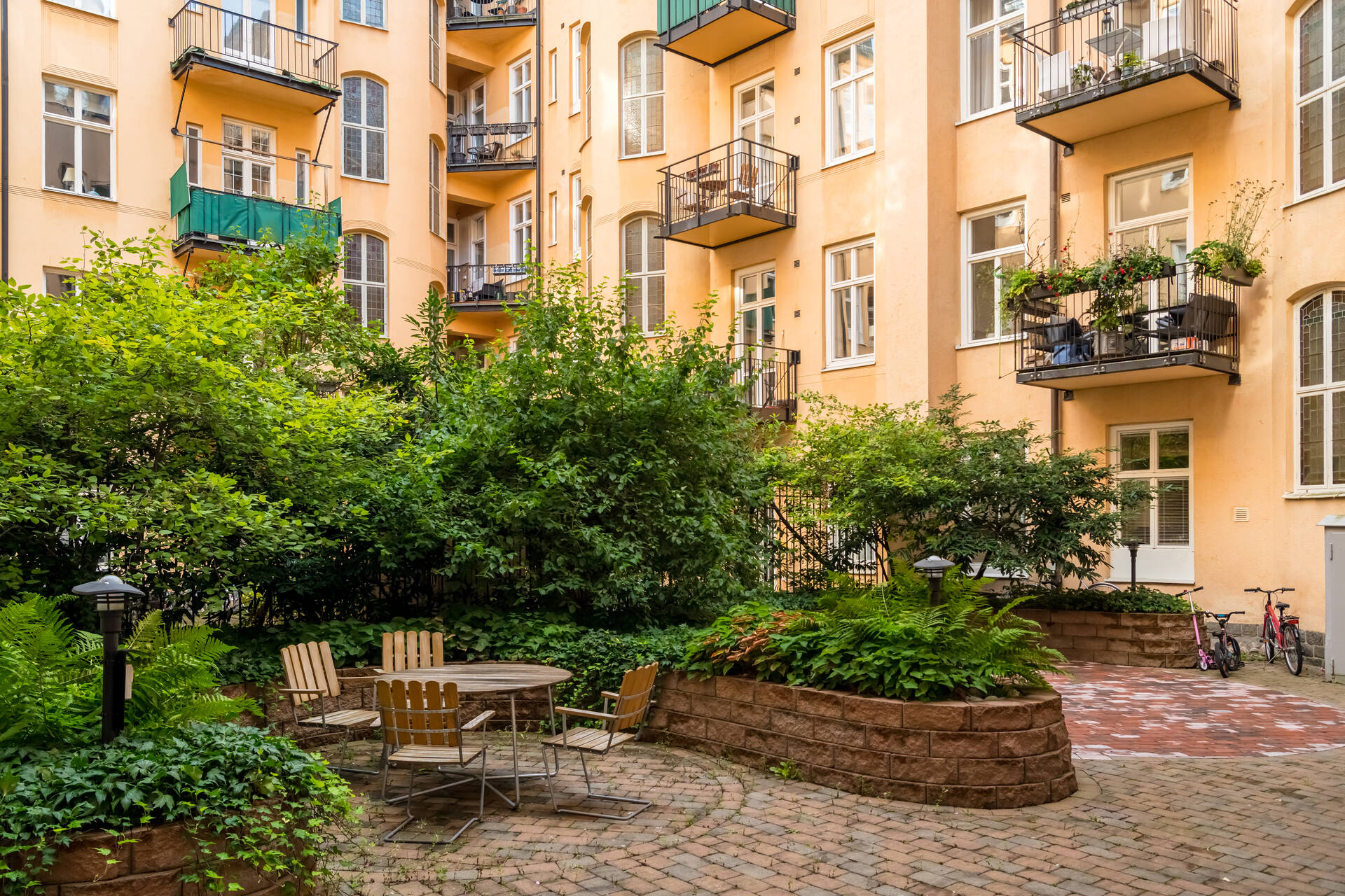 Föreningens gemensamma utrymmen består av tvättstuga, grovsoprum, föreningslokal med pingisbord samt en trevlig innergård med sittgrupp, cykelställ och vackra planteringar.