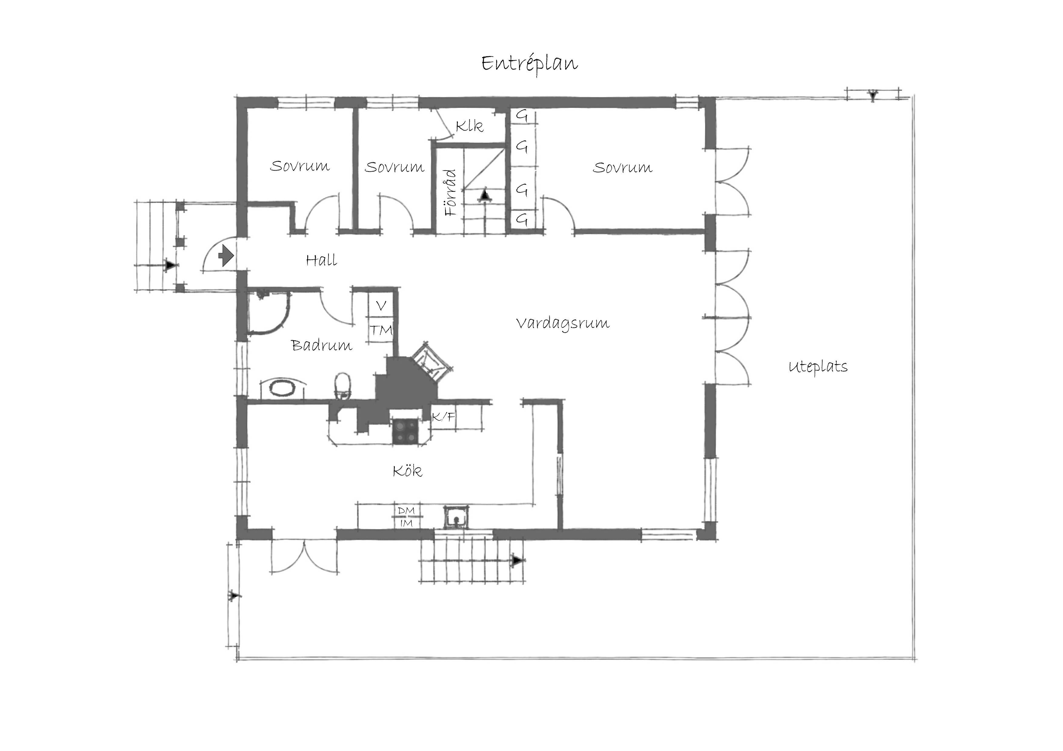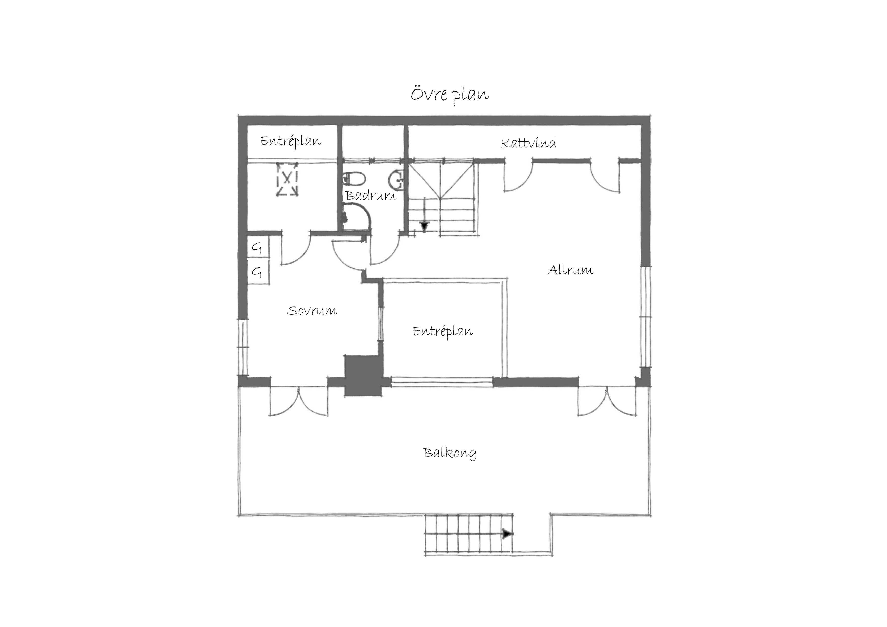 Vardagsrummet är generöst tilltaget i storlek och har öppen spis samt delvis takhöjd upp till nock. Från både köket och vardagsrummet nås en altan, vilken sträcker sig runt den sydvästra gaveln. Allrummet är beläget en trappa upp och har gemytligt snedtak samt sikt ner mot vardagsrummet. Från allrummet nås en terrass med vy över den skyddade viken. Villan har fyra sovrum och två badrum.