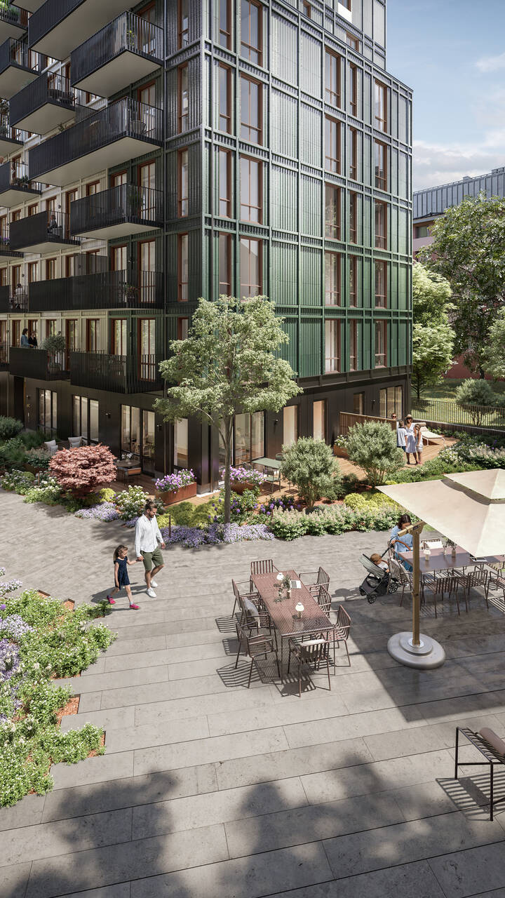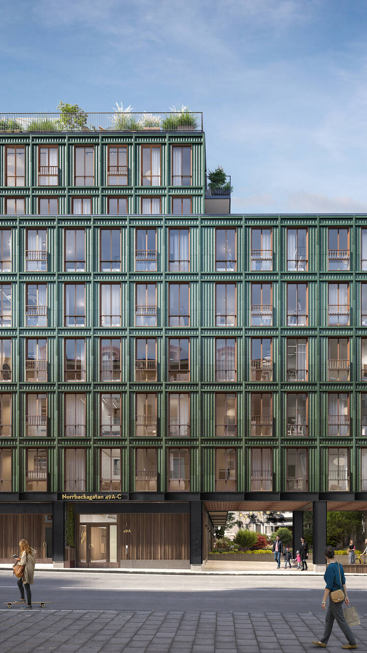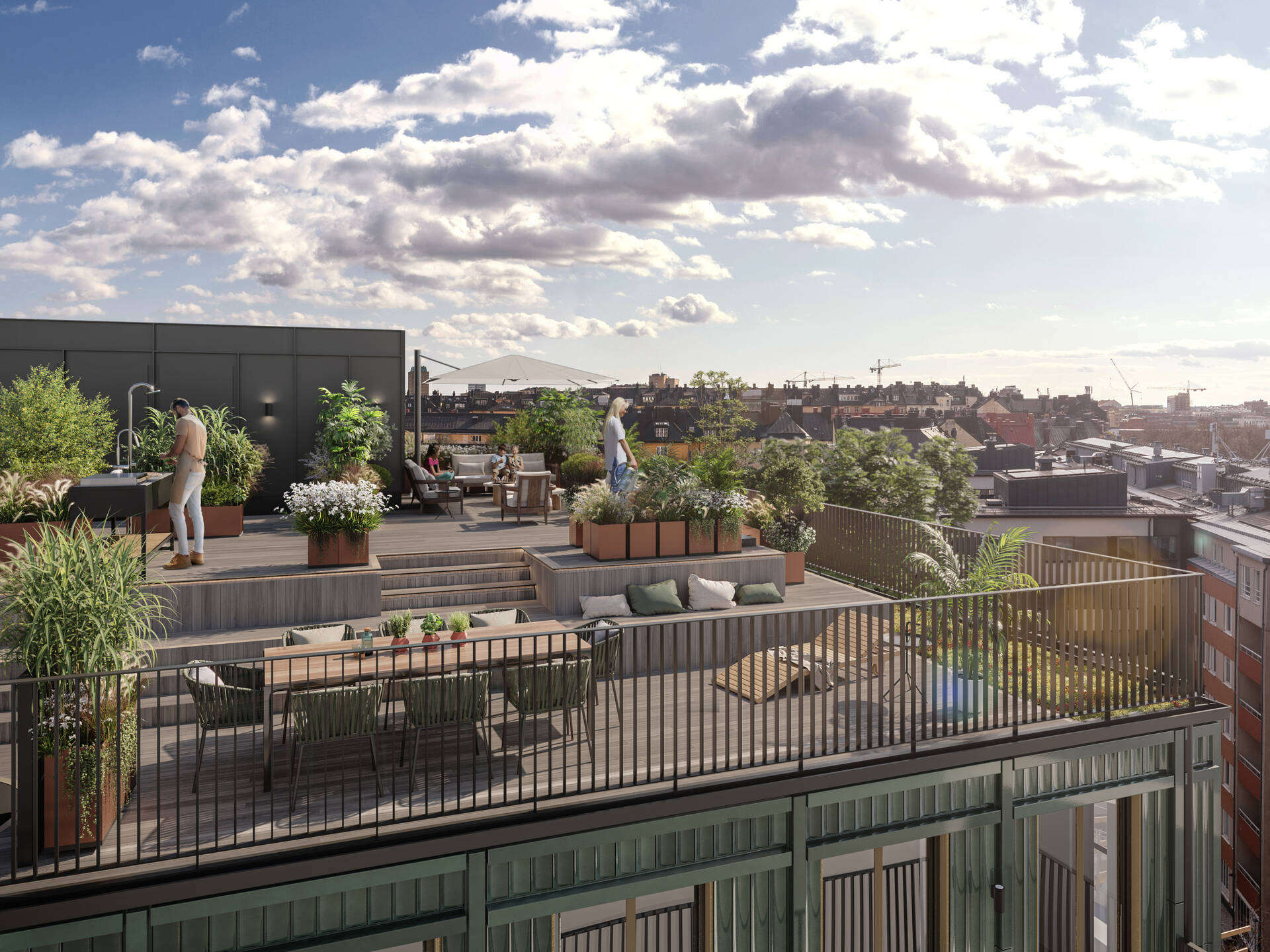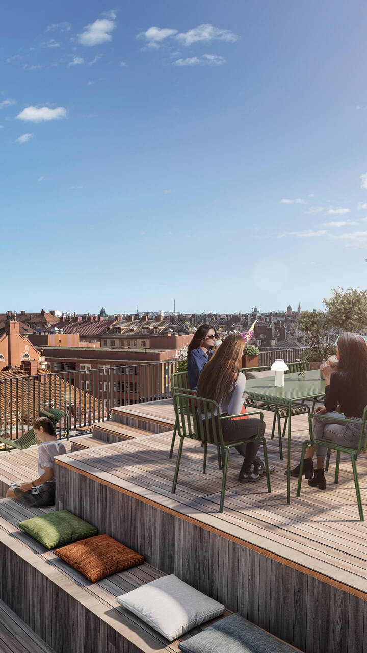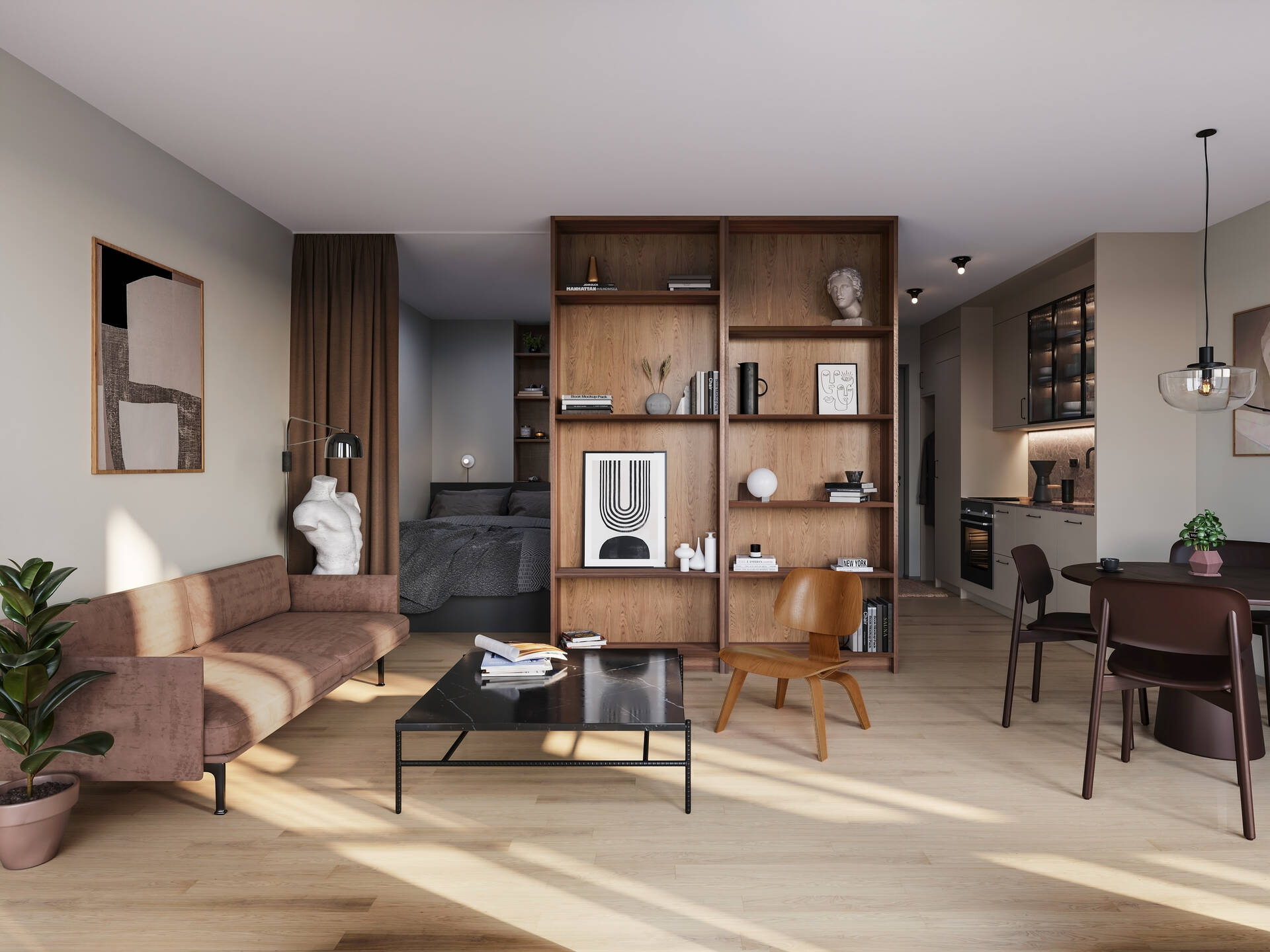 Denna studiolägenhet i ljust och högt läge är oerhört välplanerad, med fina utblickar och noga utvalda material. Den har en fransk balkong och är södervänd med utsikt över den gröna granngården. Fönstren går hela vägen ner till golvet av enstavig borstad parkett. Sovalkoven rymmer säng med plats för två. En nisch i alkoven ger plats för en inbyggd bokhylla för den som vill, och en draperiskena i taket förbereder för avskärmning. Badrummet är kaklat i en sober kulör med kontrasterande svarta detaljer. Här finns golvvärme och är förberett för tvättmaskin. Badrumsdörren är klädd i ek och 2,30 m hög vilket ger en känsla av extra rymd. Bänk och vägg i kök är klädda i en mörk exklusiv kompositsten. I köket finns även ett vitrinskåp med inbyggd belysning, samt diskmaskin och vitvaror av premiumkvalitet.