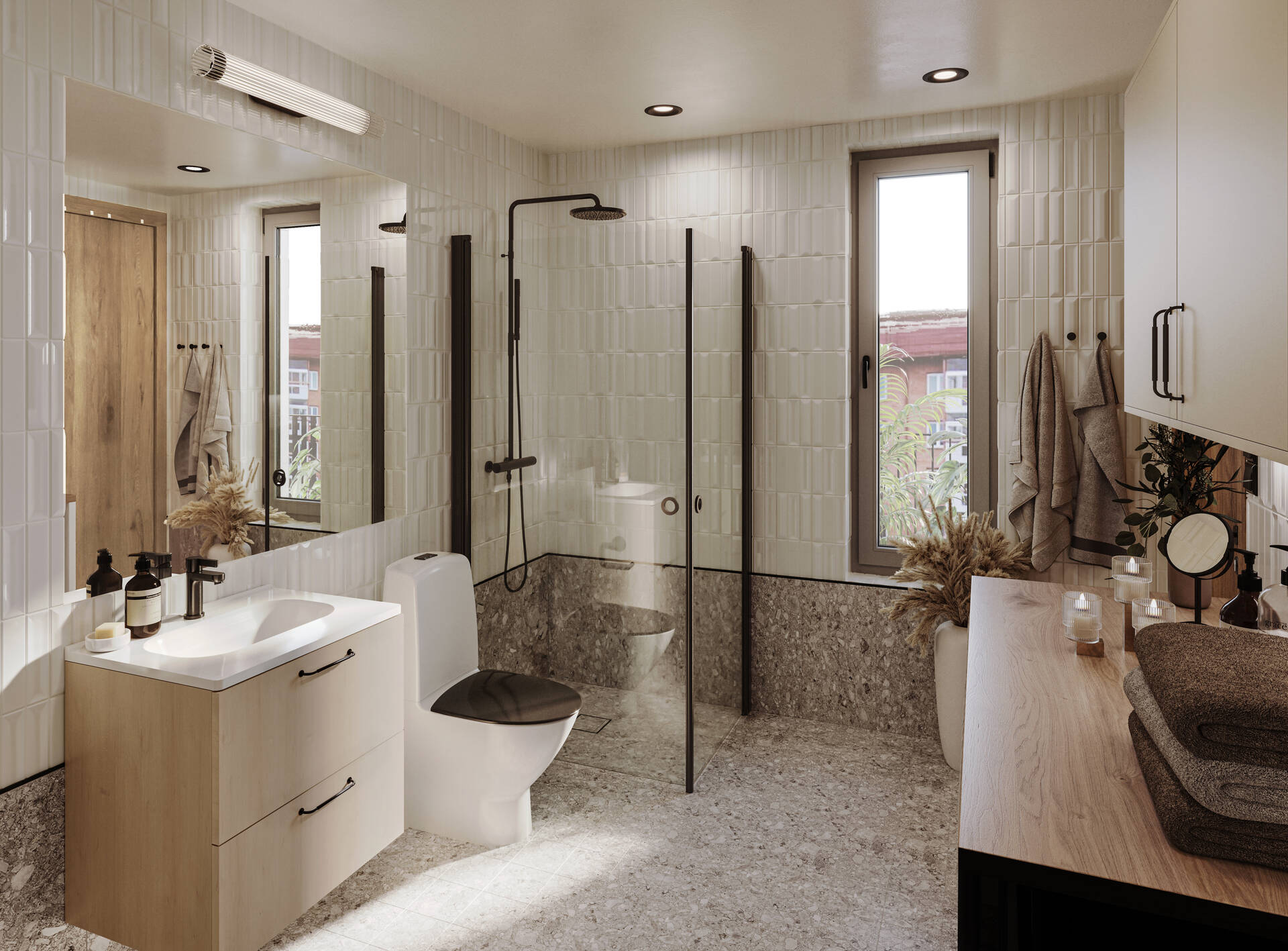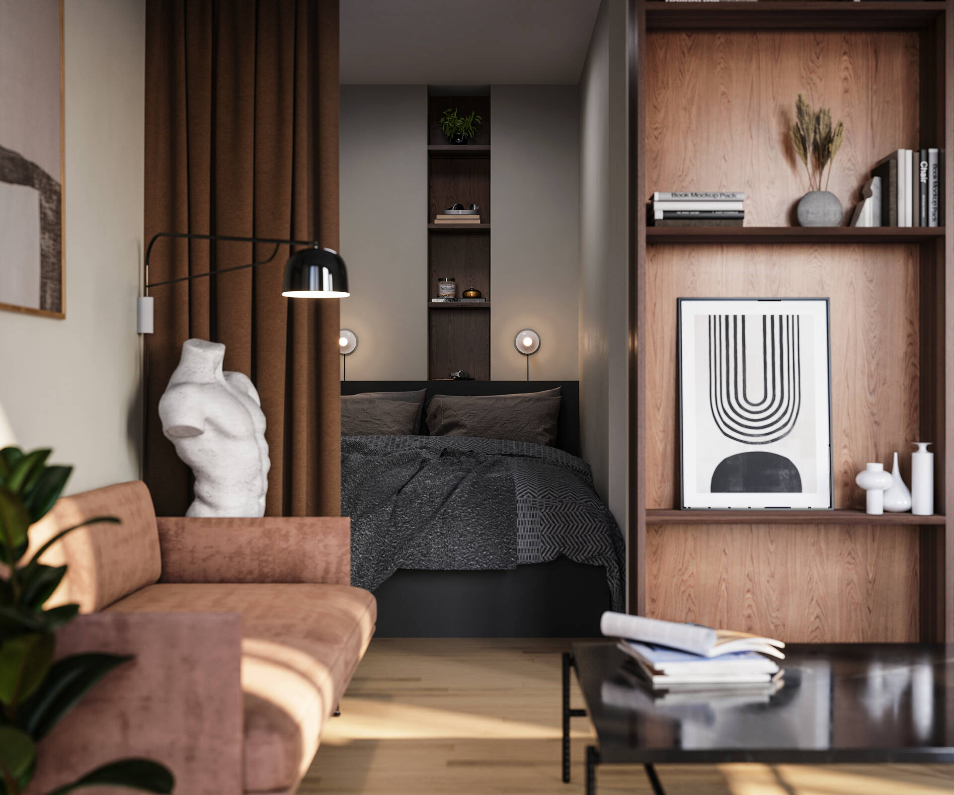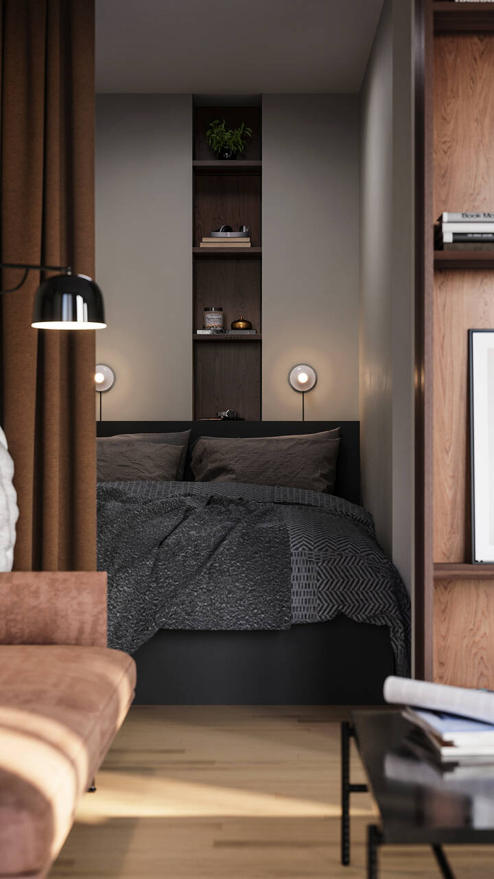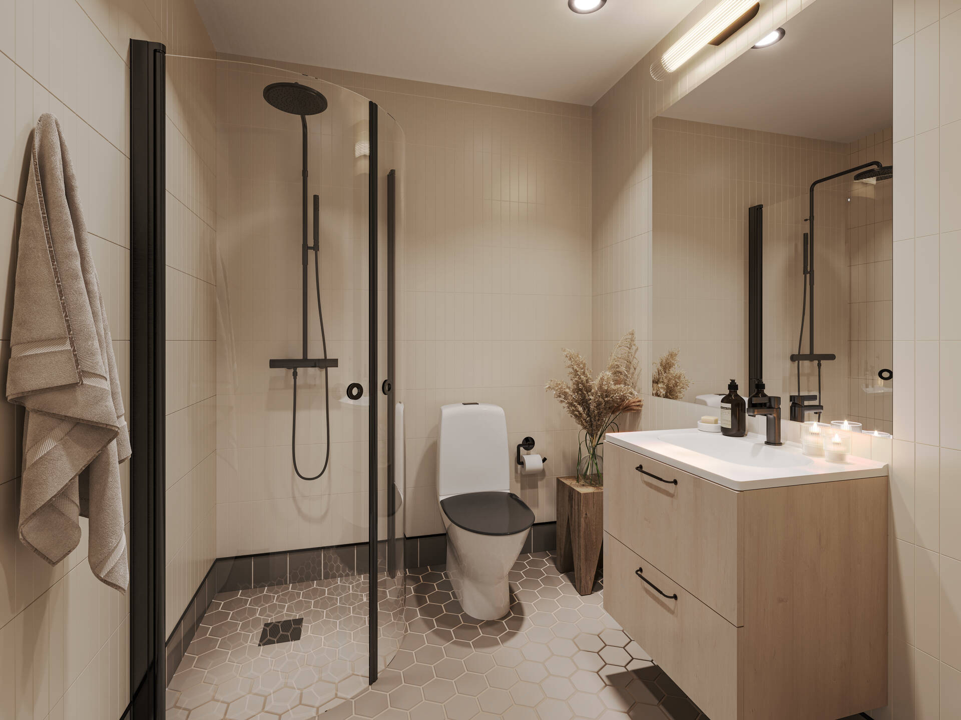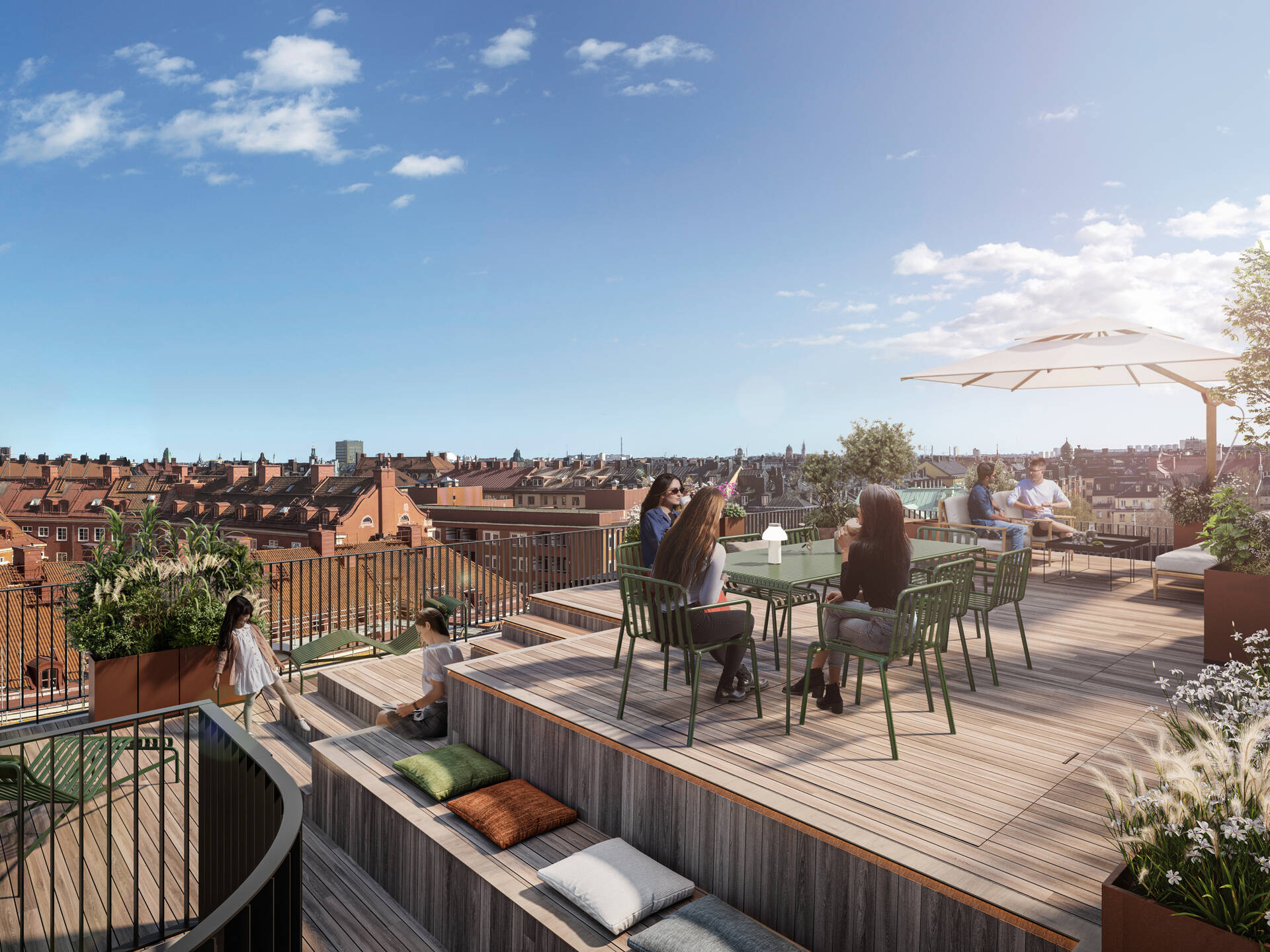 Denna studiolägenhet i ljust och högt läge är oerhört välplanerad, med fina utblickar och noga utvalda material. Den har en fransk balkong och är södervänd med utsikt över den gröna granngården. Fönstren går hela vägen ner till golvet av enstavig borstad parkett. Sovalkoven rymmer säng med plats för två. En nisch i alkoven ger plats för en inbyggd bokhylla för den som vill, och en draperiskena i taket förbereder för avskärmning. Badrummet är kaklat i en sober kulör med kontrasterande svarta detaljer. Här finns golvvärme och är förberett för tvättmaskin. Badrumsdörren är klädd i ek och 2,30 m hög vilket ger en känsla av extra rymd. Bänk och vägg i kök är klädda i en mörk exklusiv kompositsten. I köket finns även ett vitrinskåp med inbyggd belysning, samt diskmaskin och vitvaror av premiumkvalitet.
