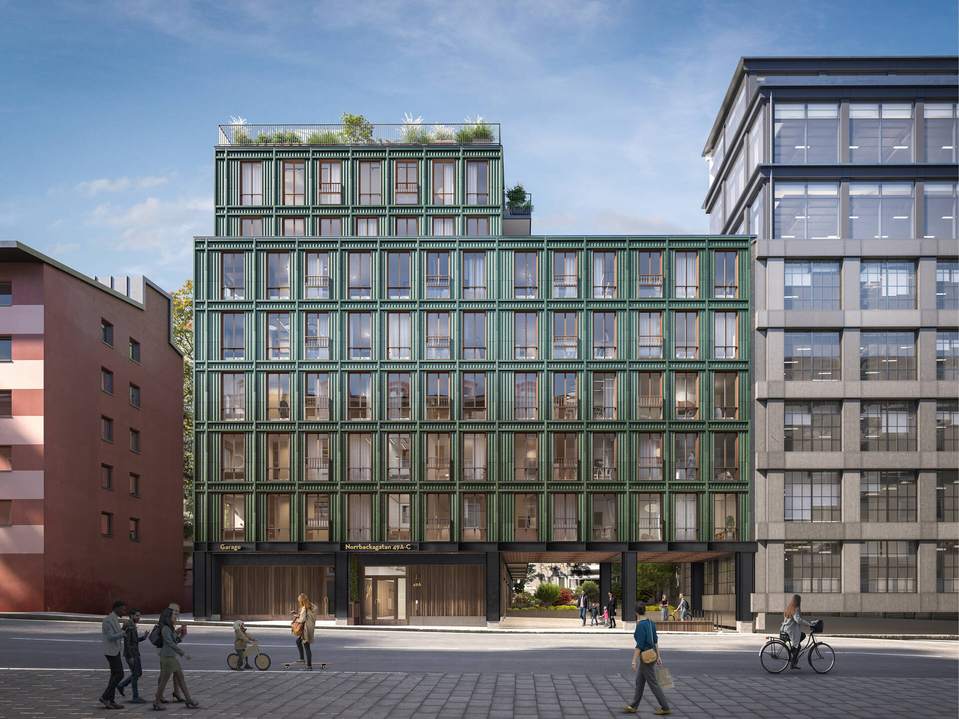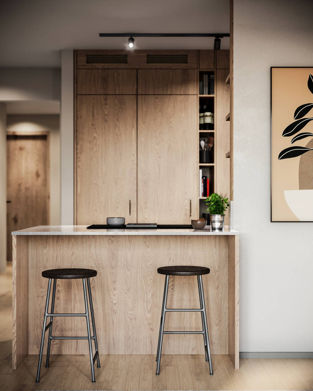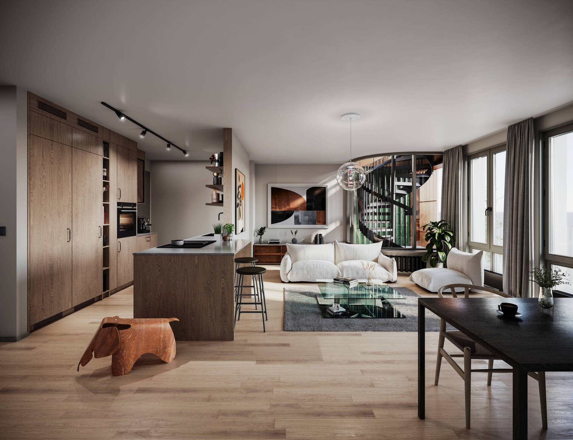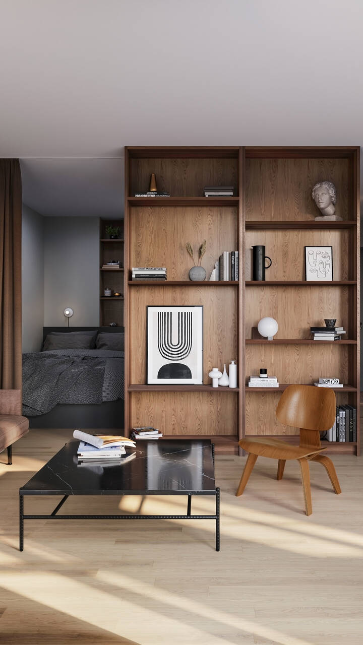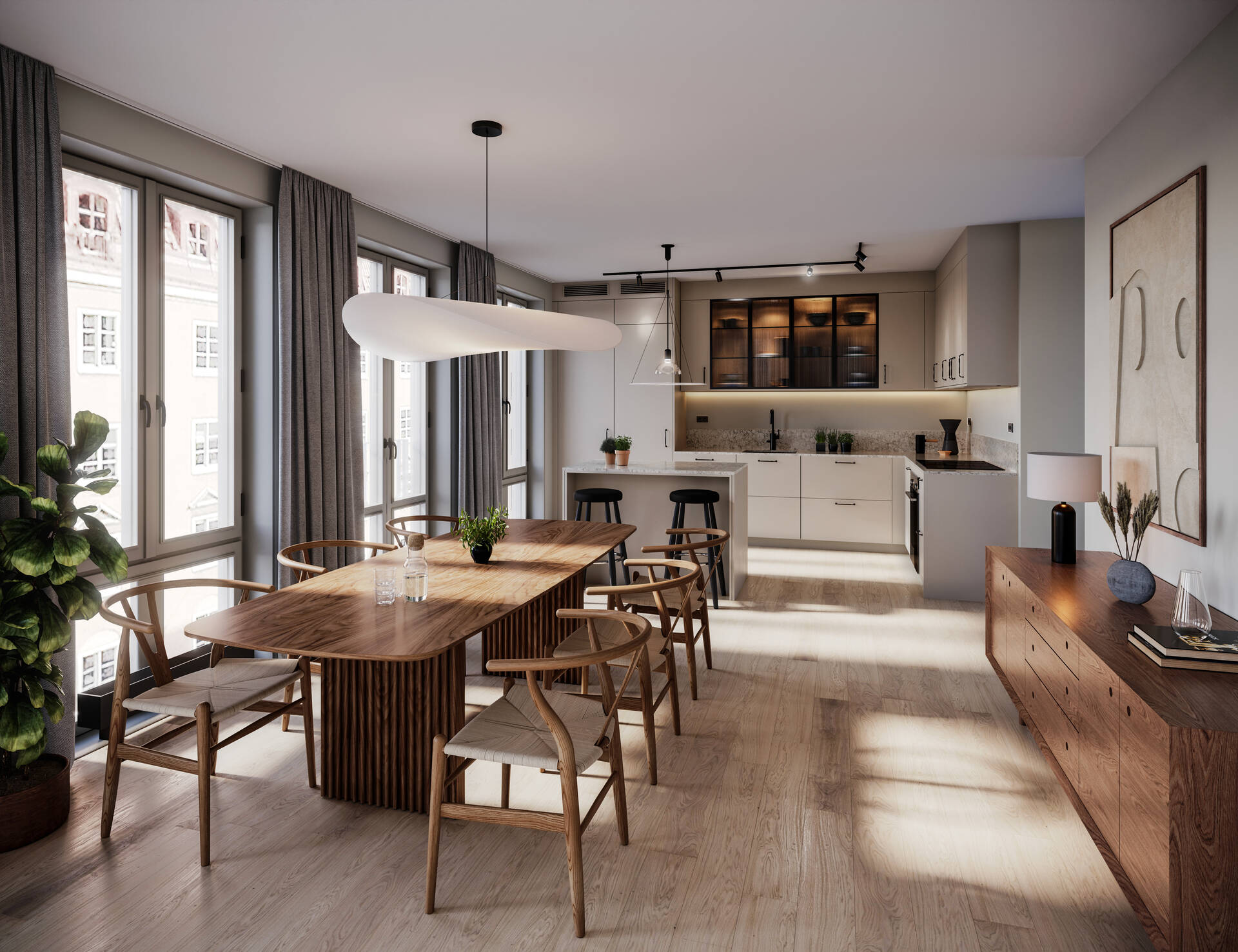 Denna studiolägenhet i ljust och högt läge är oerhört välplanerad, med fina utblickar och noga utvalda material. Den har en fransk balkong och är södervänd med utsikt över den gröna granngården. Fönstren går hela vägen ner till golvet av enstavig borstad parkett. Sovalkoven rymmer säng med plats för två. En nisch i alkoven ger plats för en inbyggd bokhylla för den som vill, och en draperiskena i taket förbereder för avskärmning. Badrummet är kaklat i en sober kulör med kontrasterande svarta detaljer. Här finns golvvärme och är förberett för tvättmaskin. Badrumsdörren är klädd i ek och 2,30 m hög vilket ger en känsla av extra rymd. Bänk och vägg i kök är klädda i en mörk exklusiv kompositsten. I köket finns även ett vitrinskåp med inbyggd belysning, samt diskmaskin och vitvaror av premiumkvalitet.
