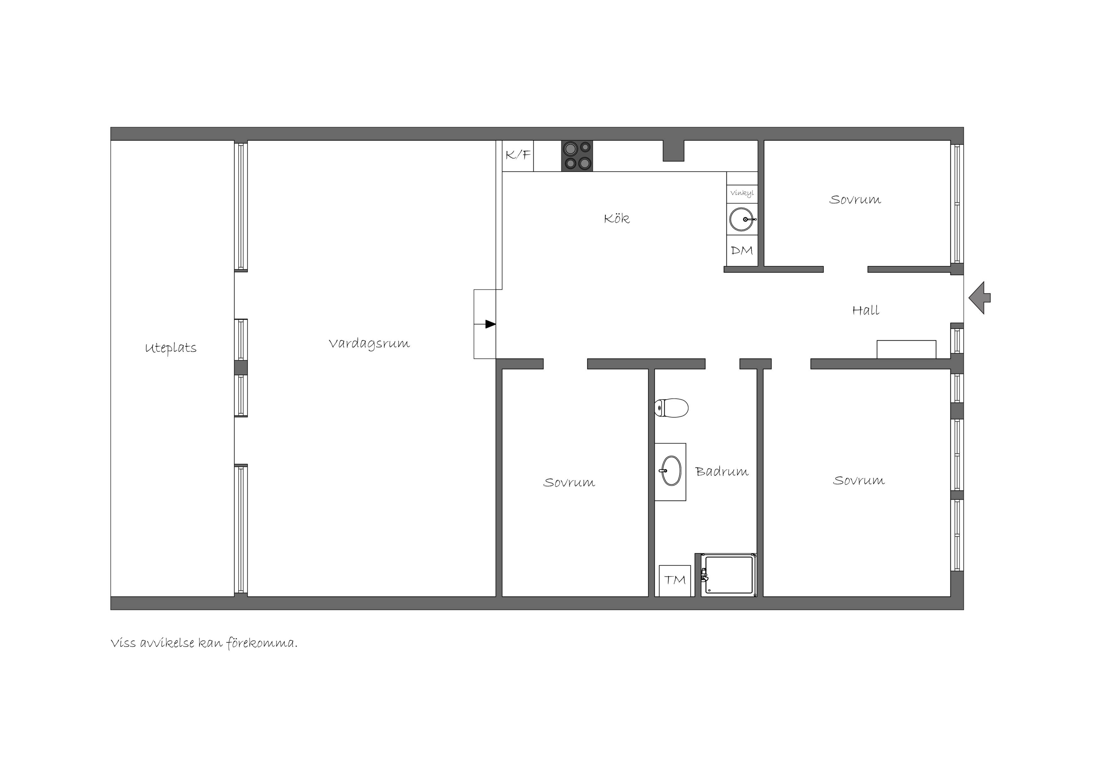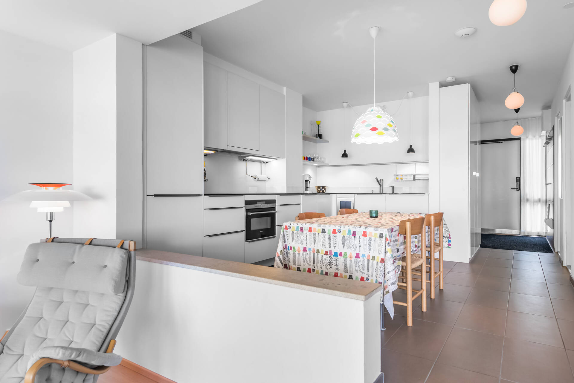 Det ljusa vardagsrummet är rymligt och erbjuder flexibla möbleringsmöjligheter samt direkt access till terrassen. De tre sovrummen är genomtänkta och funktionella med goda förvaringsmöjligheter. Badrummet är helkaklat i vitt och svart och erbjuder bekvämligheter såsom tvättmaskin, vägghängd toalett och handdukstork.
