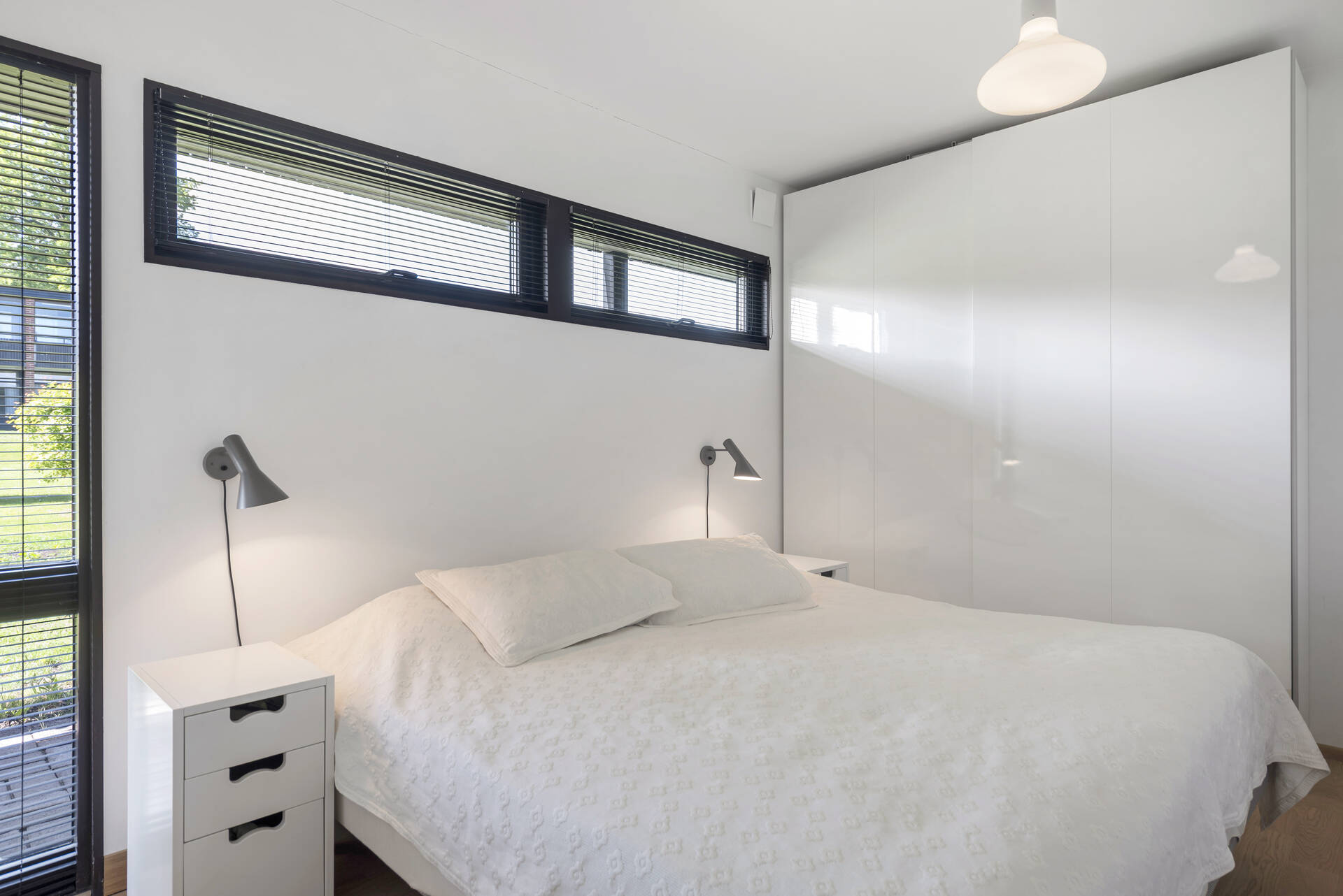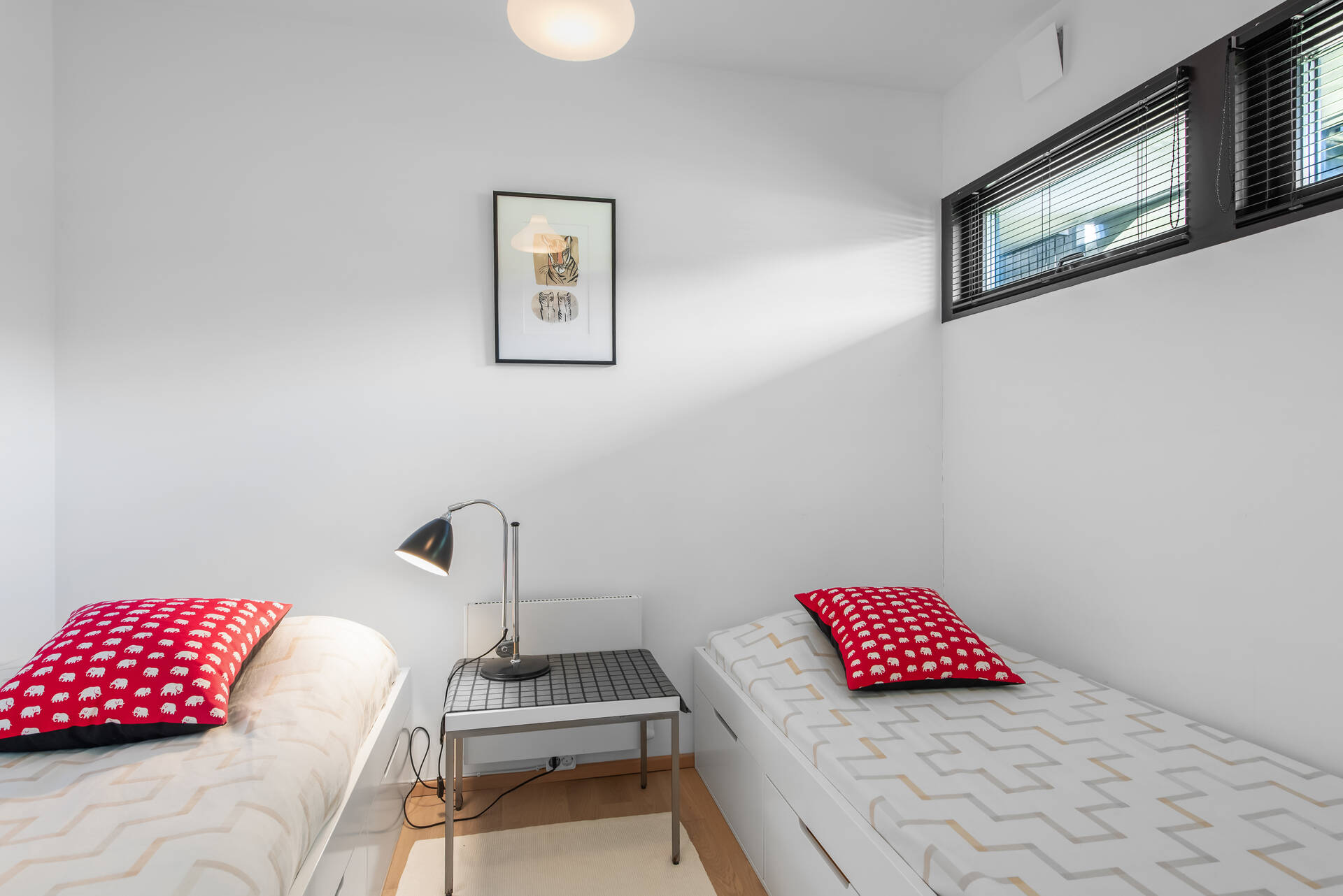 Sovrum 1: Nya trägolv (Kährs 16mm), nya ytskick väggar, nytt innertak, ny el, nytt element, ny innevägg inklusive skjutdörr (massiv, ljuddämpad)