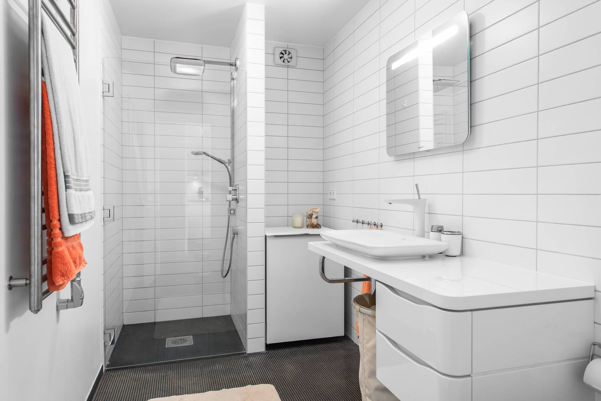 Badrum: Helt nytt badrum med ny grund (isolerbetong), golvvärme, uppvärmd handdukshållare (Nordhem), nytt kakel och klinker (från italienska Appiani) och inner tak, handfat, toalettstol (vägghängd), spegel och komod från Duravit, dusch (rain shower) och handfatsarmatur från Hans-Grohe och tvätt/torkmaskin från Siemens, duschdörr från Ire, ny dörr med dörram