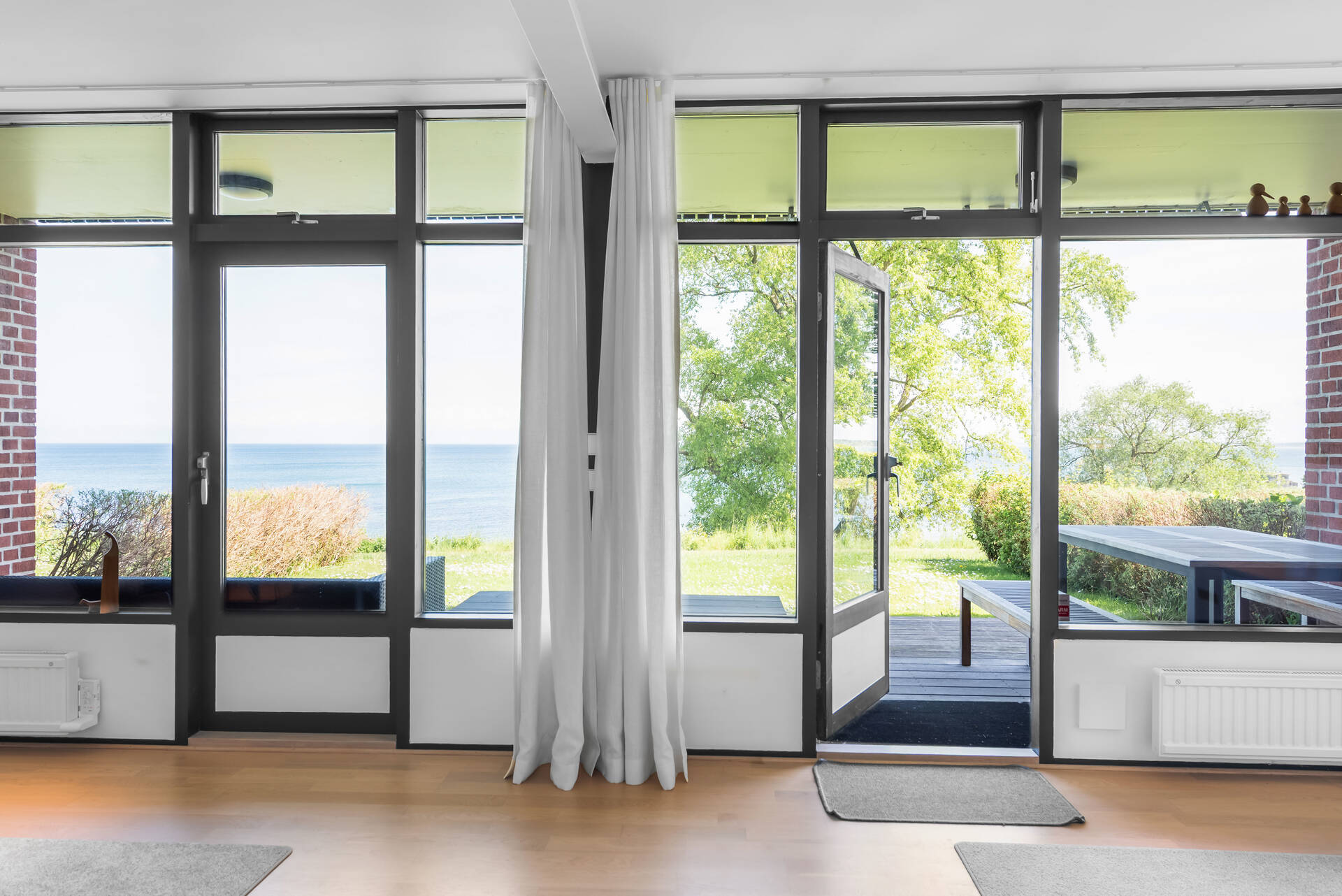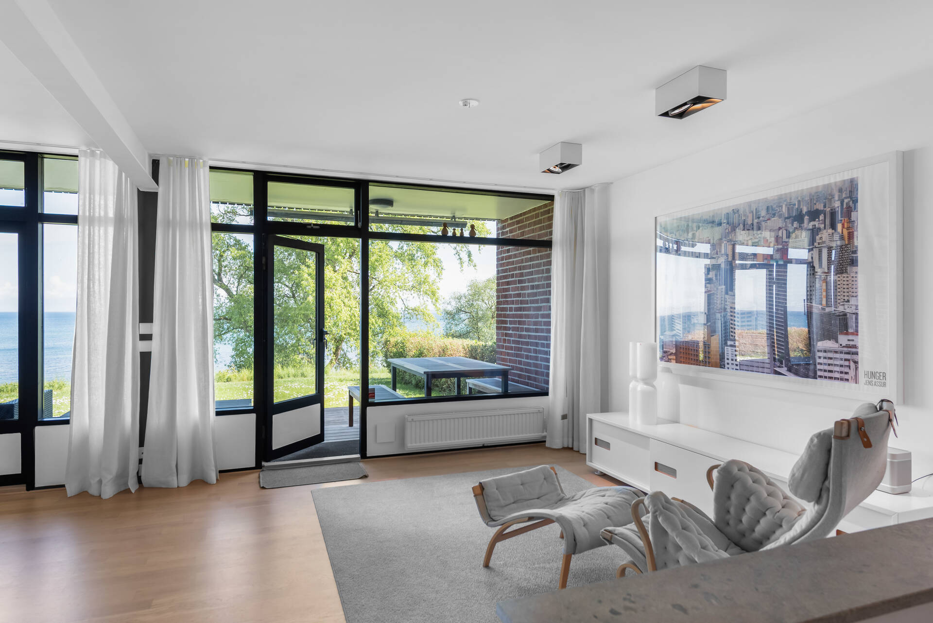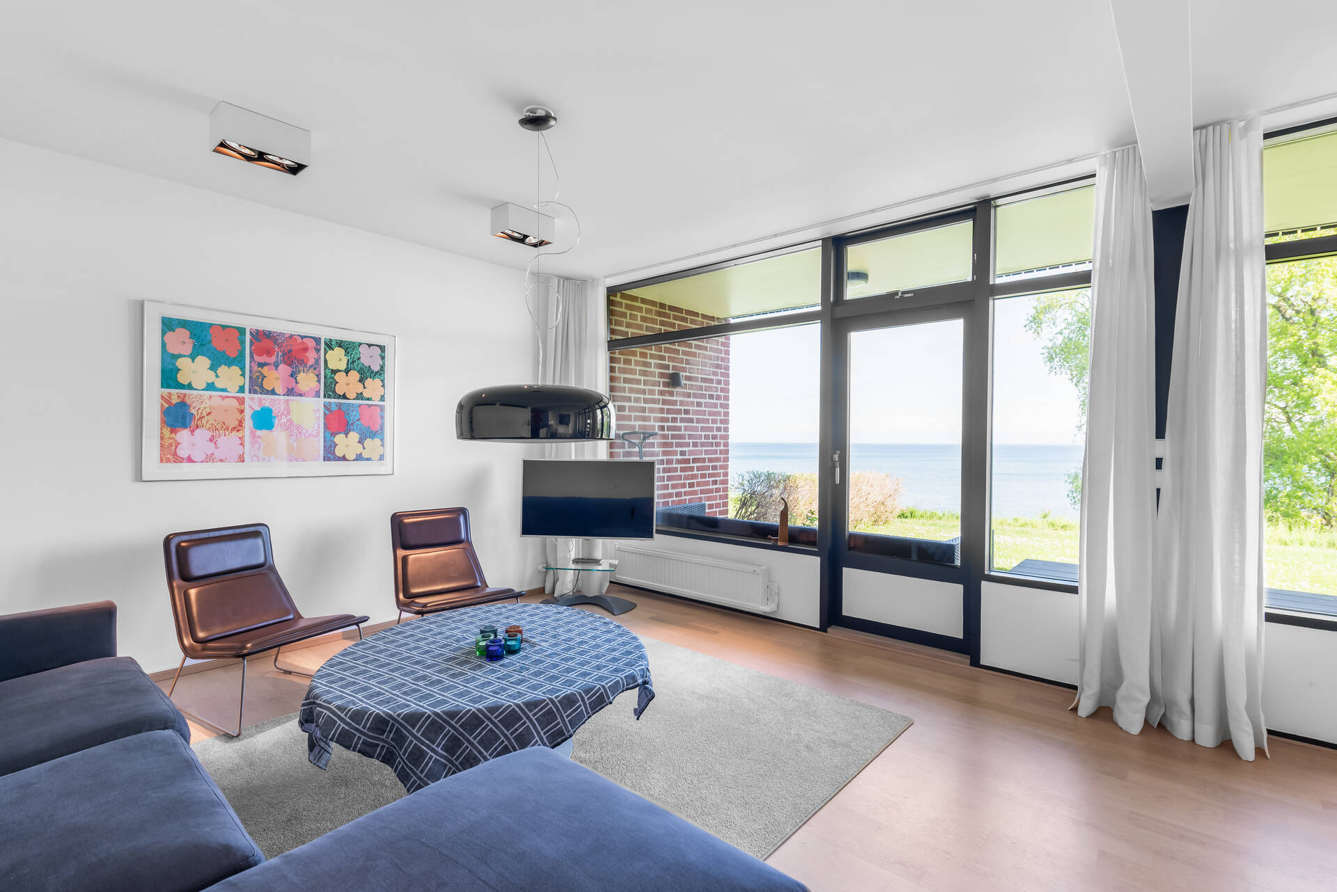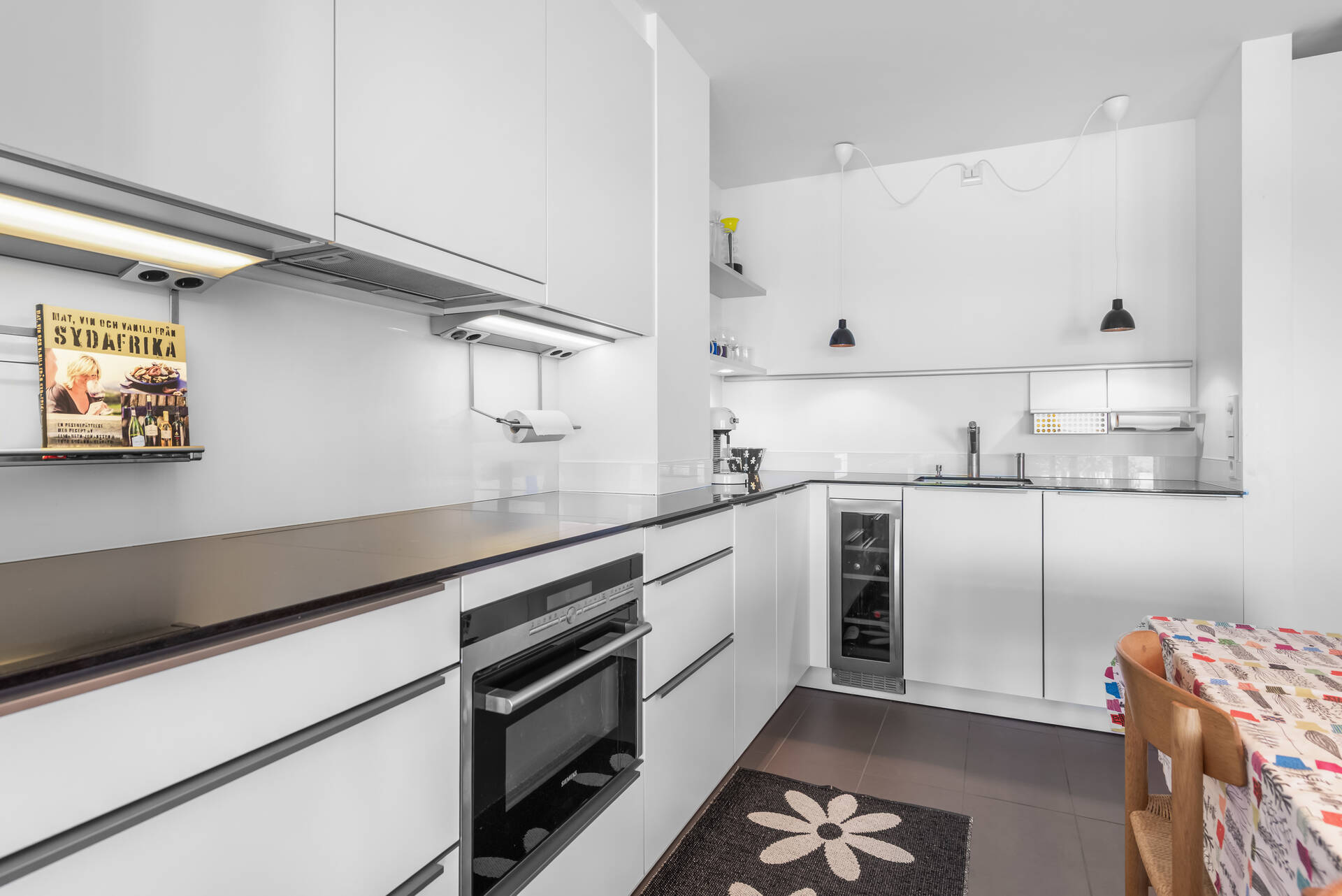 Entrén välkomnar med mörkt klinkergolv och vita väggar, vilket skapar ett modernt och elegant intryck. Köket är utrustat med högkvalitativa vitvaror, såsom inbyggd vinkyl, ugn, samt svart bänkskiva i sten som kontrasterar stilrent mot de vita skåpluckorna. Planlösningen bjuder på en öppen känsla med kontakt mellan kök och vardagsrum, där stora fönster öppnar upp för en fantastisk utsikt över havet.