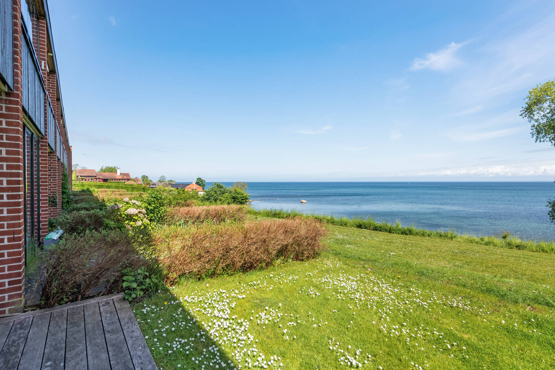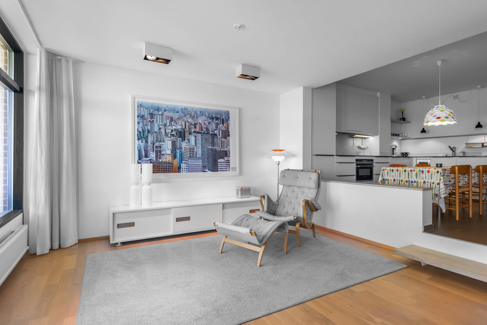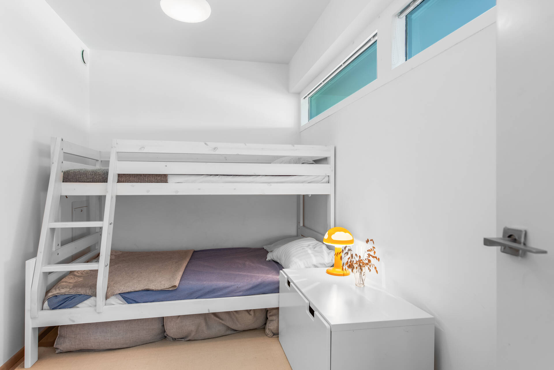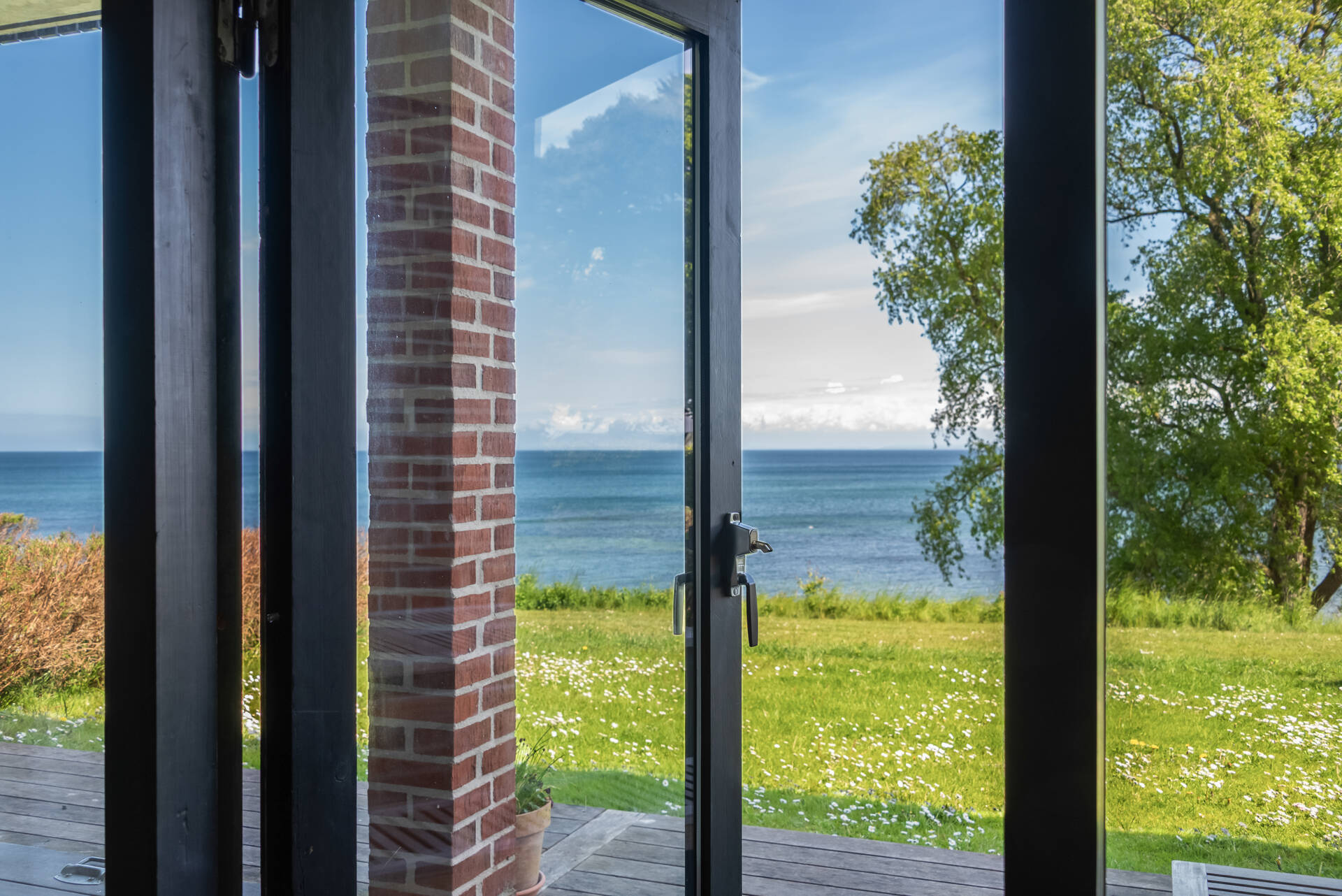 Entrén välkomnar med mörkt klinkergolv och vita väggar, vilket skapar ett modernt och elegant intryck. Köket är utrustat med högkvalitativa vitvaror, såsom inbyggd vinkyl, ugn, samt svart bänkskiva i sten som kontrasterar stilrent mot de vita skåpluckorna. Planlösningen bjuder på en öppen känsla med kontakt mellan kök och vardagsrum, där stora fönster öppnar upp för en fantastisk utsikt över havet.