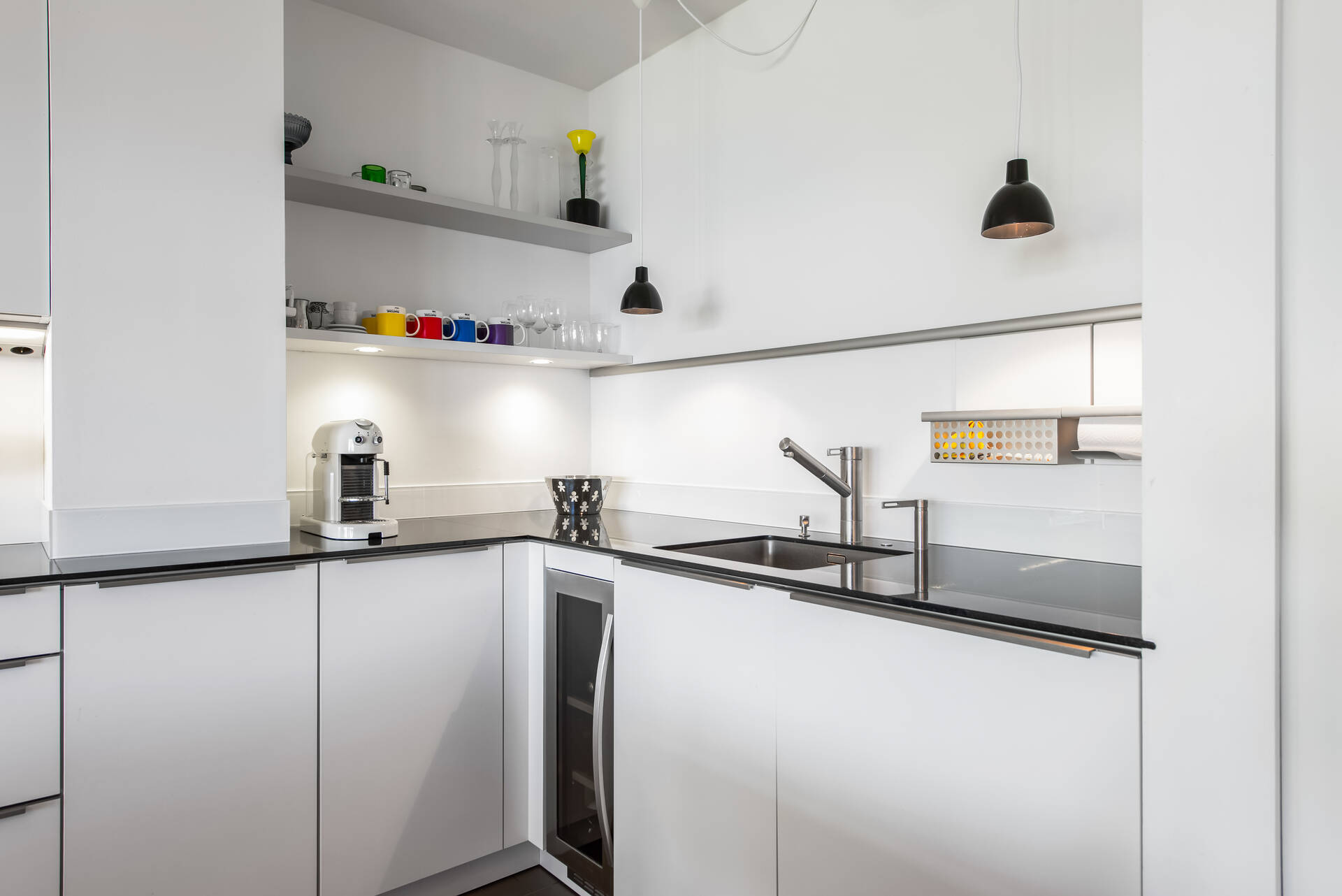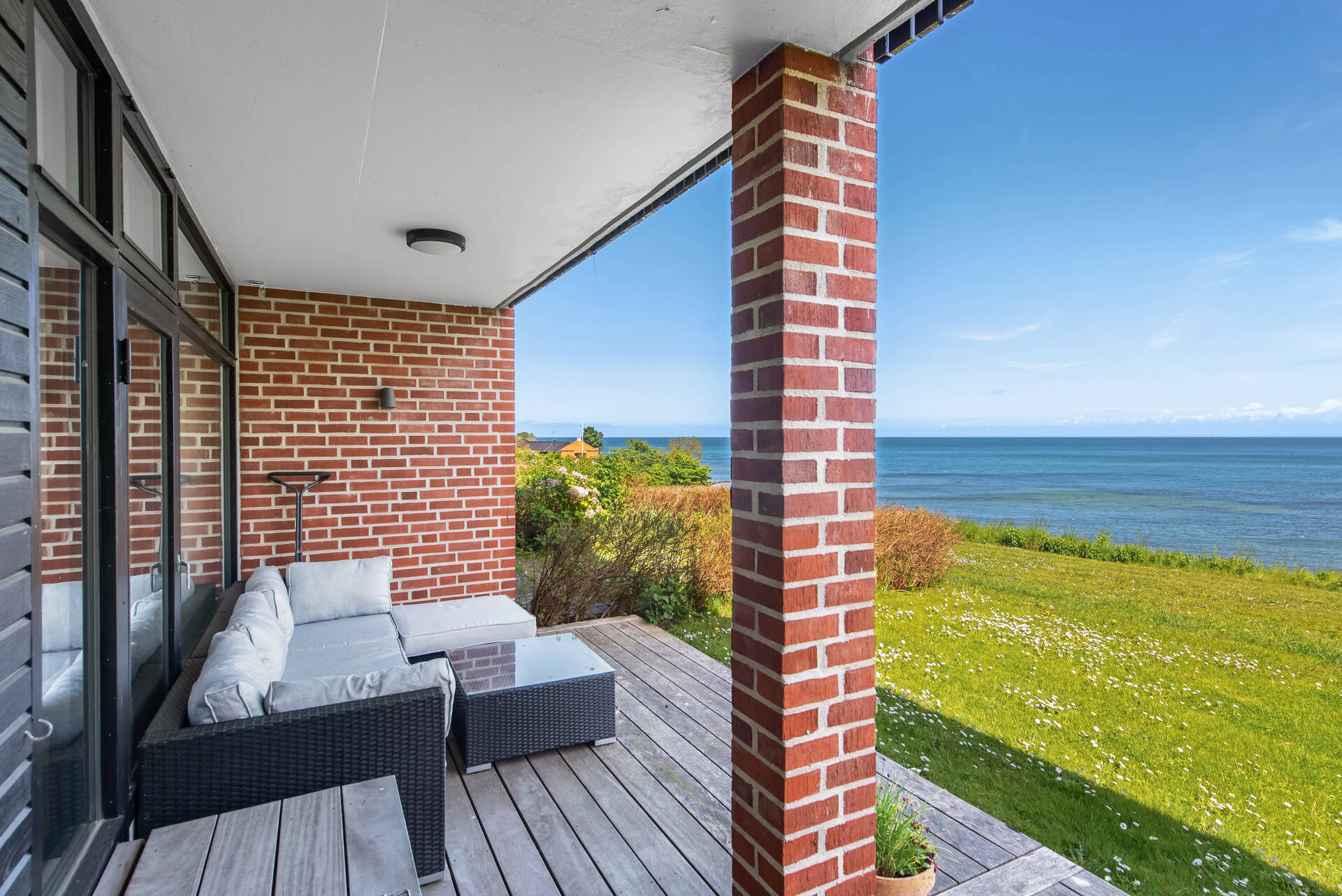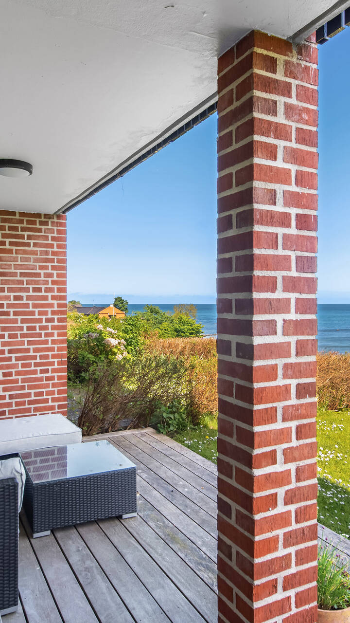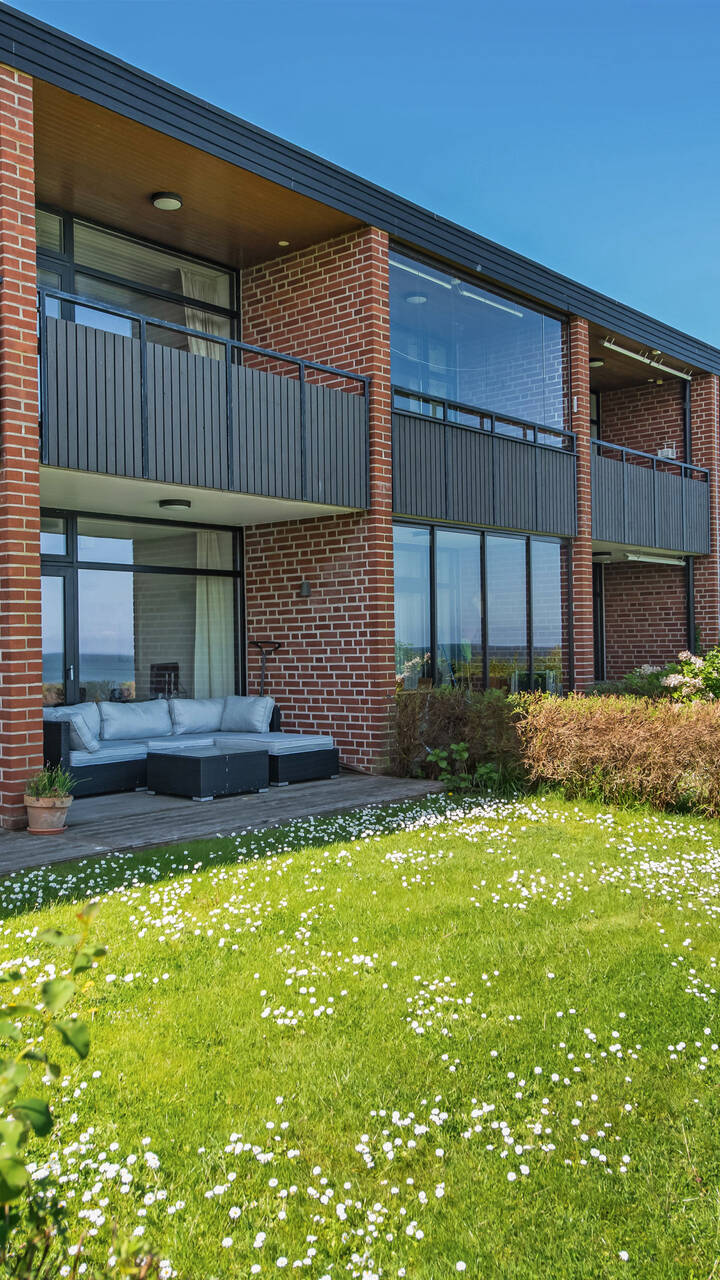Entrén välkomnar med mörkt klinkergolv och vita väggar, vilket skapar ett modernt och elegant intryck. Köket är utrustat med högkvalitativa vitvaror, såsom inbyggd vinkyl, ugn, samt svart bänkskiva i sten som kontrasterar stilrent mot de vita skåpluckorna. Planlösningen bjuder på en öppen känsla med kontakt mellan kök och vardagsrum, där stora fönster öppnar upp för en fantastisk utsikt över havet.