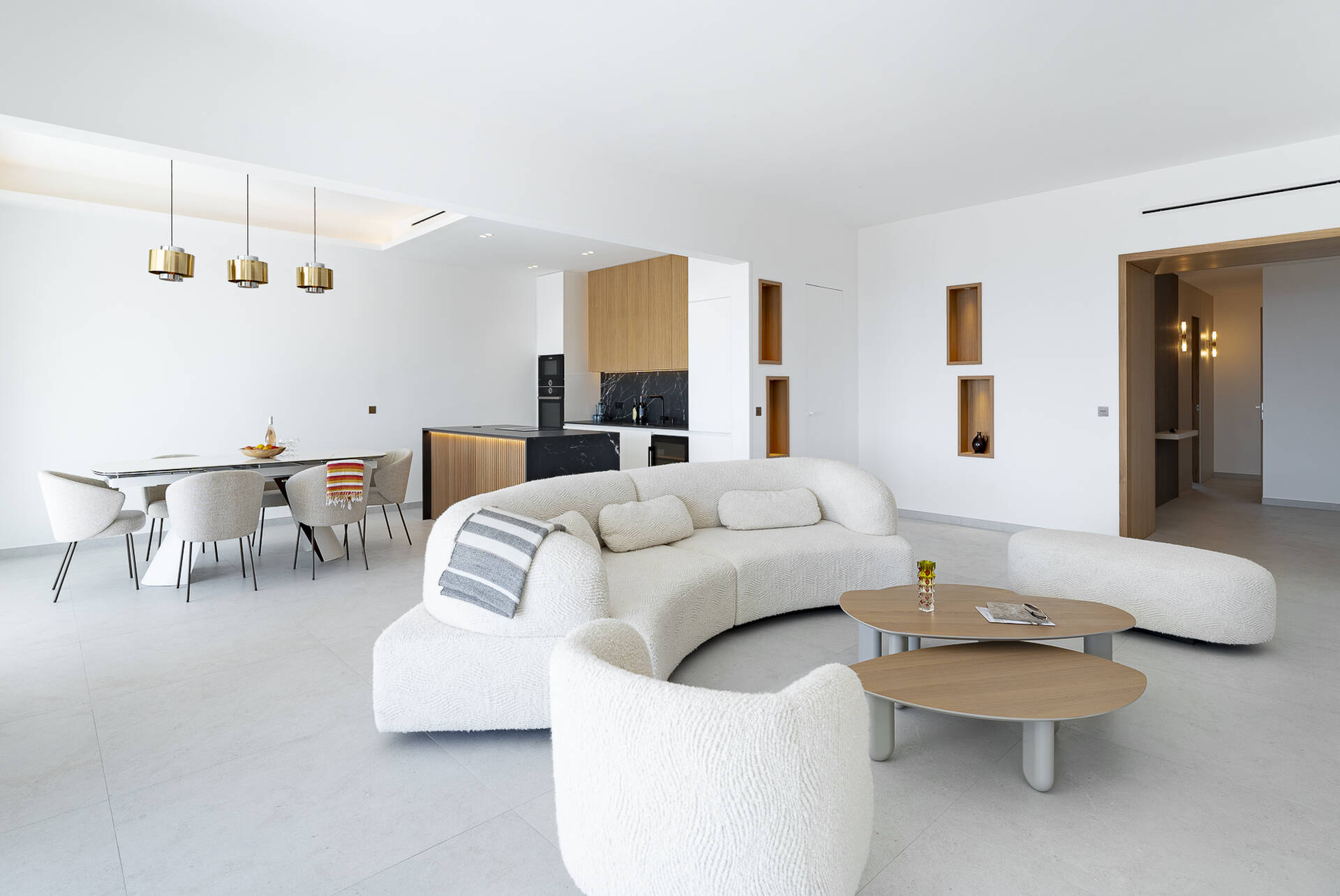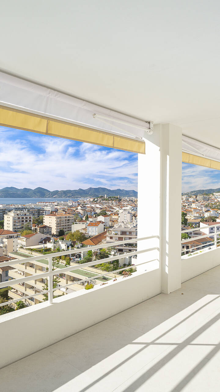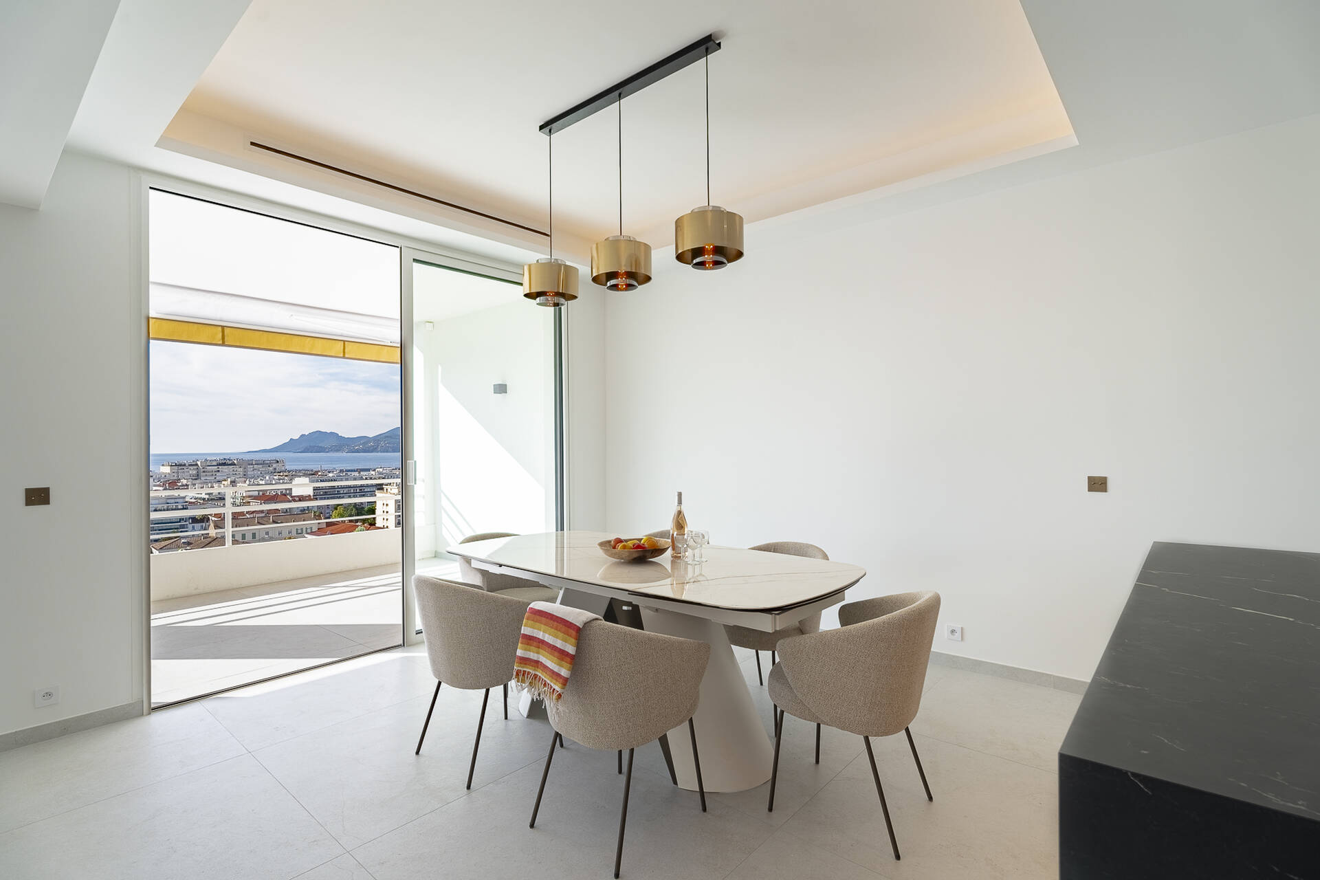 Den består av en rymlig entré med inbyggd garderob och separat toilette. Ett stort, ljust vardagningsrum med matsal och ett fullt utrustat öppet kök som leder ut till en solig terrass på 27 kvm med en imponerande panoramautsikt över Medelhavet och Cannes.