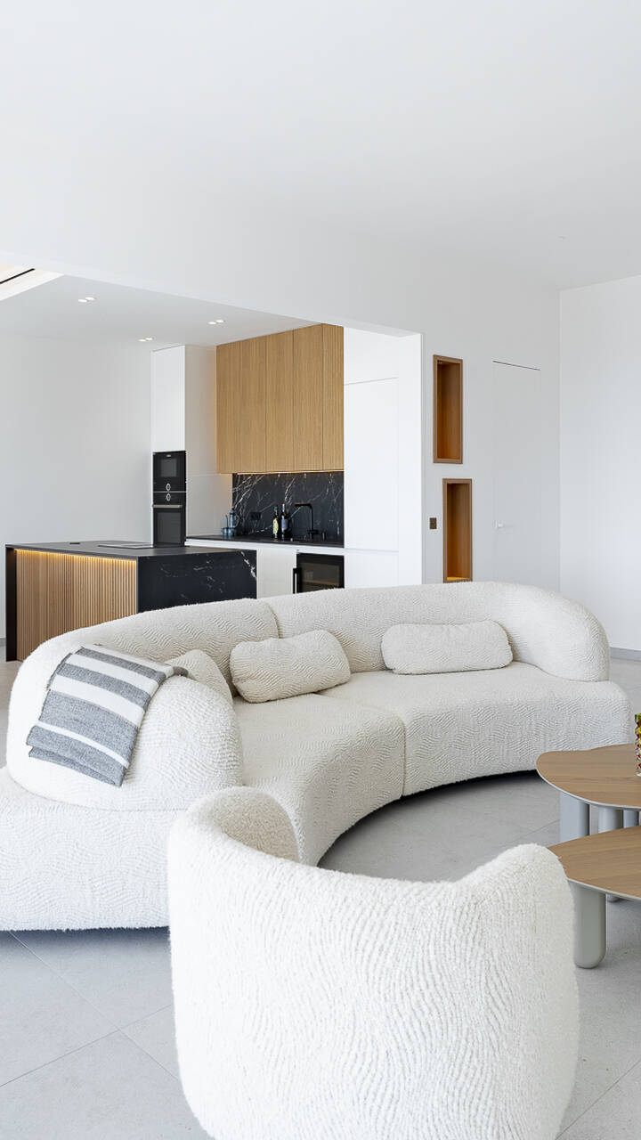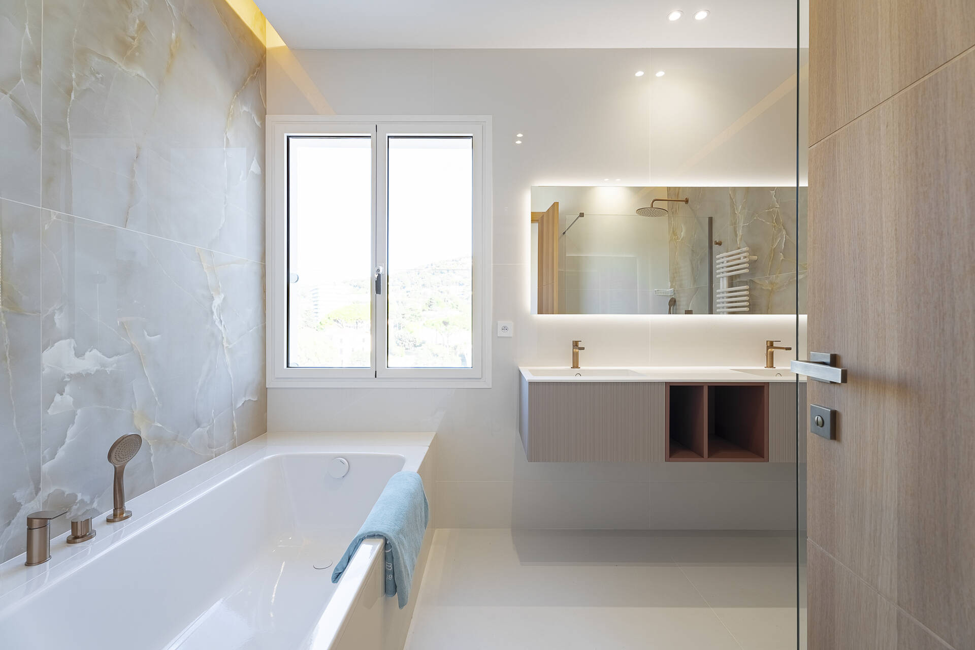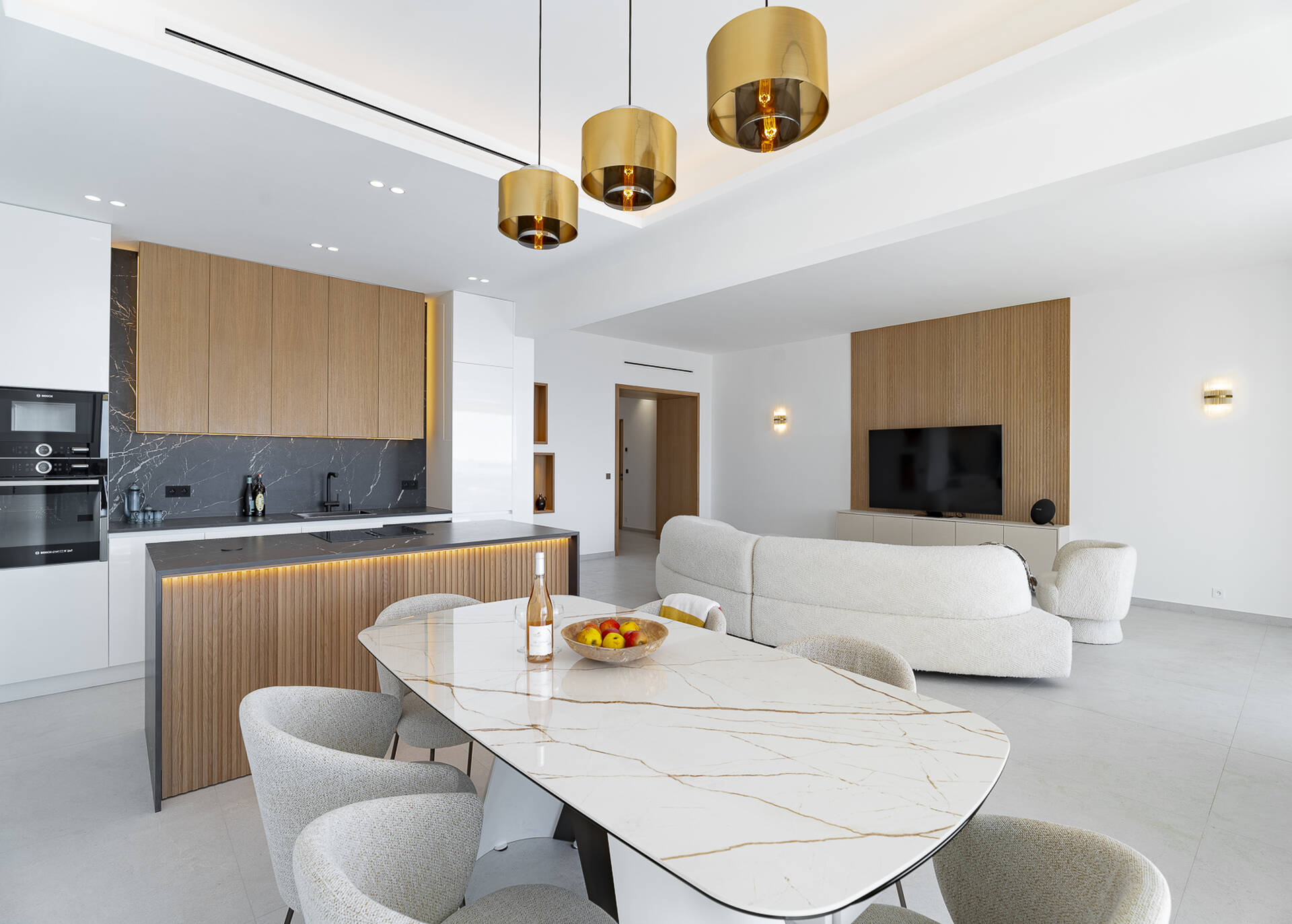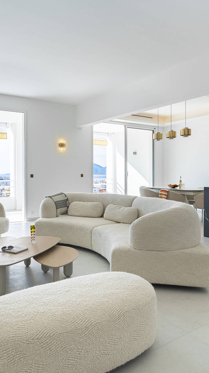Den består av en rymlig entré med inbyggd garderob och separat toilette. Ett stort, ljust vardagningsrum med matsal och ett fullt utrustat öppet kök som leder ut till en solig terrass på 27 kvm med en imponerande panoramautsikt över Medelhavet och Cannes.