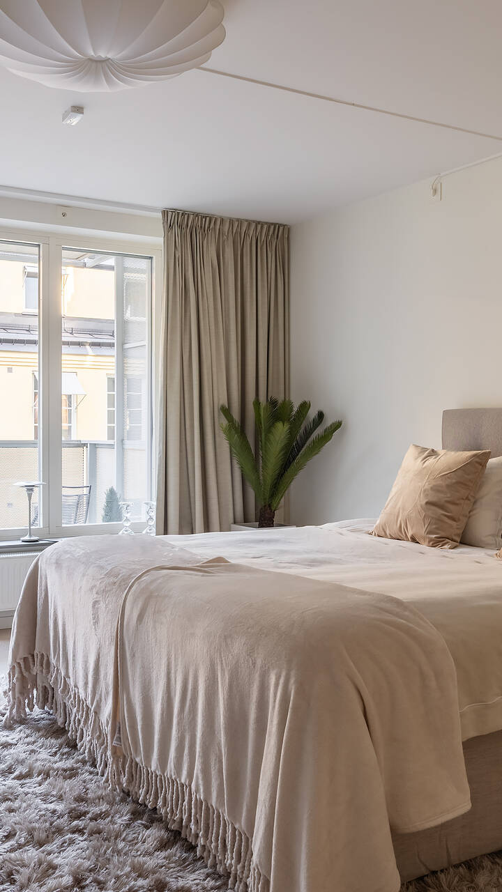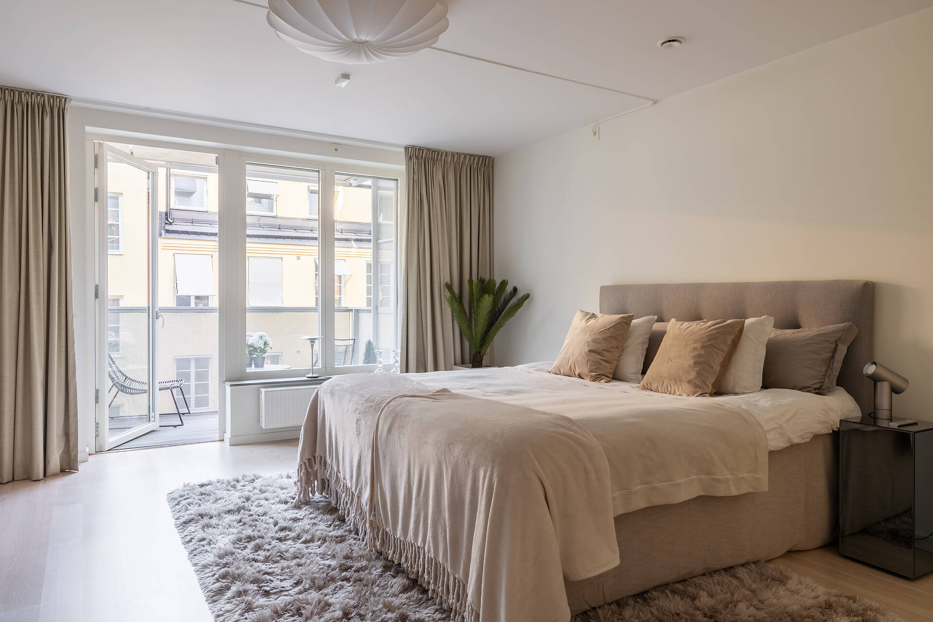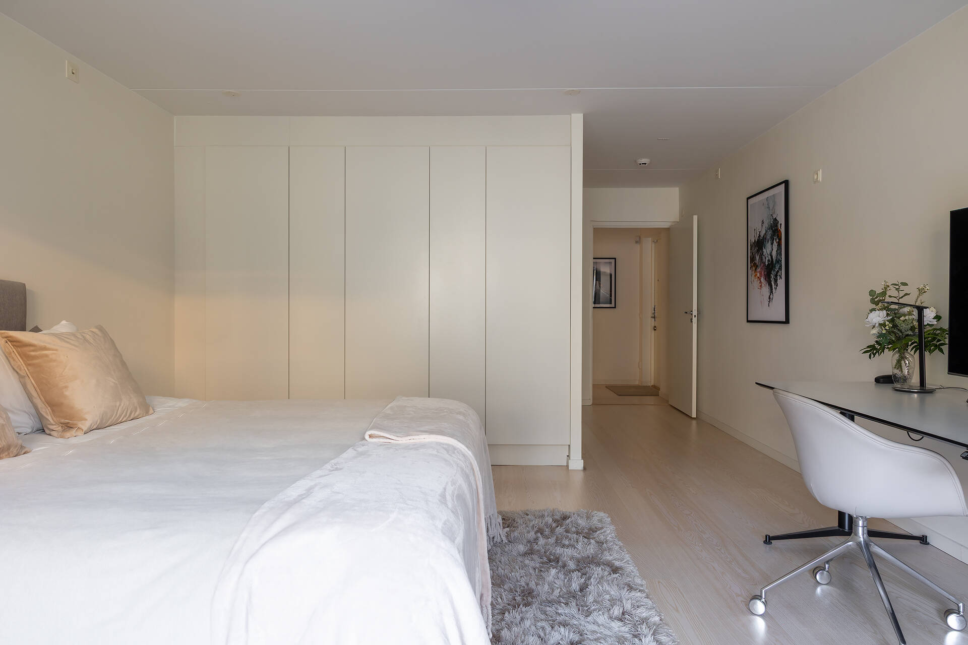 Generöst sovrum med plats för dubbelsäng och förvaring i platsbyggd garderobslvägg. Utgång till balkong mot gården.