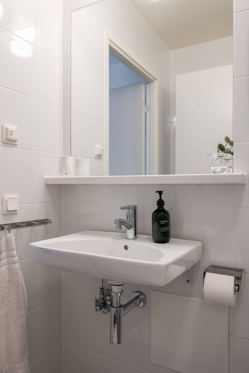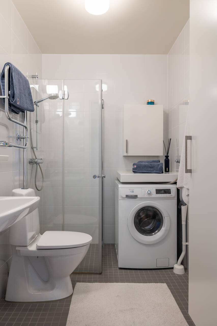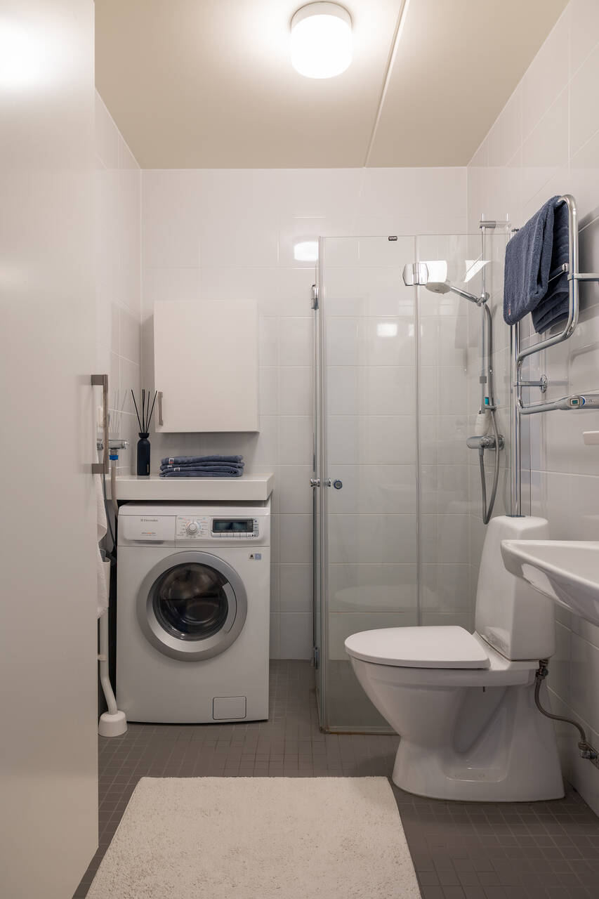 Helkaklat badrum med dusch, toalett, tvättmaskin (kombinerat tvätt och tork), golvvärme och uppvärmd handdukstork.