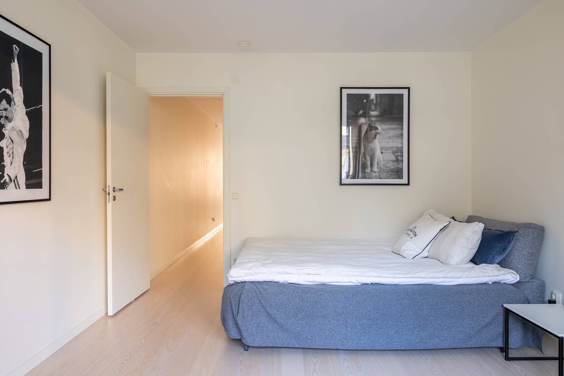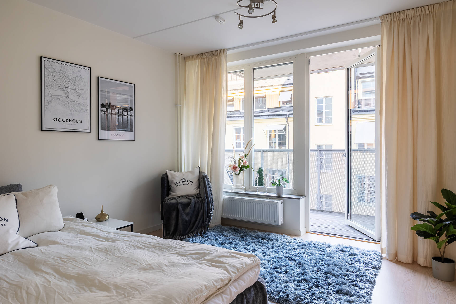 Bra sovrum med plats för dubbelsäng. Utgång till balkong mot gården.