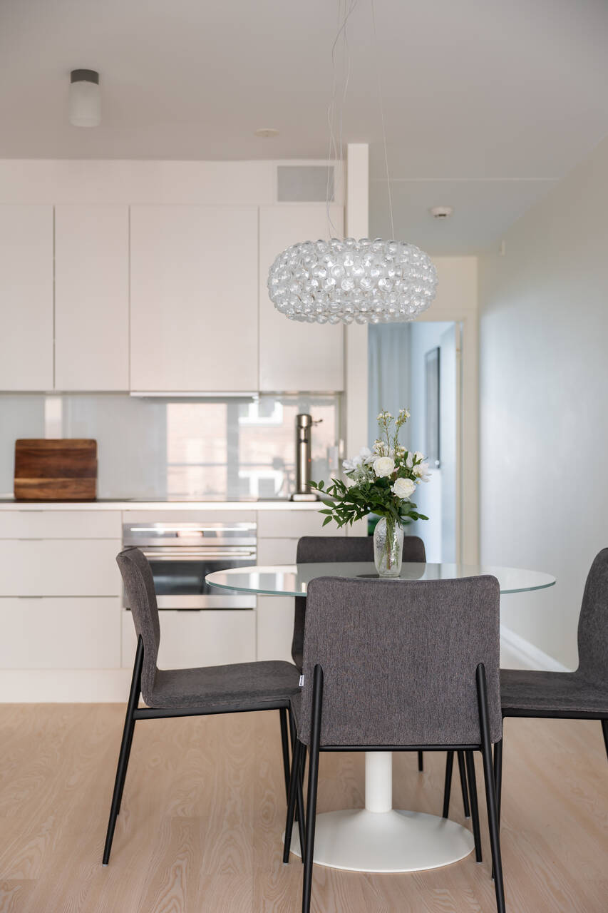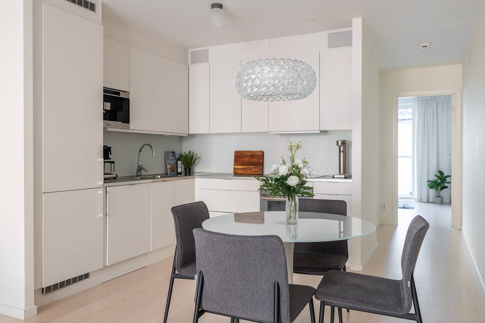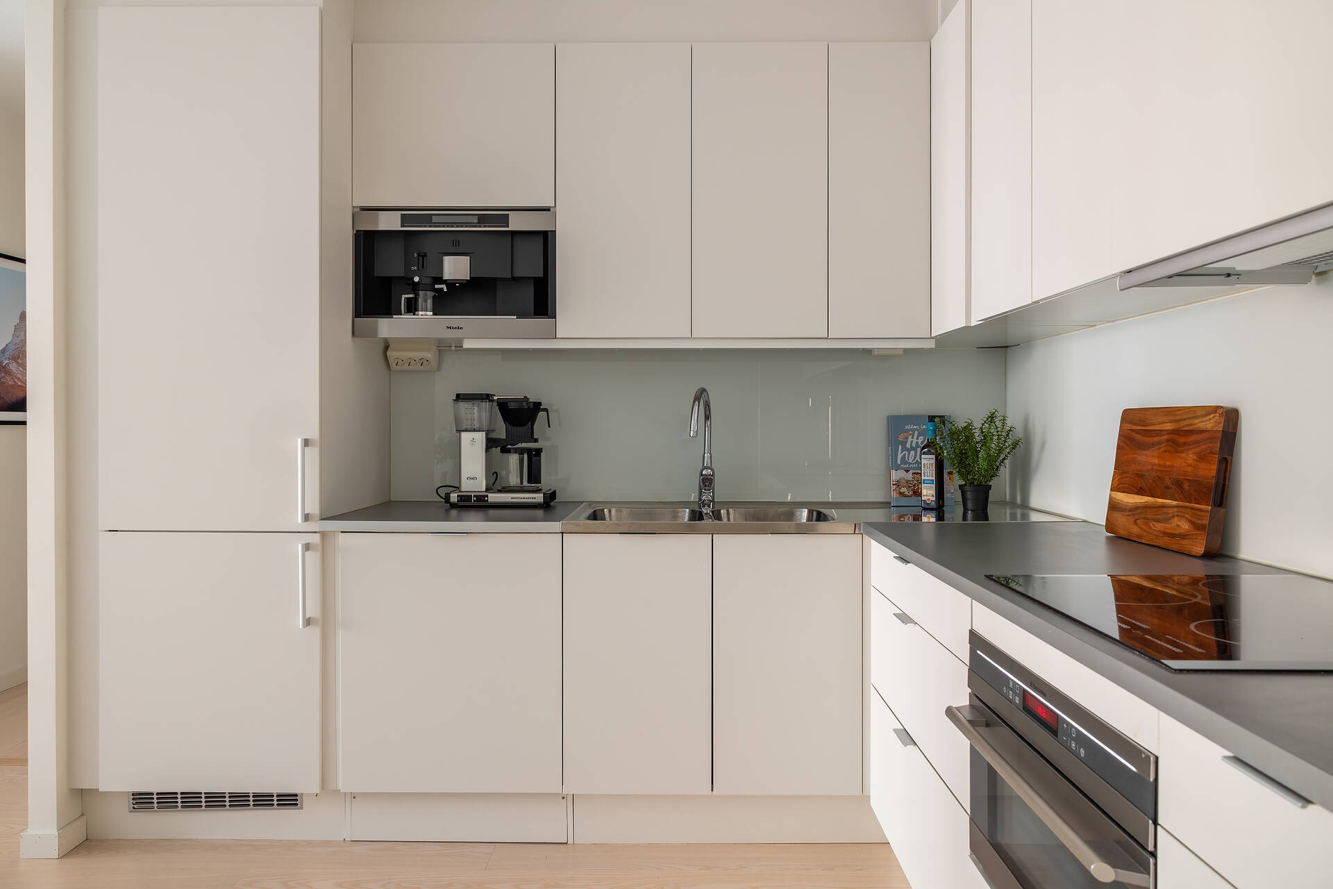 Fullt utrustat kök med gott om förvaring och arbetsytor. Vita köksluckor och ljus arbetsbänk. Induktionshäll, kyl/frys, kombinerad inbyggd varmluftsugn/micro, köksfläkt, inbyggd espressomaskin från Miele, inbyggd diskmaskin samt dubbel diskho.