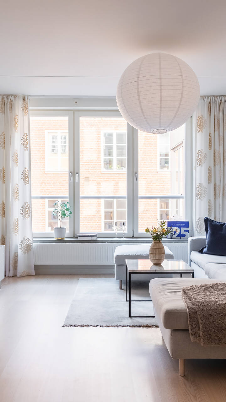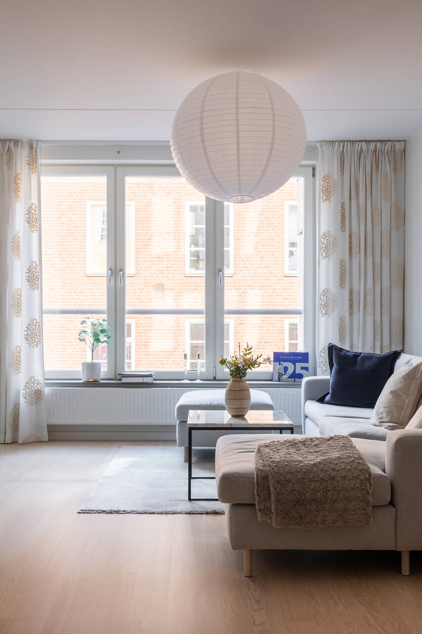 Rymligt sällskapsrum med plats för både soffa, soffbord och matplats. Generöst fönsterparti mot Lästmakargatan.