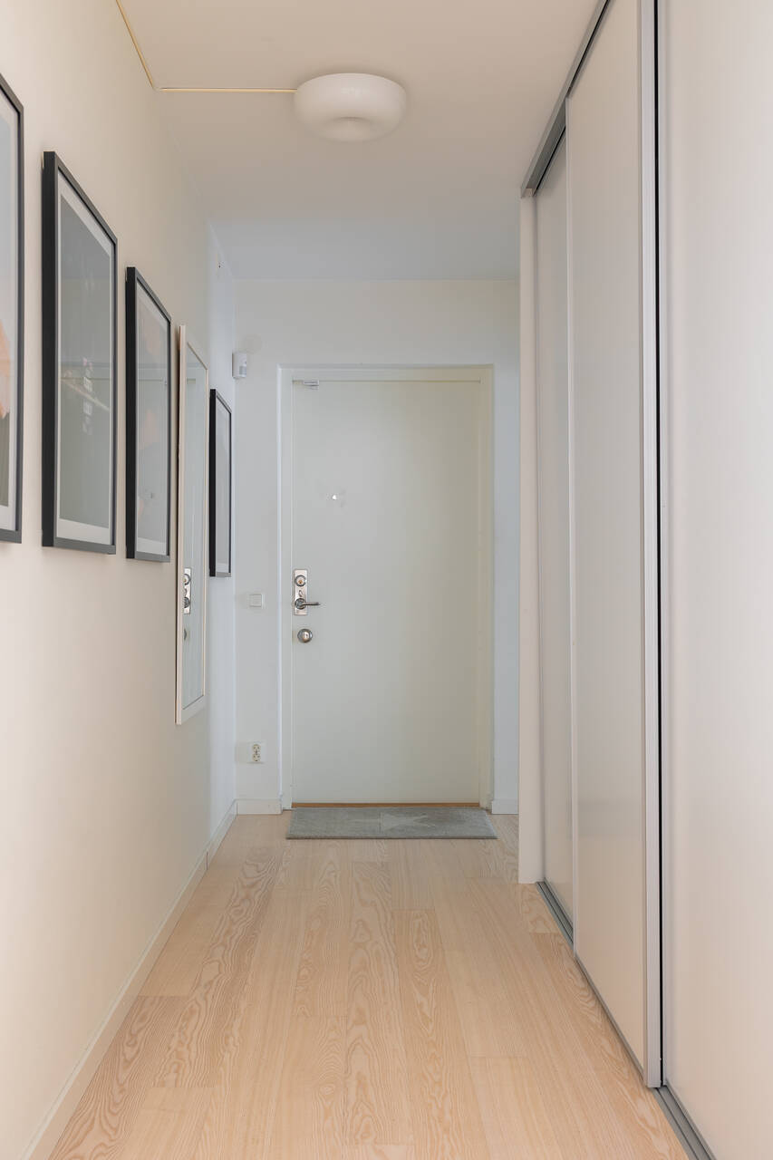 Inbjudande hall med generöst förvaring i garderob med skjutdörrar.